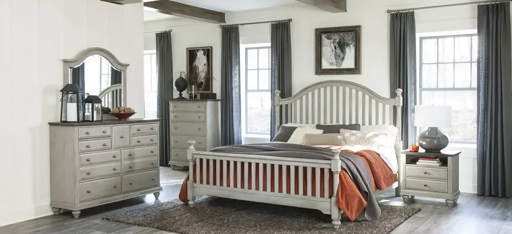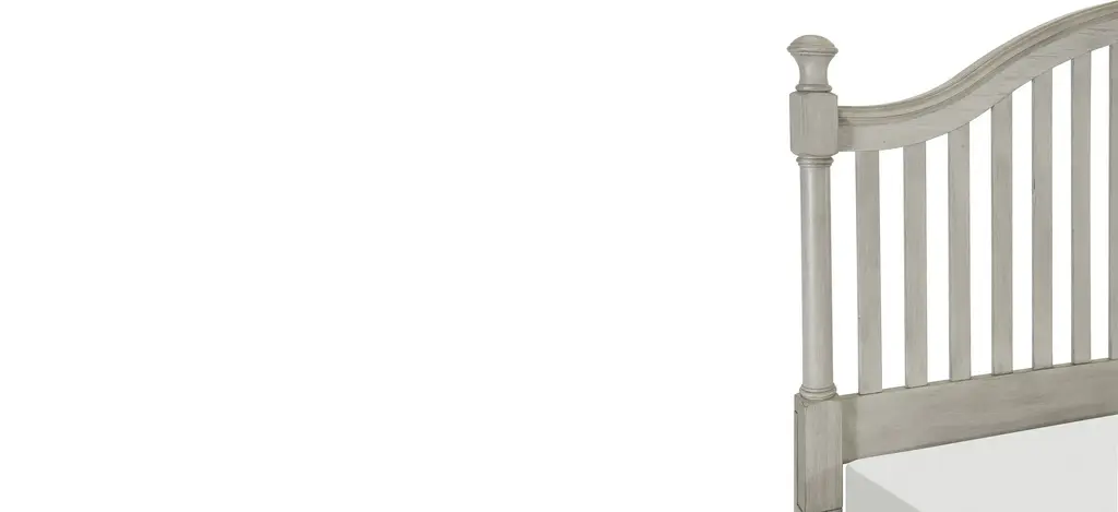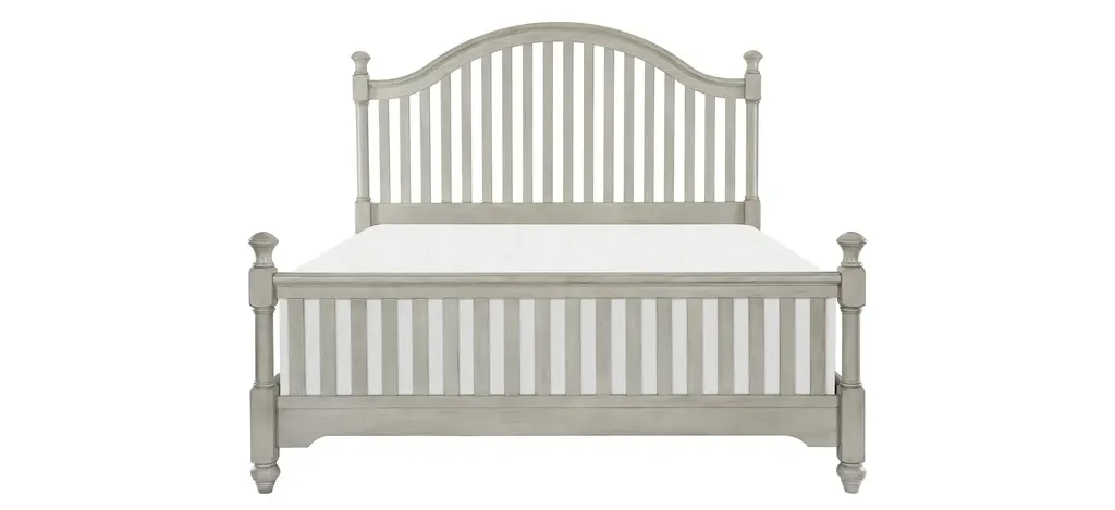 In nod to modern farmhouse design, the Cordelia eastern king bed features a classic profile that will be a perfect addition to your home's dcor. The pine solids and oak veneer of the collection feature a light gray finish, subtly highlighting the wood's grain. The vertical slats of the low-post bed lend classic styling to the collection, their heights following the curved profile of the headboard and footboard, each corner topped with a turned finial.