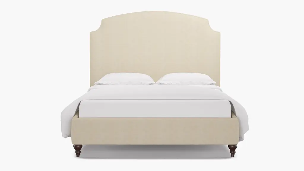 For a modern bed frame with subtle traditional charm, our upholstered Cove Bed checks every box. It features a curved silhouette and symmetrical cut-ins for visual interest. If you prefer a higher bed or additional support, our box spring beds require a standard box spring or foundation. Our platform beds are designed to support your mattress directly on the slats, making a box spring unnecessary. This setup offers a low-profile look and maintains the sleek, modern aesthetic. Customize in 30+ fabrics.