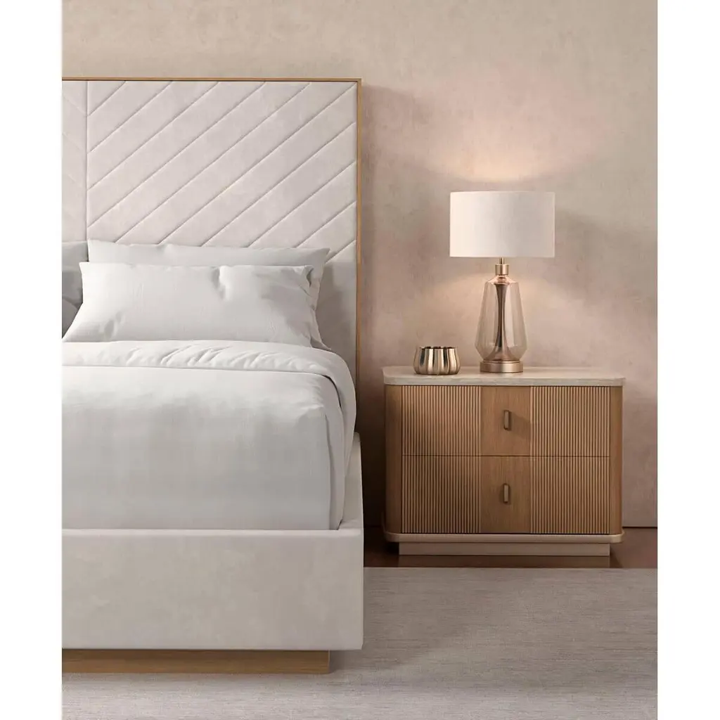 Upholstered king bed with an Ash Driftwood finish frame. It has a tall upholstered headboard with a modern channel tufting design of converging angles that meet in the center to create a mesmerizing chevron. This bed’s fully finished sides appear to float above the ground suspended by an exquisite wood base also wearing the easygoing elegance of Ash Driftwood.Dimensions:84.25" W x 87.25" D x 67.75" HConstruction:Mattress Opening: 78 x 82”Floor to top of slat: low setting 7.5” high setting 9.5” (Adjustable slat bearer)Plinth base height: 4”Floor to top of side rail 12.25”