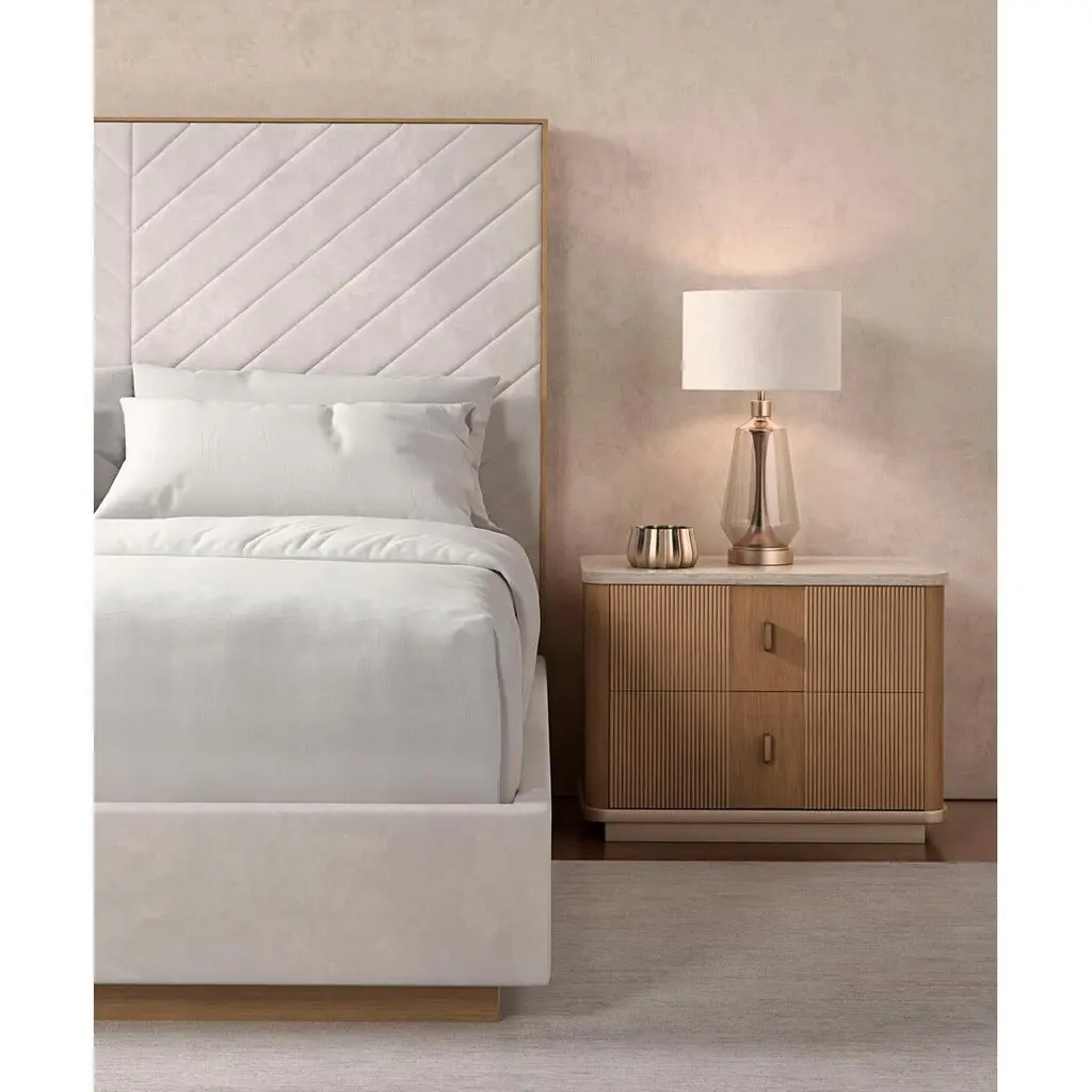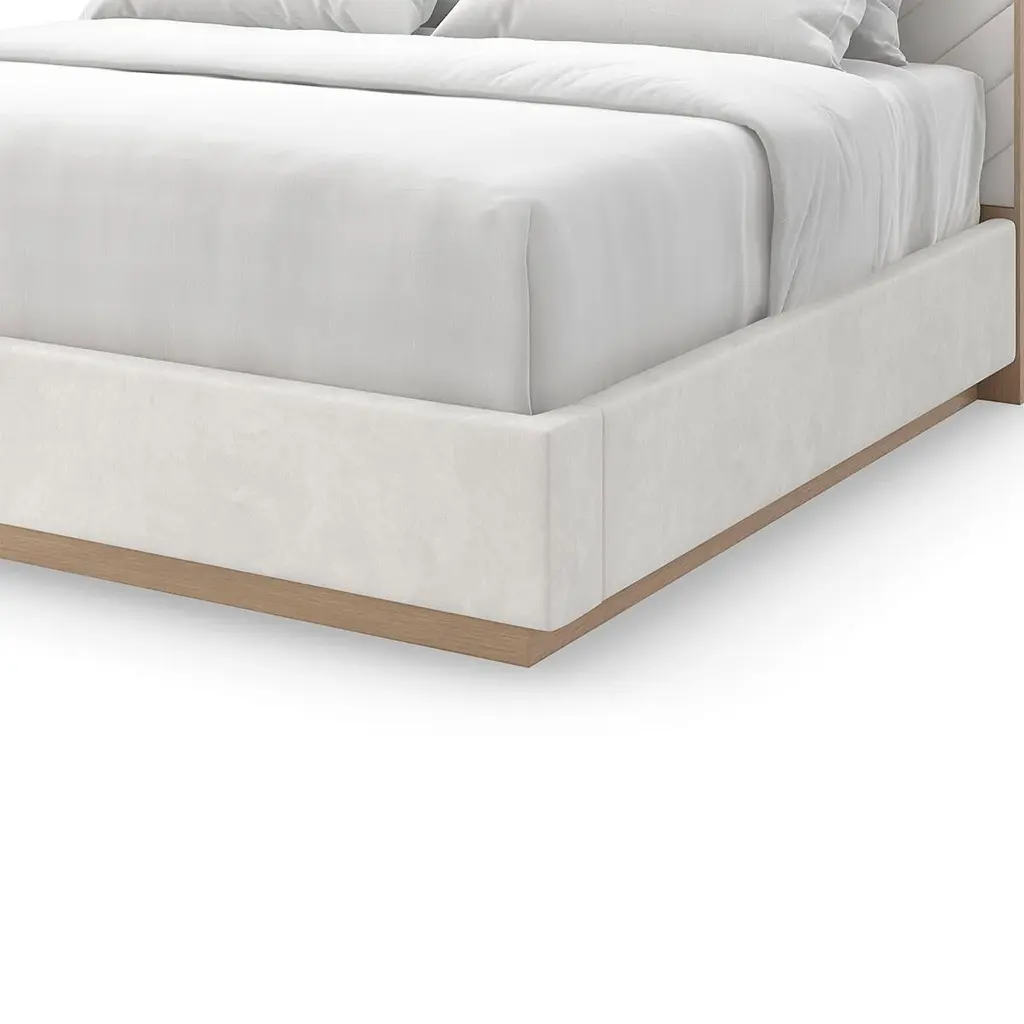 Queen Bed with an Ash Driftwood finish frame. It has a tall upholstered headboard with a modern channel tufting design of converging angles that meet in the center to create a mesmerizing chevron. This bed’s fully finished sides appear to float above the ground suspended by an exquisite wood base also wearing the easygoing elegance of Ash Driftwood.Dimensions: 68.5" W x 87.25" D x 68" HConstruction:Mattress Opening: 62 x 82”Floor to top of slat: low setting 7.5” high setting 9.5” (Adjustable slat bearer)Plinth base height: 4”Floor to top of side rail 12.25”2975-82CC-P Performance