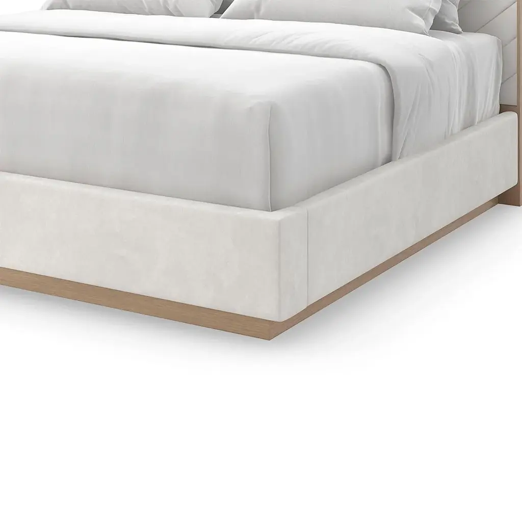 Queen Bed with an Ash Driftwood finish frame. It has a tall upholstered headboard with a modern channel tufting design of converging angles that meet in the center to create a mesmerizing chevron.This bed’s fully finished sides appear to float above the ground suspended by an exquisite wood base also wearing the easygoing elegance of Ash Driftwood. Dimensions: 68.5" W x 87.25" D x 68" H Construction: Mattress Opening: 62 x 82” Floor to top of slat: low setting 7.5” high setting 9.5” (Adjustable slat bearer) Plinth base height: 4” Floor to top of side rail 12.25” 2975-82CC-P Performance