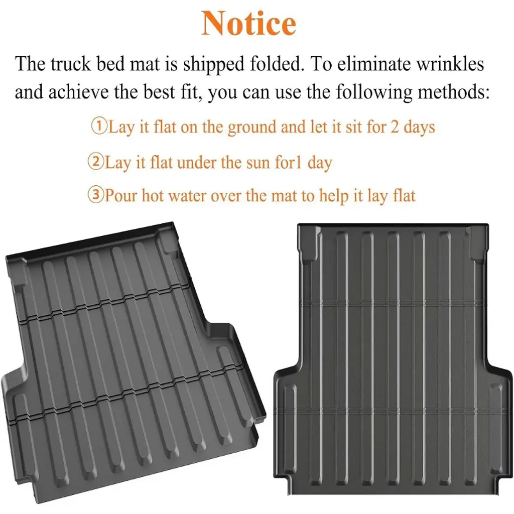hield your car's bed with precision-engineered defense built for real-world demands. Designed exclusively for 2004-2014 5.5FT models, this mat locks into place with laser-scanned accuracy—no gaps, no slipping, just total coverage that stays put whether you’re acrossing town or bouncing down backcountry trails. Picture your toughest days: gravel flying at highway speeds, muddy gear after job sites, or scorching sun beating down on tools. Our industrial TPE construction handles punctures, UV rays, and temperature extremes from freezing winters to scorching summers. That toolbox bouncing around? The textured surface grips equipment firmly, preventing sudden shifts during abrupt stops. Forget complicated setups—just unfold and drop it in. When rain soaks it or spilled supplies leave residue, pull it out: hosedown cleanup takes minutes, and the material dries faster than traditional rubber. Notice shipping creases? Lay it flat in daylight or pour warm water over lines—it smooths out quickly, ready for action. This isn’t just another accessory; it’s a silent partner preserving your truck’s value. Stop worrying about scratched beds or dented surfaces. Tackle workdays, adventures, and everything between—knowing your F150’s foundation stays protected, season after season.