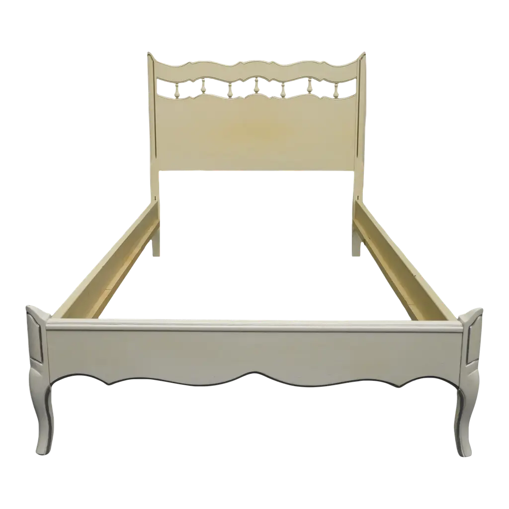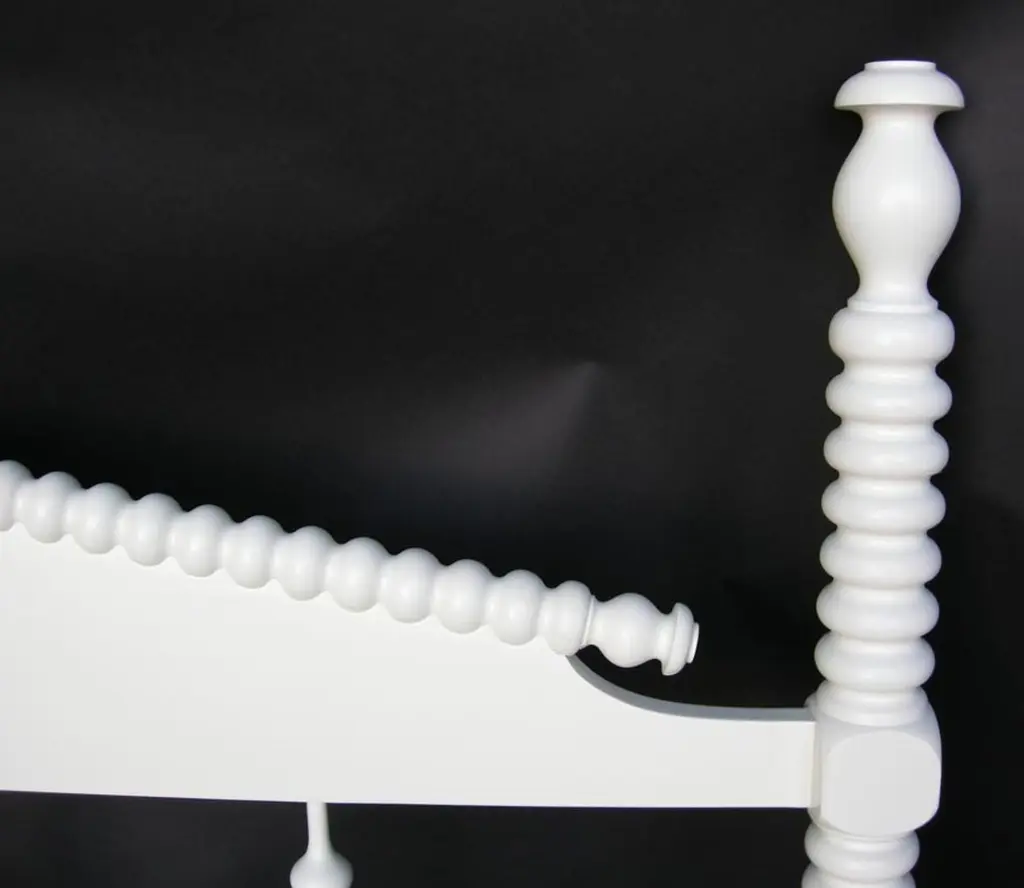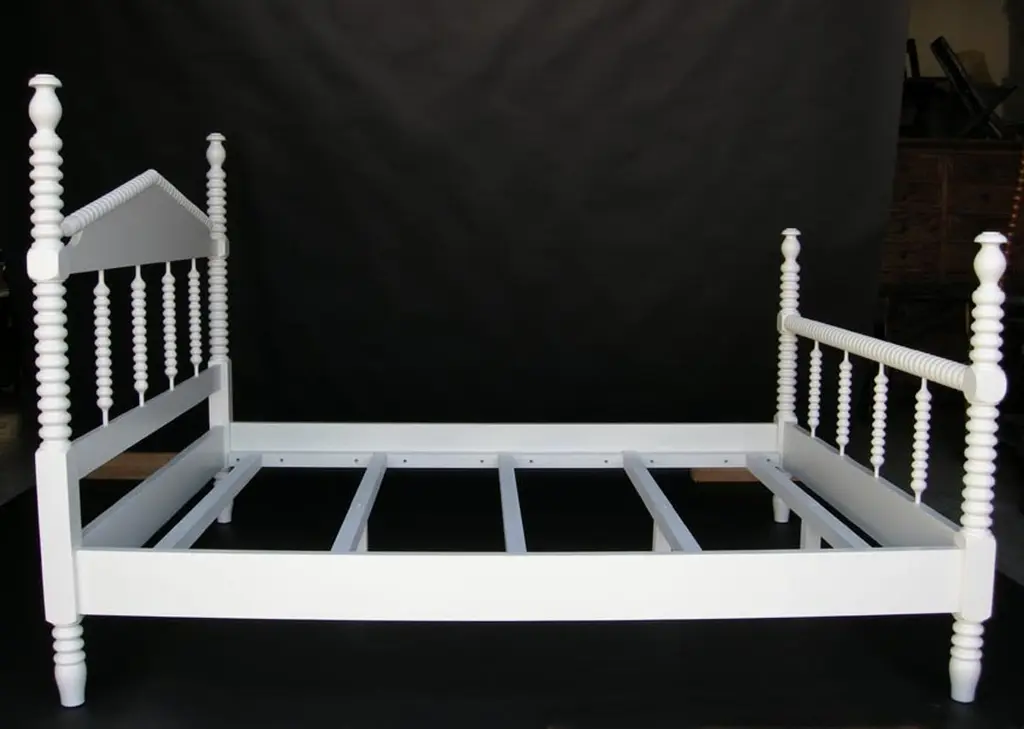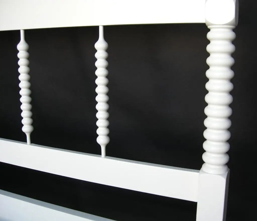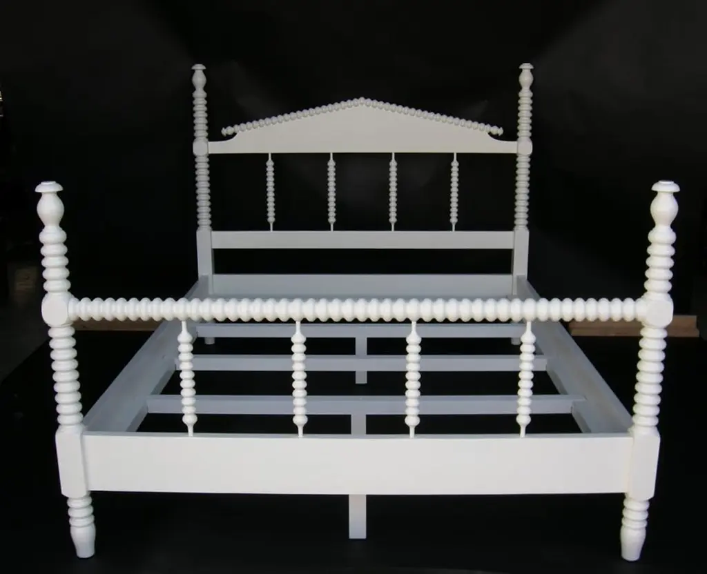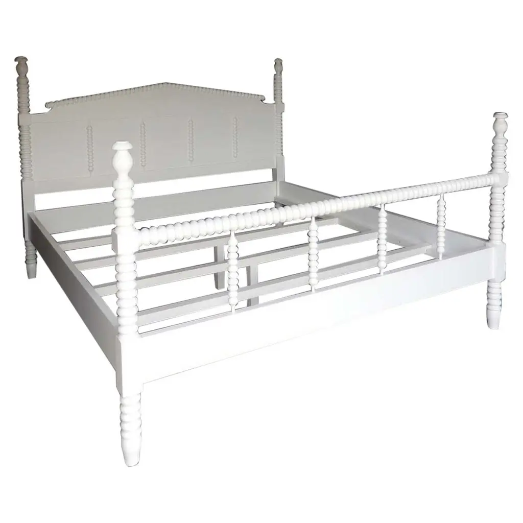 Custom Bobbin spindle bed, queen-size with white painted finish. Custom finish. Can be made in any size with some design variations, in wooden or painted finishes. Made by Dos Gallos Studio in Los Angeles. CUSTOM PRICES ARE SUBJECT TO CHANGE DUE TO FLUCTUATING WOOD AND LABOR PRICES. PLEASE INQUIRE BEFORE PLACING AN ORDER. CUSTOM ORDERS ARE NON RETURNABLE. FINAL SALE
