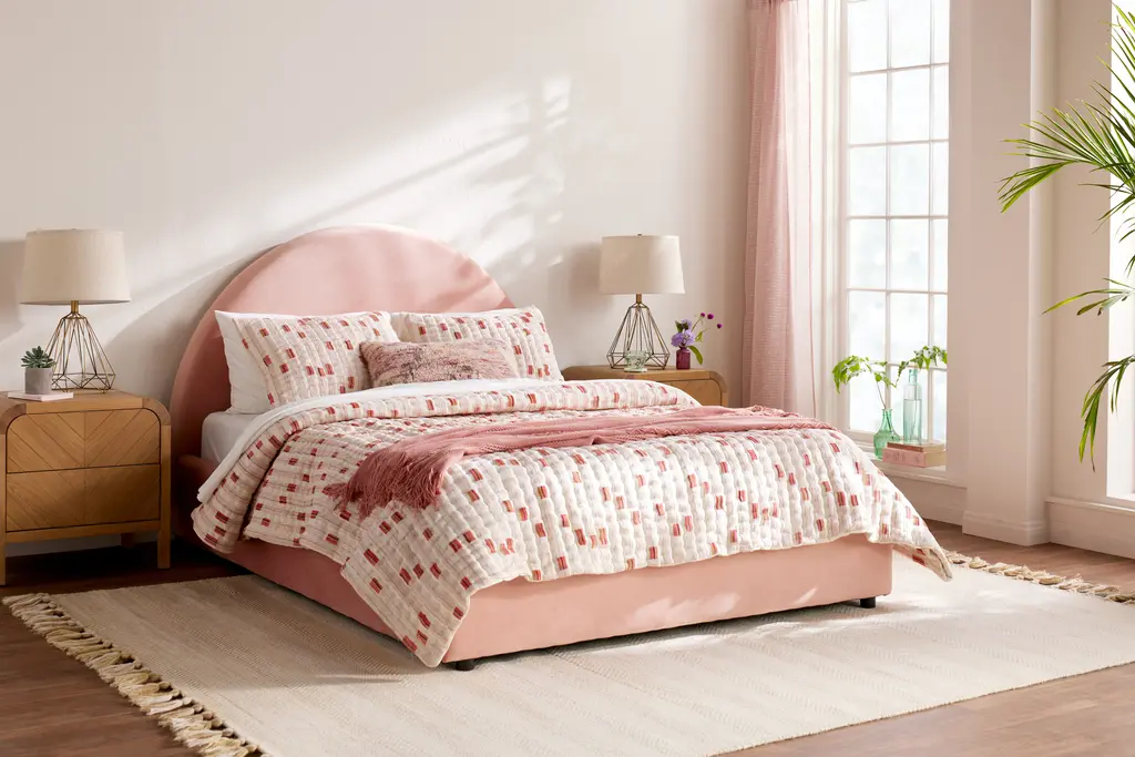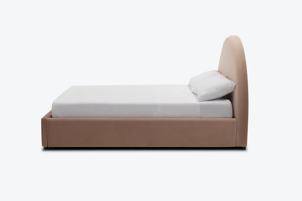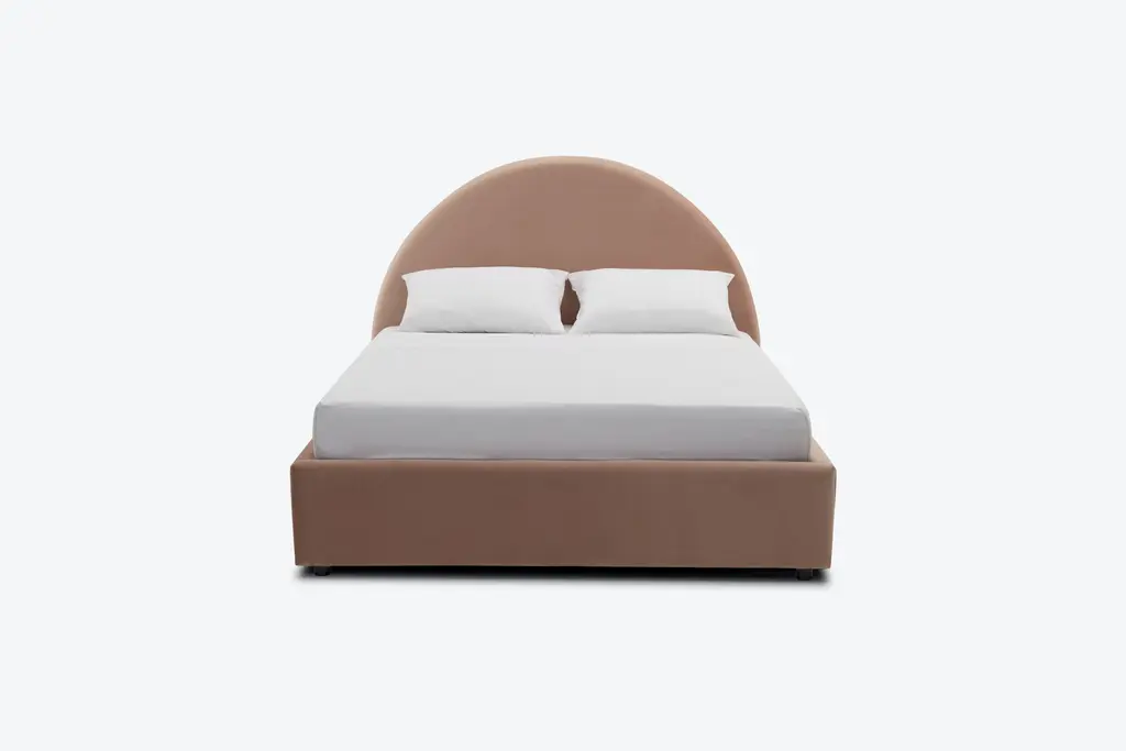 Waking up never looked so good! The Dania Bed boasts a low, wraparound upholstered frame with a show stopping semi-circle headboard.Made to order in your choice of our plethora of fabrics, the Dania brings modern style straight into the bedroom. Its concealed peg legs and low frame adds to the cozy vibes while the large circular headboard makes for the perfect place to lean up against with a good read.Details and product care +DimensionsMeasure for deliveryOverall61"w x 82"d x 50.5"hFull Frame61" x 82" x 50.5"Queen Frame67" x 88" x 50.5"Cal King Frame79" x 92.5" x 50.5"Eastern King Frame82" x 88.5" x 50.5"MattressPlatform bed intended for use with mattress onlyFull Mattress54" x 74"Queen Mattress60" x 80"Cal King Mattress72" x 84"Eastern King Mattress76" x 80"Leg1.5"h