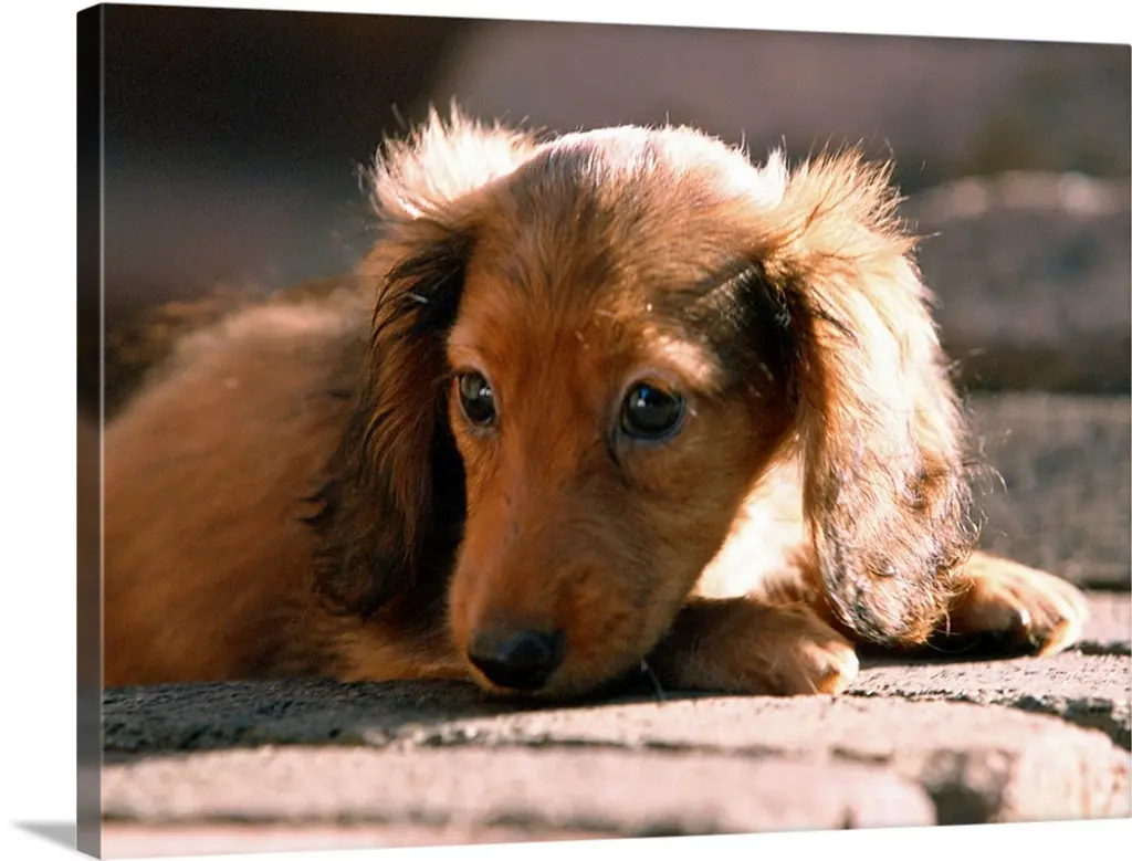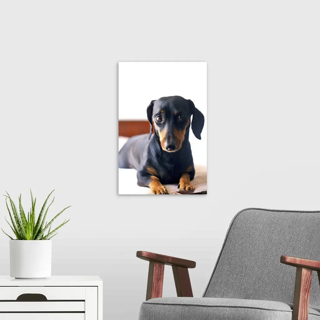 Dashshund lying on a bed wall art for home and office decor. Discover canvas art prints, photos, mural, big canvas art and framed wall art in GreatBigCanvas.com's varied collections.