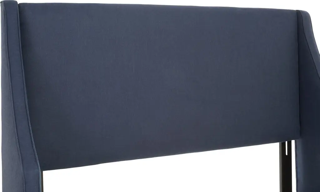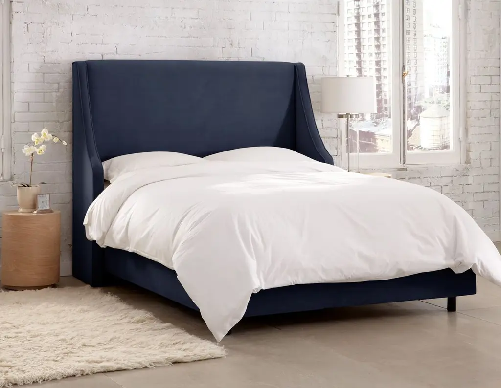 This bed is crafted of pine with a swooping, wingback-style headboard and sumptuous velvet upholstery in a rich navy hue. Generous padding ensures long-lasting comfort and support while sitting up to read or watch TV. Mattress and box spring required. Handcrafted in the USA.