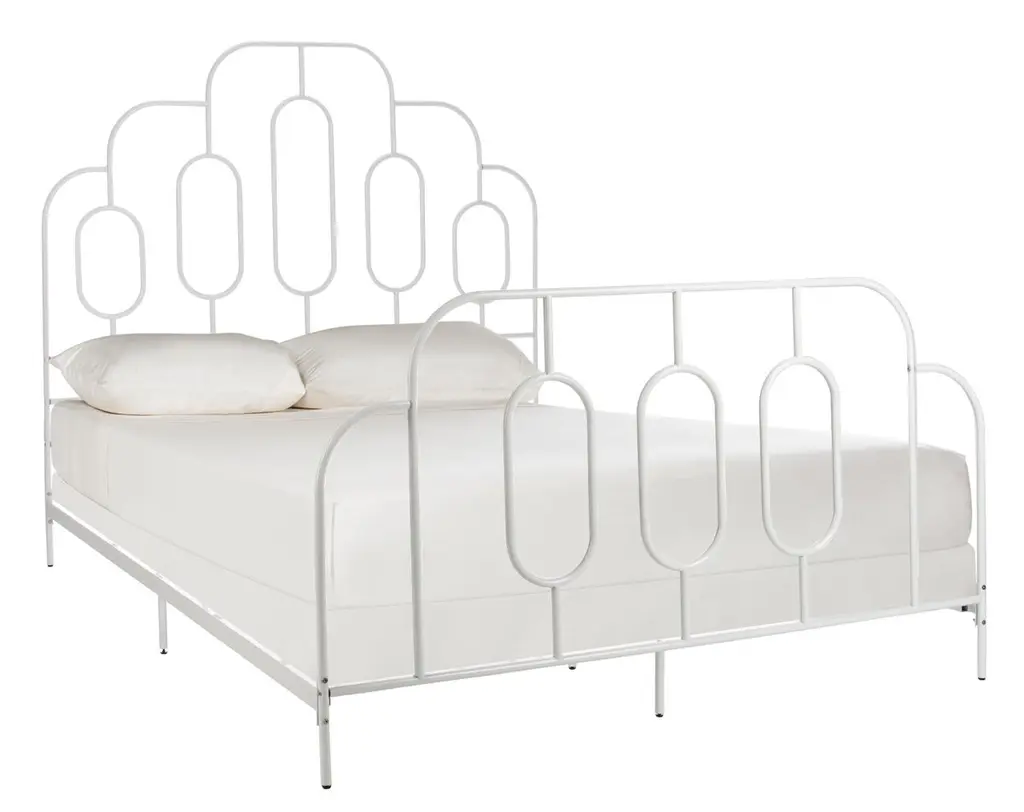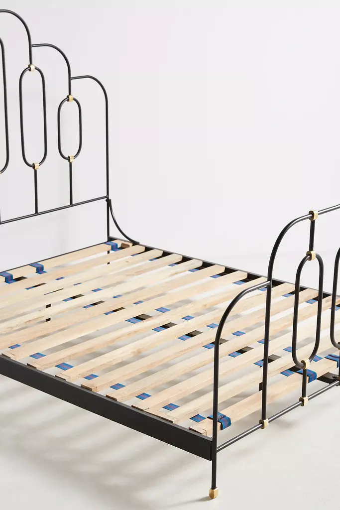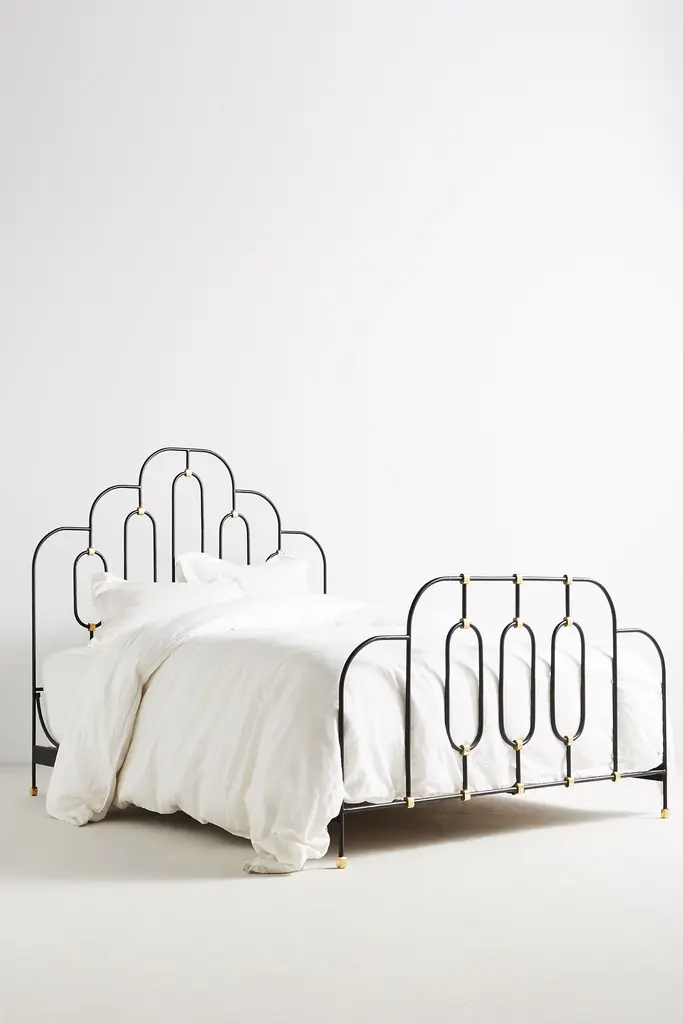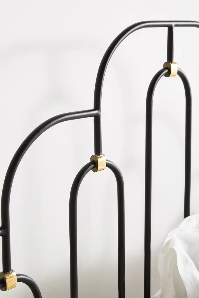With a curved silhouette and Art Deco-inspired motifs in its iron frame, this artistically designed bed is the perfect spot to display layered quilts, blankets, and comfy bedding. For ordering assistance and more, please contact us. For aesthetic advice and tips to help decorate your space, enjoy our complimentary home styling services.