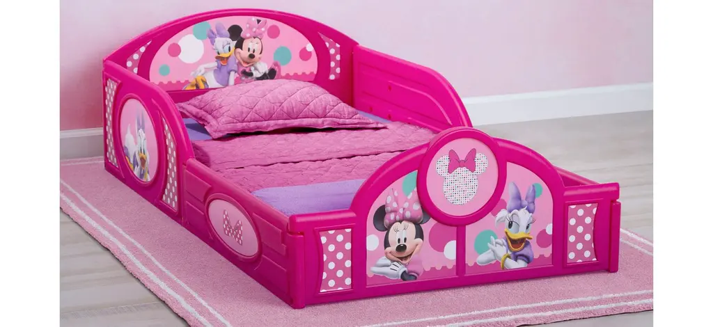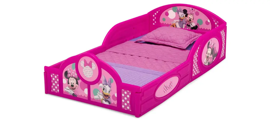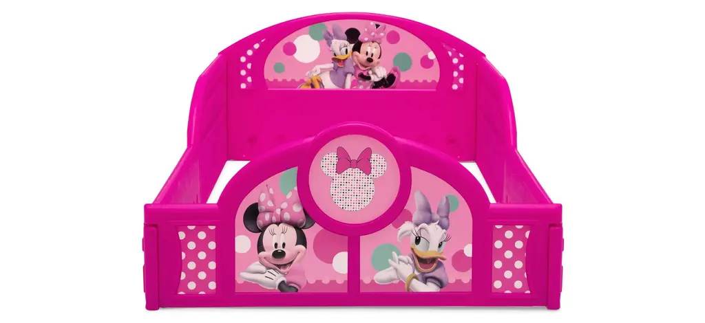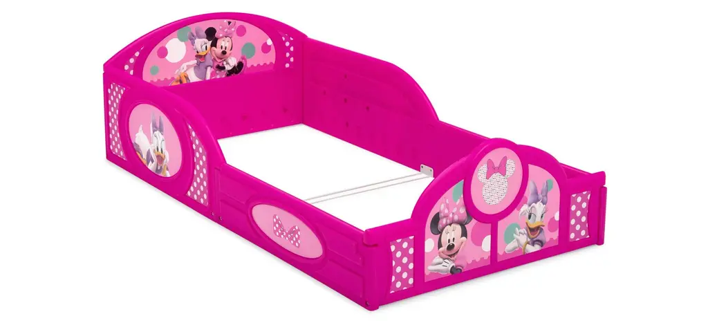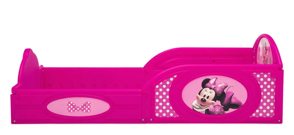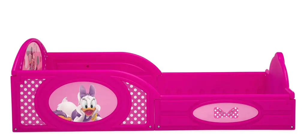 Transition their space from a nursery to a toddler room with the perfectly sized Minnie Mouse Sleep and Play Toddler Bed by Delta Children. Featuring three-dimensional silhouettes of Minnie Mouse with colorful decals of Minnie, Daisy Duck, Figaro and Bella, this sturdy toddler bed creates a comforting environment that promotes a sound sleep. The attached guardrails will ensure your little one is safe and secure throughout the night. A low mattress height makes it easy for kids to enter and exit on their own, reinforcing their big-kid independence.