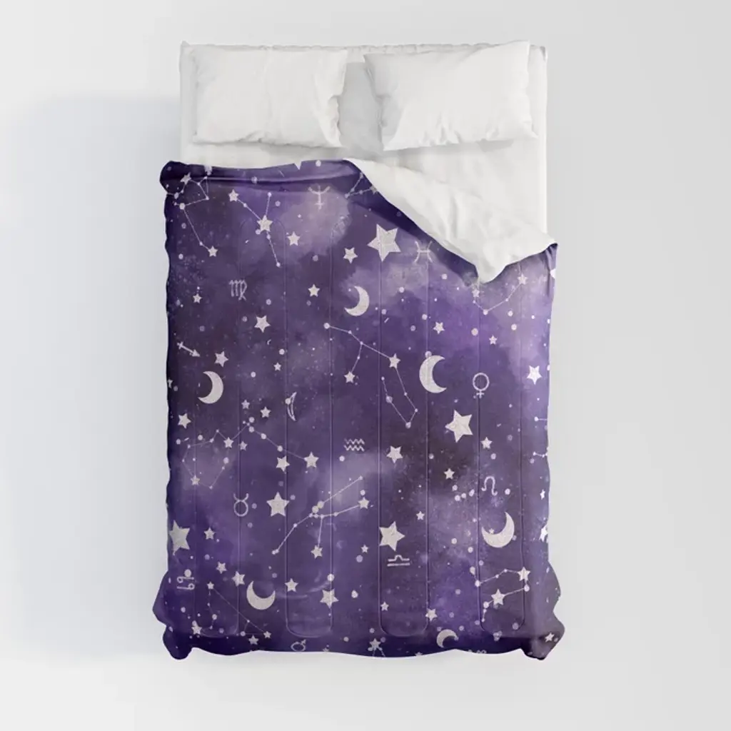 This is a sign to charm your little one's room with the Dream Factory Zodiac bed in a bag. The navy-blue bedding set includes all the coordinating pieces you need for an out-of-this-world look. The face of this comforter has all the stars aligned with constellations printed all over, reversing to an abundance of stars. The white sheets and pillowcase have blue stars printed throughout. Your child's sleep space will have mesmerizing style and dreamy comfort in one easy update. Made with microfiber for a soft, breathable feel to send your little one to a dream world every night. All components are machine wash safe.