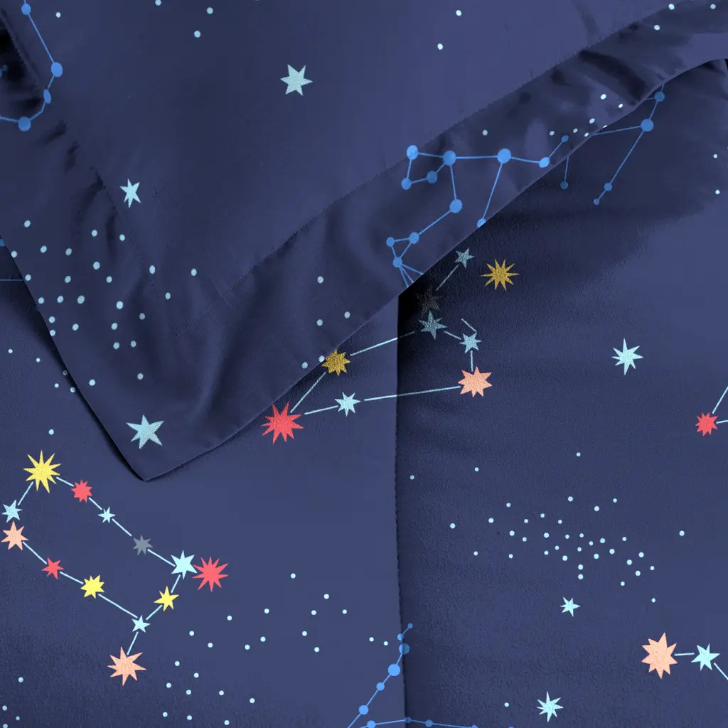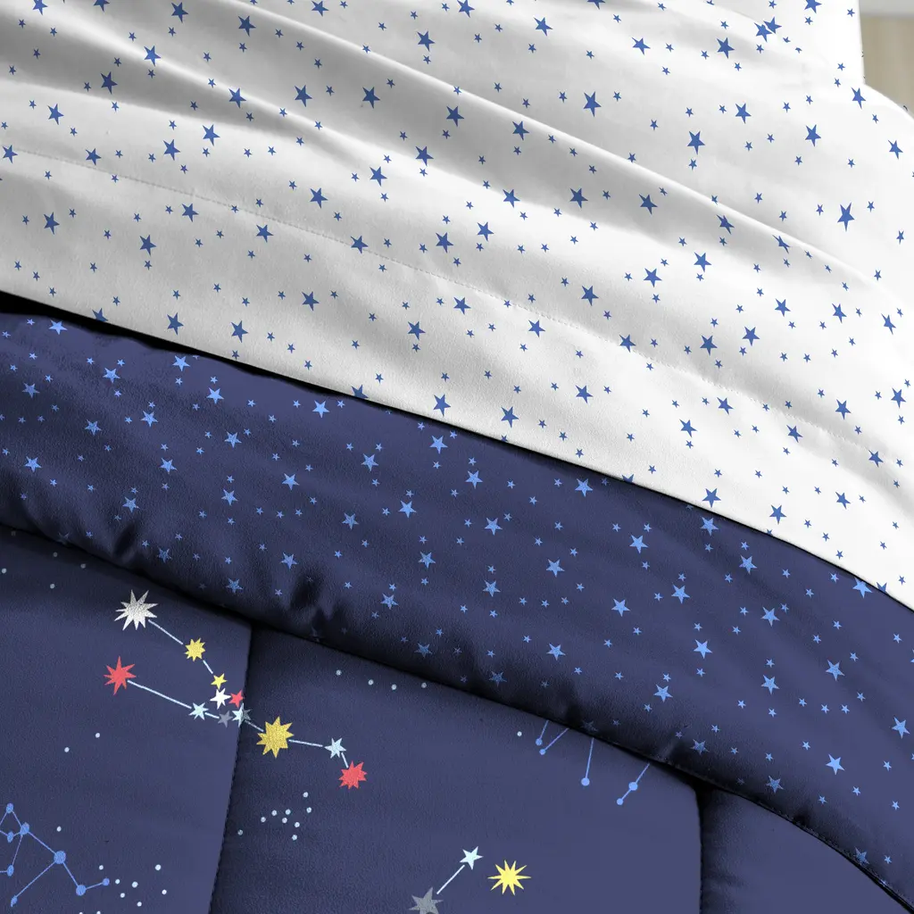 This is a sign to charm your little one's room with the Dream Factory Zodiac bed in a bag. The navy-blue bedding set includes all the coordinating pieces you need for an out-of-this-world look. The face of this comforter has all the stars aligned with constellations printed all over, reversing to an abundance of stars. The white sheets and pillowcase have blue stars printed throughout. Your child's sleep space will have mesmerizing style and dreamy comfort in one easy update. Made with microfiber for a soft, breathable feel to send your little one to a dream world every night. All components are machine wash safe.