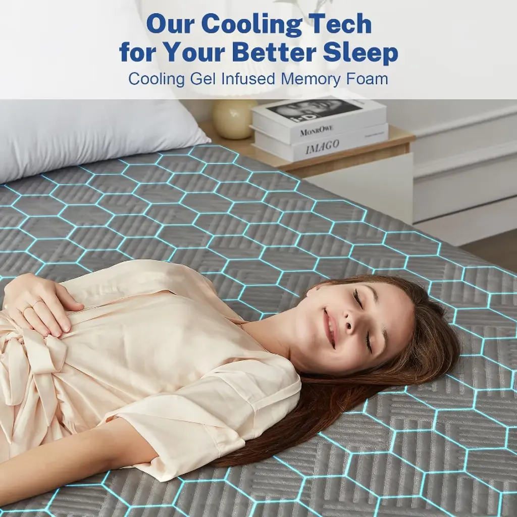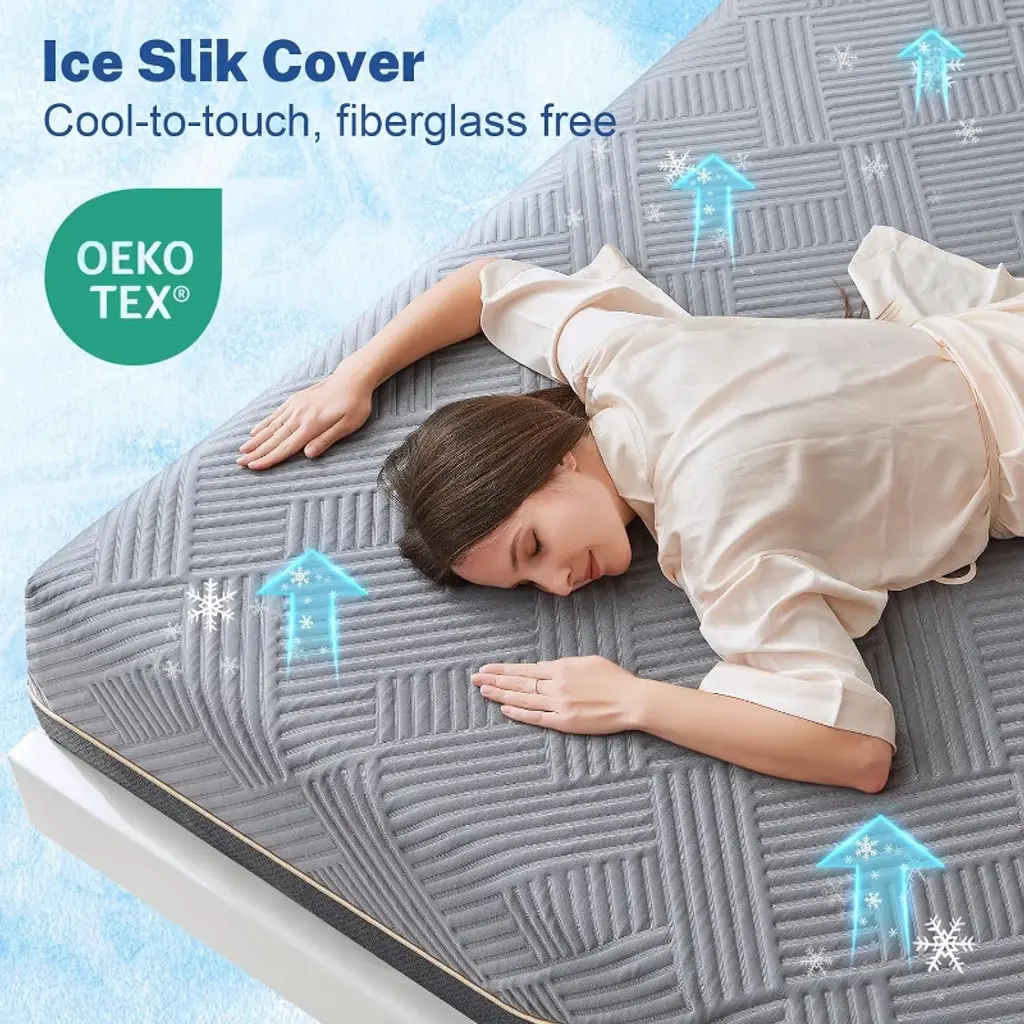1. Dual - Firmness Flip Design for Customizable Comfort Easily switch between firm and extra firm support by flipping the mattress, ideal for couples or changing sleep preferences without replacing the bed. 2. USA - Made & CertiPUR - US/Oeko - Tex Certified Safe Crafted in the USA with fiberglass - free, chemical - free materials (CertiPUR - US foam & Oeko - Tex cover), ensuring safety for families, pregnant women, and babies. 3. 5 - Layer Ultra Cooling System for Nighttime Comfort Features a cool - touch ice silk cover, green tea memory foam, and gel - infused layers to regulate temperature and prevent overheating, perfect for hot sleepers. 4. Pressure - Relieving Support for All Sleep Styles Slow - rebound memory foam conforms to your body, relieving back pain and providing spinal alignment for side, back, and stomach sleepers. 5. Removable Washable Cover & Versatile Compatibility Stylish black/grey zippered cover is machine - washable and pet - friendly, fitting adjustable frames, platforms, or floors for easy setup in any space.