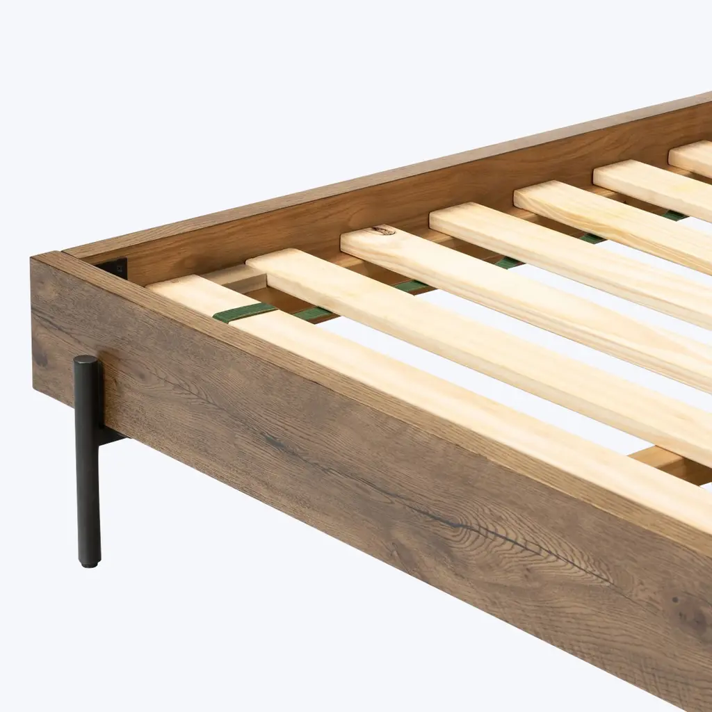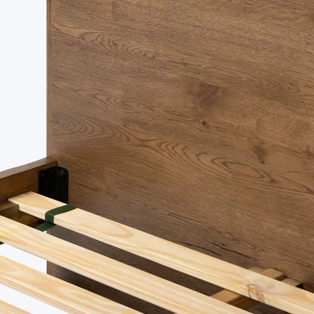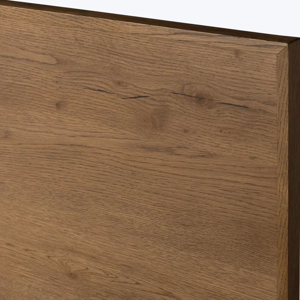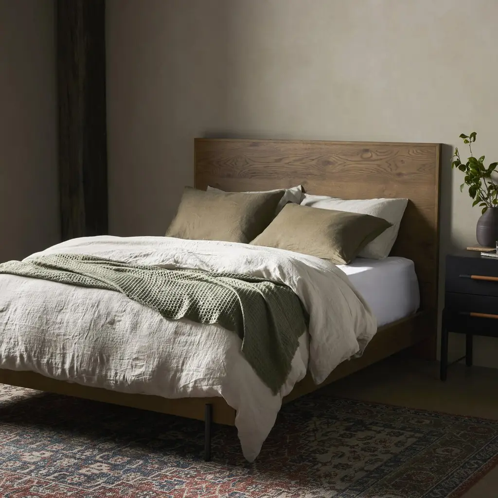 Bring an organic feel to the bedroom with the Eaton Bed by Four Hands. Crafted in thick oak veneer, the Eaton Bed is outfitted with slim iron legs for industrial contrast. The oak’s natural cracks are filled in with black resin, enhancing the richness of this high-quality bed. Available in Queen and King.