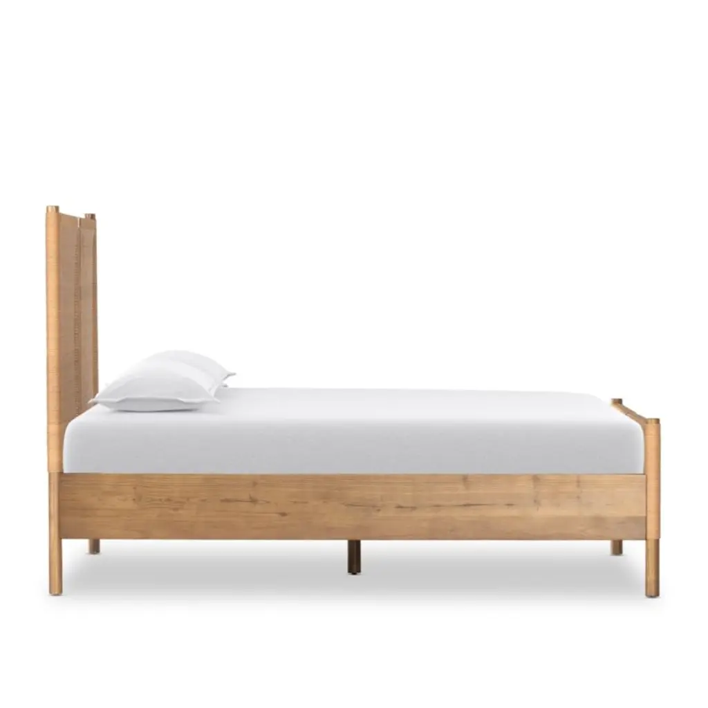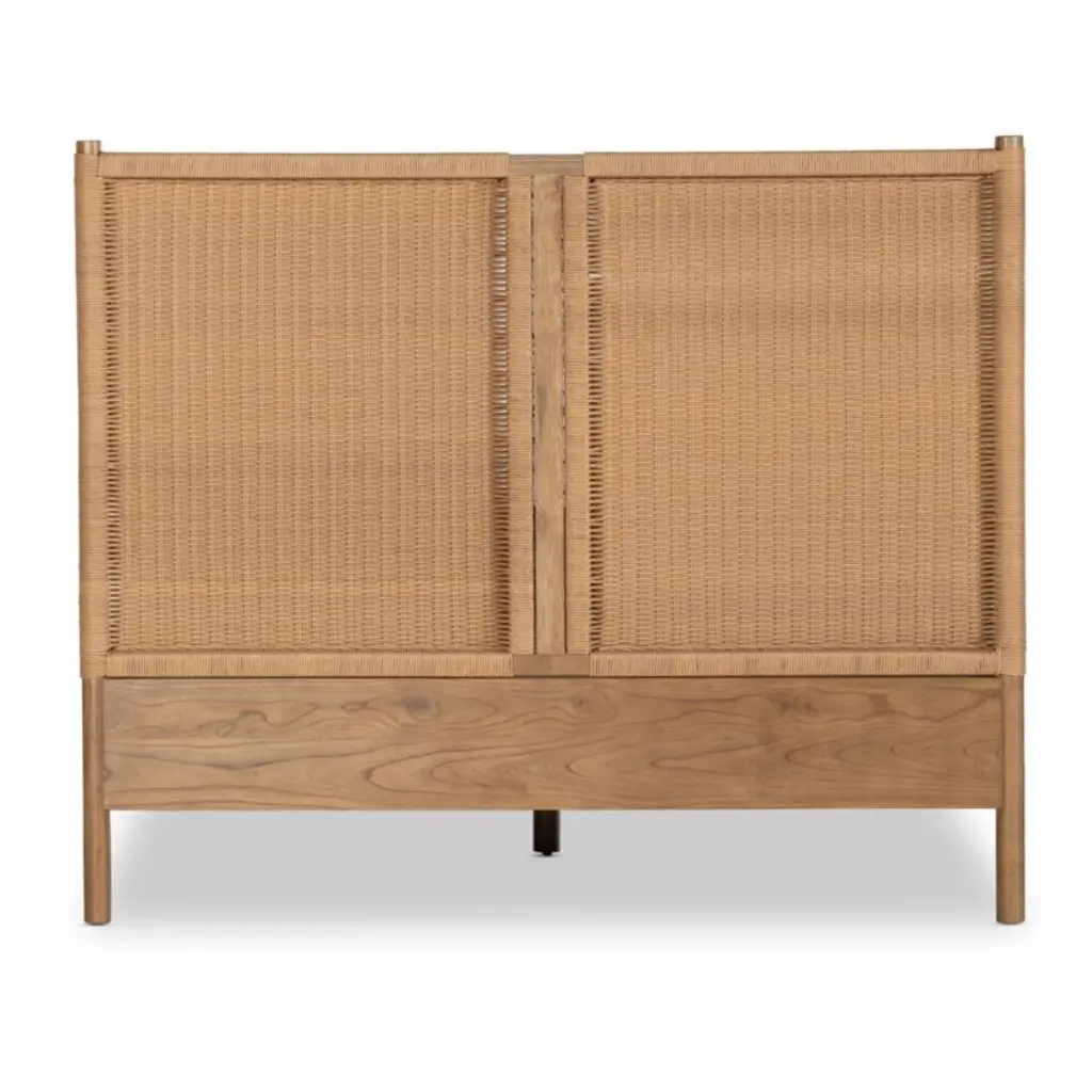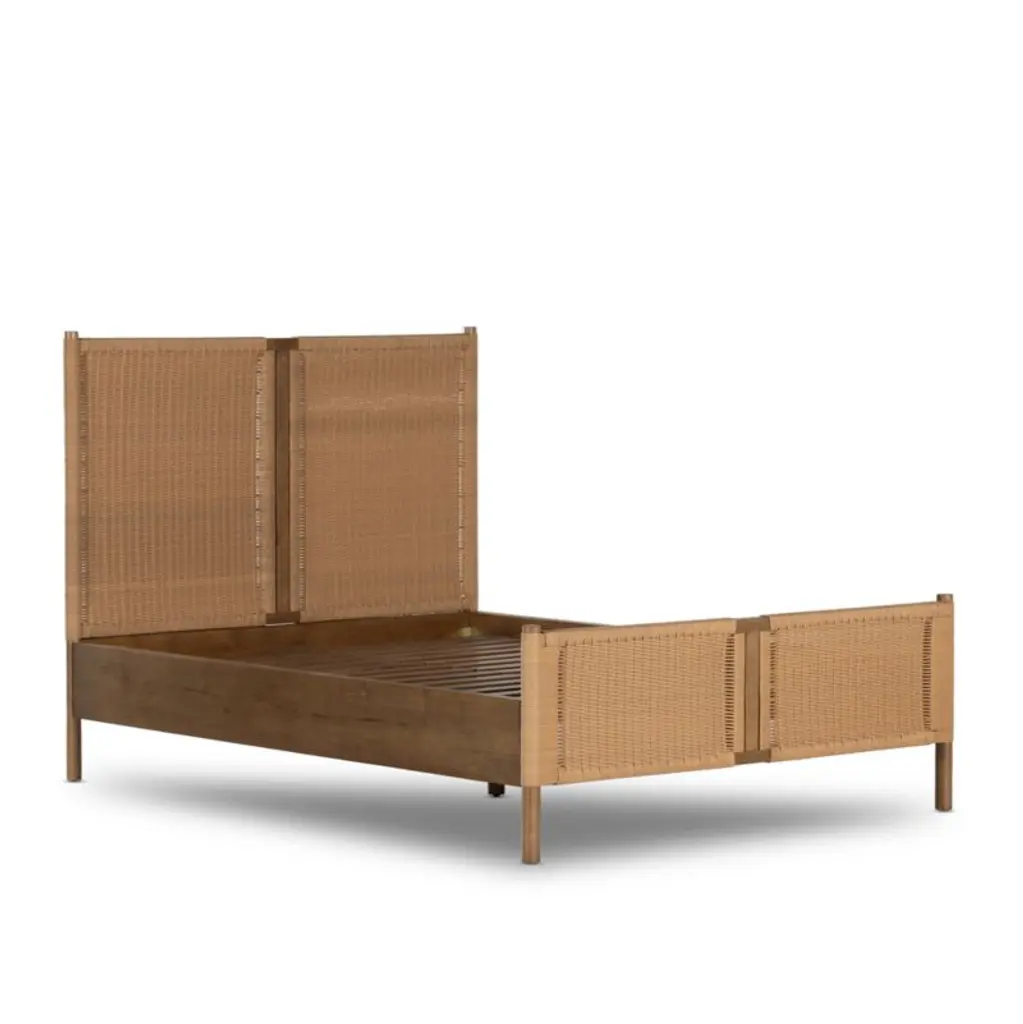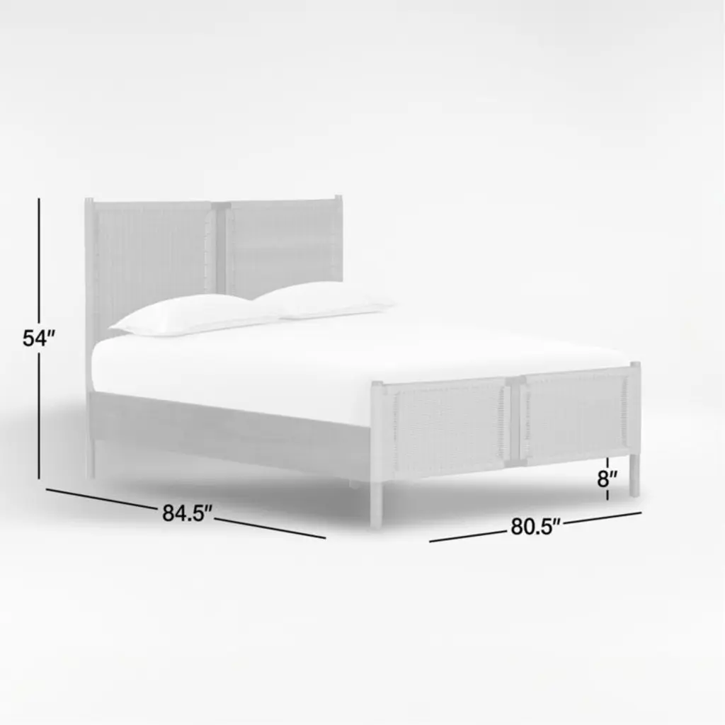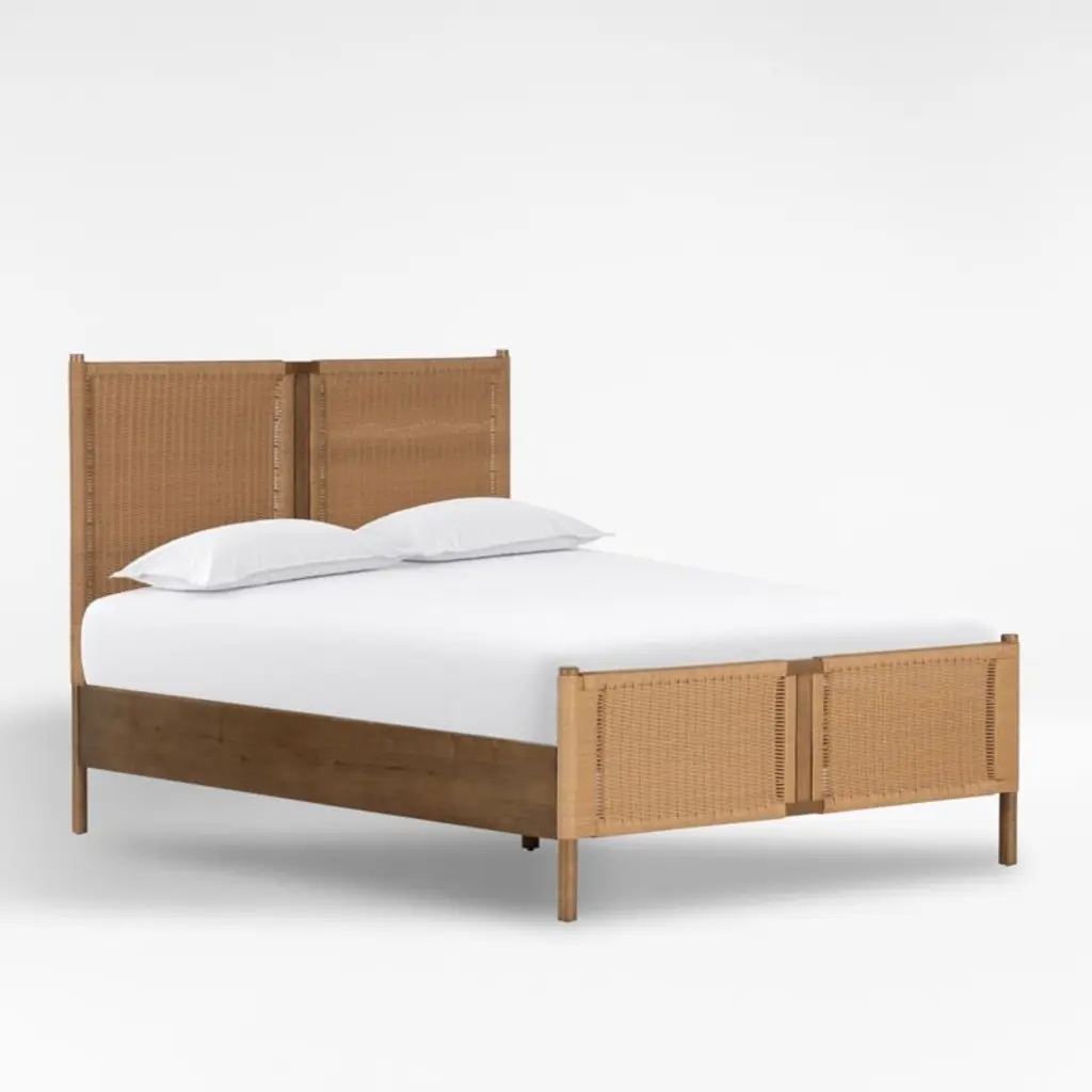 A mix of materials and expert workmanship craft our stunning Eliza bed. Finished with a toasted stain, solid sungkai wood structures the clean-lined bed with plank side rails to show off the grain. Open paned head- and footboards provide frames to anchor panels of handwoven synthetic wicker. Exposed warp threads and tight wrapping around the legs and center supports enhance the loomed look with even more linear interest. The Eliza wicker and wood bed is a Crate & Barrel exclusive.