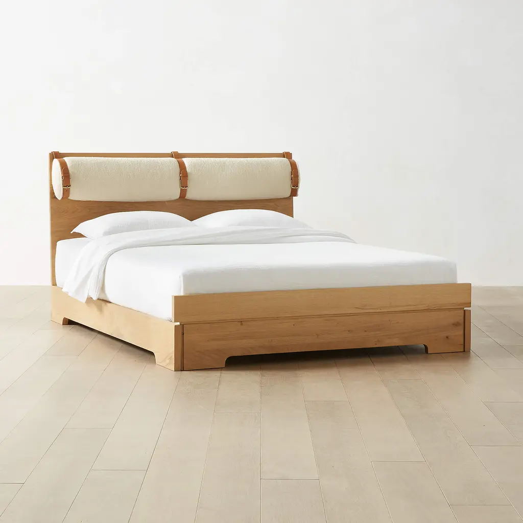 Exacting execution honors the handcrafted nature of California design duo Lawson-Fenning's bed design. Solid white oak headboard and footboard, certified sustainable by the Forest Stewardship Council ®, has a Craftsman-inspired cutout at the footboard. Headboard bolster, upholstered in ivory wool bouclé, is held in place by three removable saddle-leather straps with antiqued brass buckles—an accent both functional and decorative. CB2 exclusive.