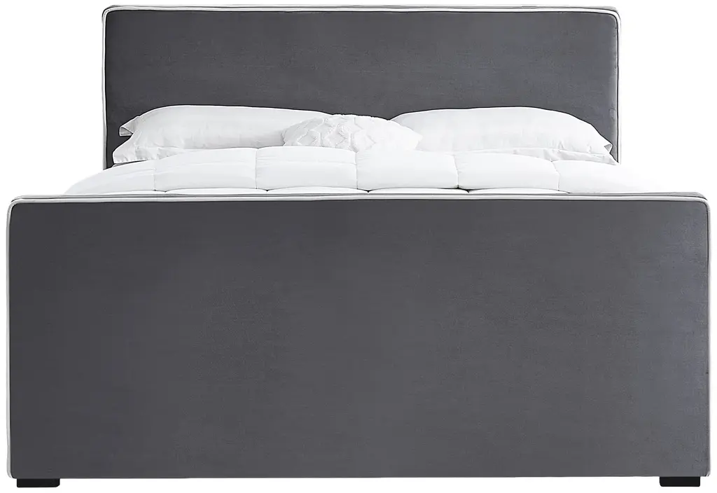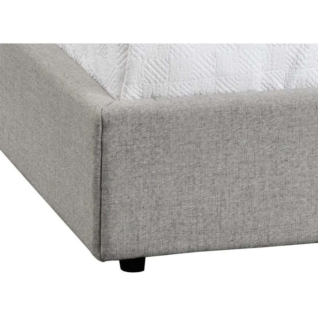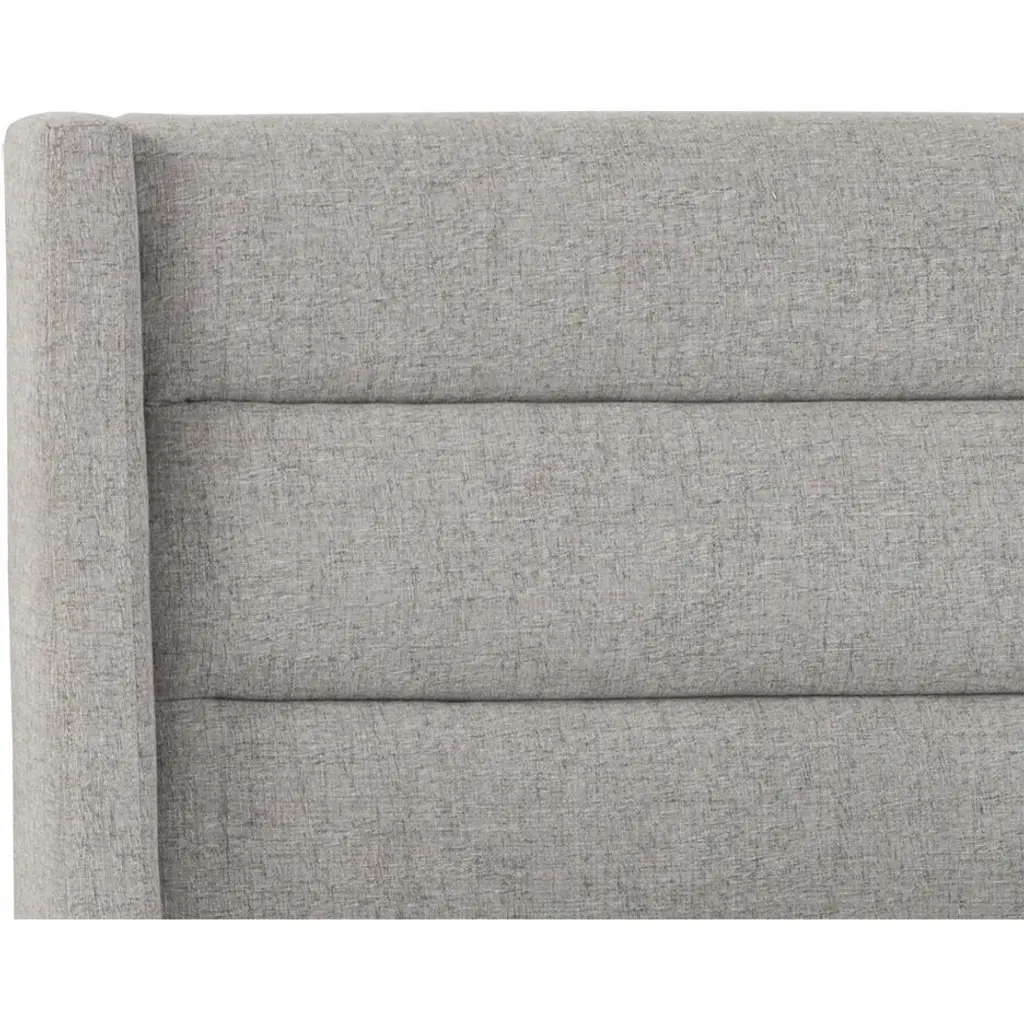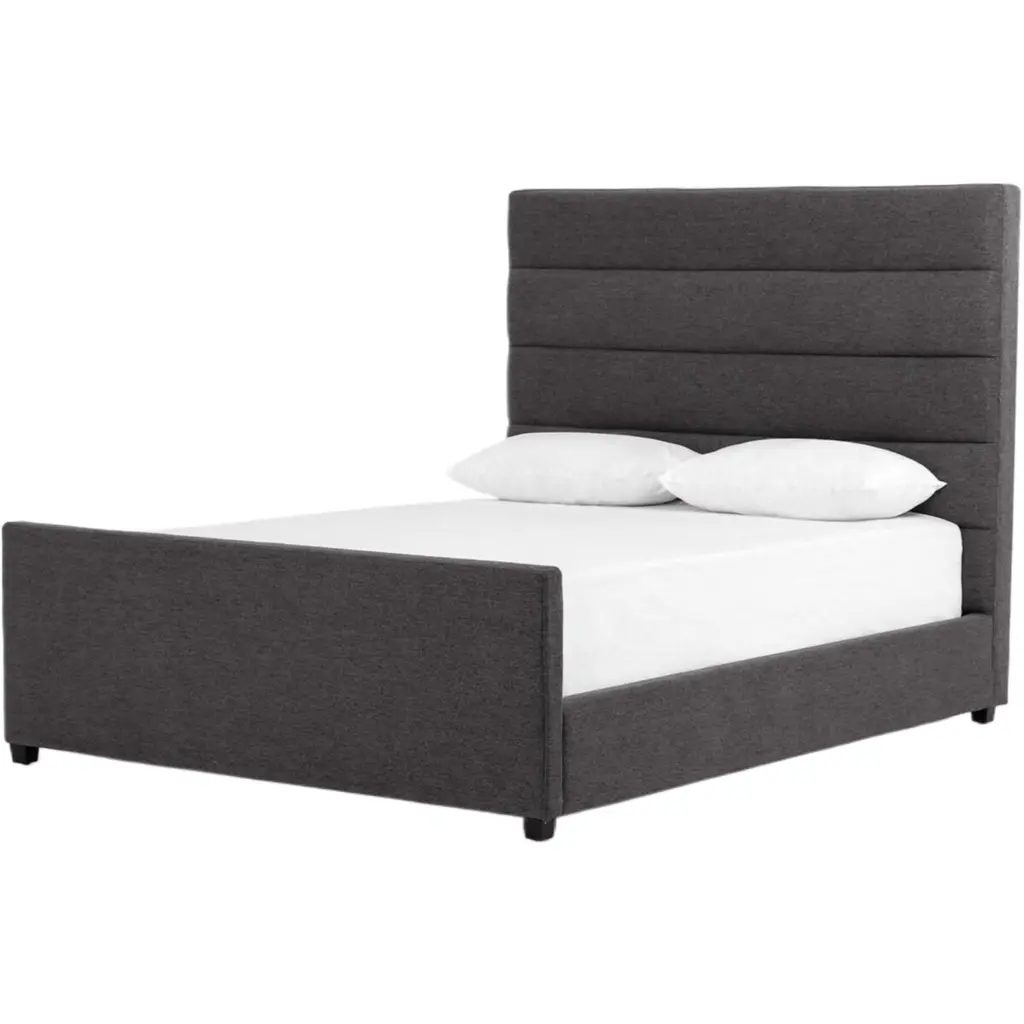 This upholstered bed features horizontal channel tufting for a modern look. Stocked in marble fabric. No box spring is required and slats are included.
