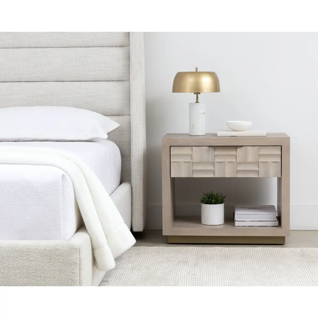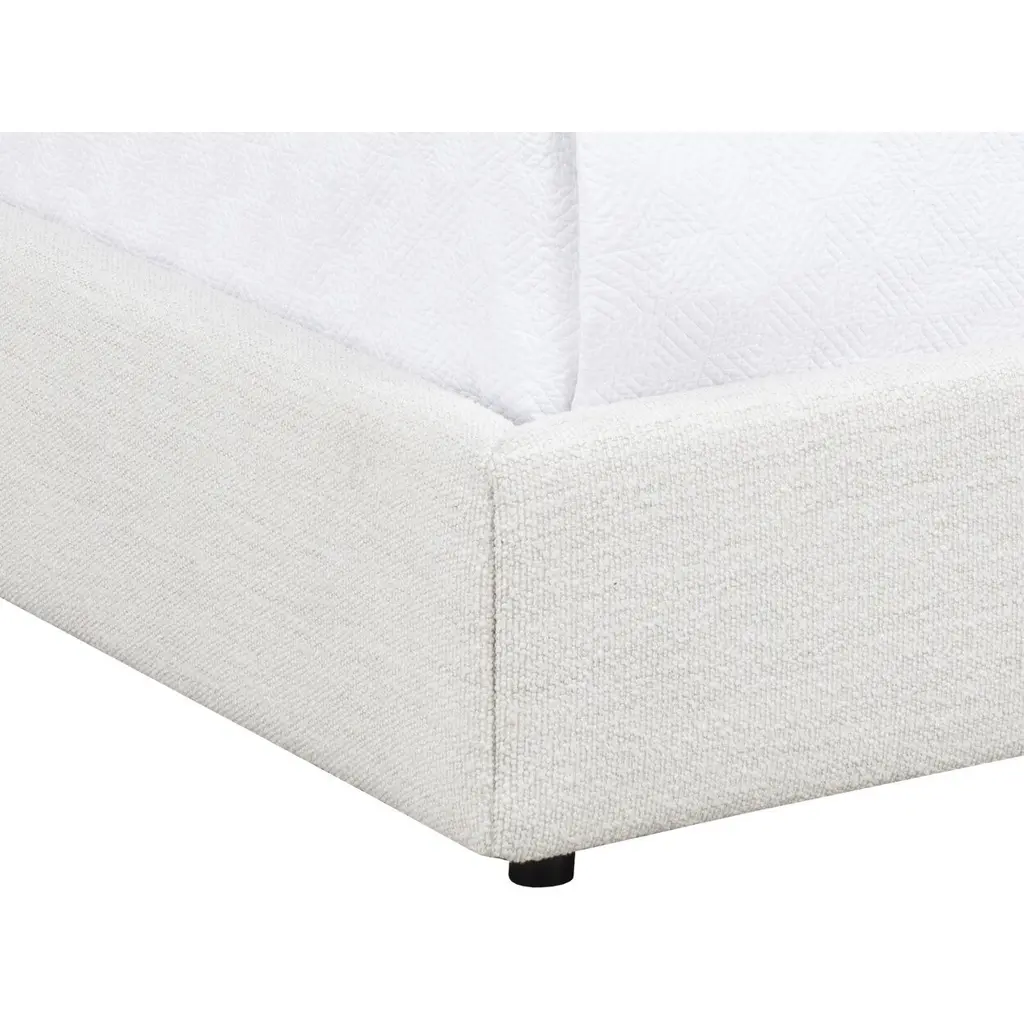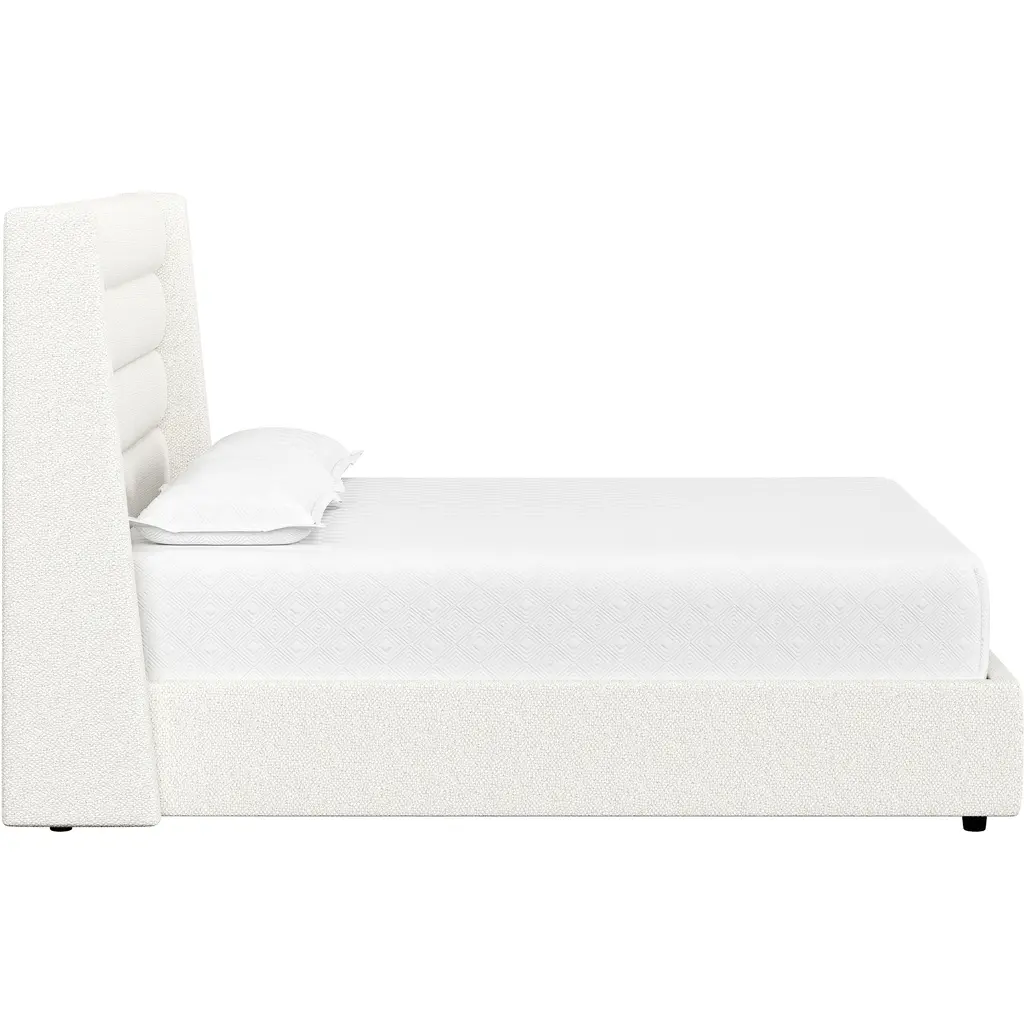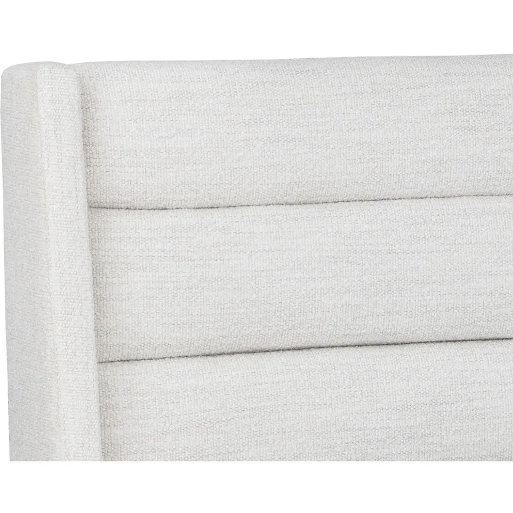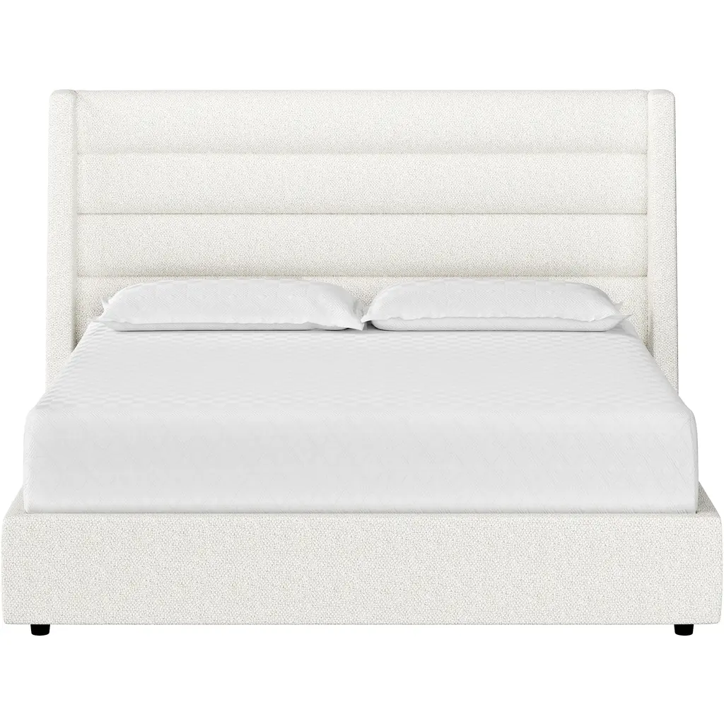 This upholstered bed features horizontal channel tufting for a modern look. Stocked in merino pearl performance fabric. No box spring is required and slats are included. Performance fabric is moisture repellent, durable and easy to clean.