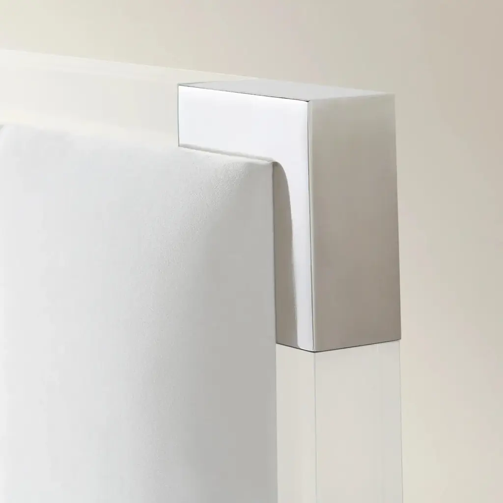 Channel tufting pared with an acrylic frame gives our Emory Bed a modern feel with glamourous touches. Accented with stainless steel corners and feet. Shown in Bella Velvet Grey. Queen: 66"W x 88"D x 56"HEastern King: 82"W x 88"D x 56"HCal King: 78"W x 92"D x 56"HExclusive to Z Gallerie.Custom options available including over 15 fabrics. Custom Orders: Custom Furniture is manufactured especially for you, which is why we do not accept cancellations, exchanges, or returns.