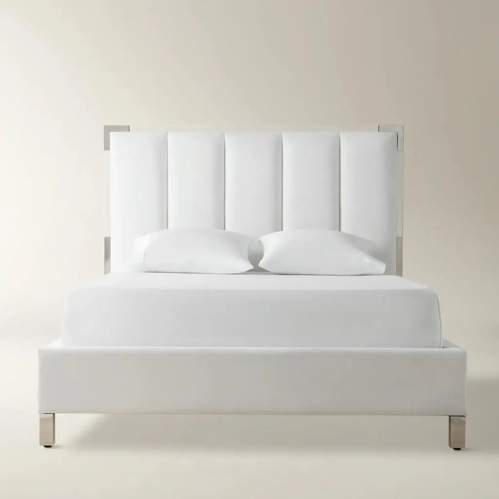 Channel tufting pared with an acrylic frame gives our Emory Bed a modern feel with glamourous touches. Accented with stainless steel corners and feet. Shown in Bella Velvet Grey.Queen: 66"W x 88"D x 56"HEastern King: 82"W x 88"D x 56"HCal King: 78"W x 92"D x 56"HExclusive to Z Gallerie.Custom options available including over 20 fabrics. Custom Orders: Custom Furniture is manufactured especially for you, which is why we do not accept cancellations, exchanges, or returns.