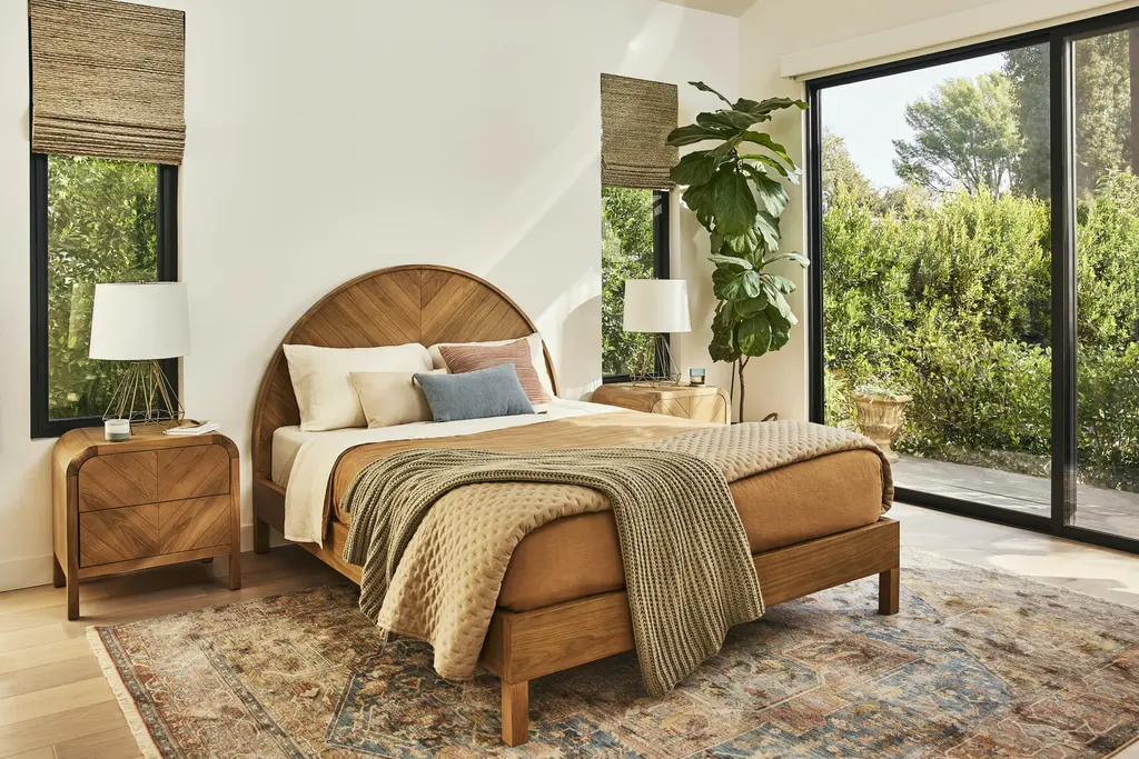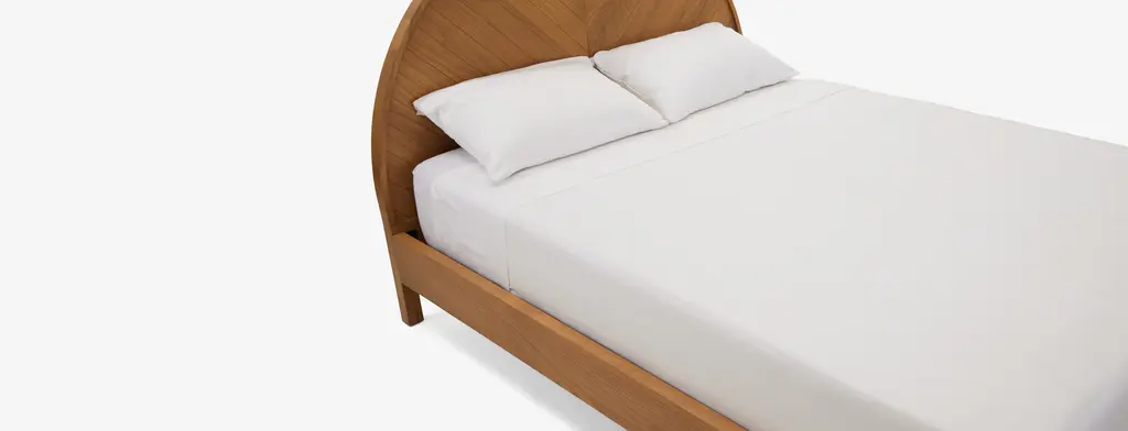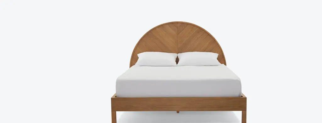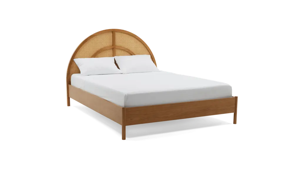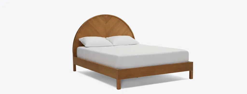 Elevate your bedroom with the Estelle Bed, which features a burnished oak semicircle headboard, wood frame and chunky squared legs. Bringing a whole new meaning to loving your curves, this bed’s rounded headboard really packs a punch of modern style, while remaining effortlessly chic. Pair with the matching Estelle Nightstands for a show-stopping bedroom set.