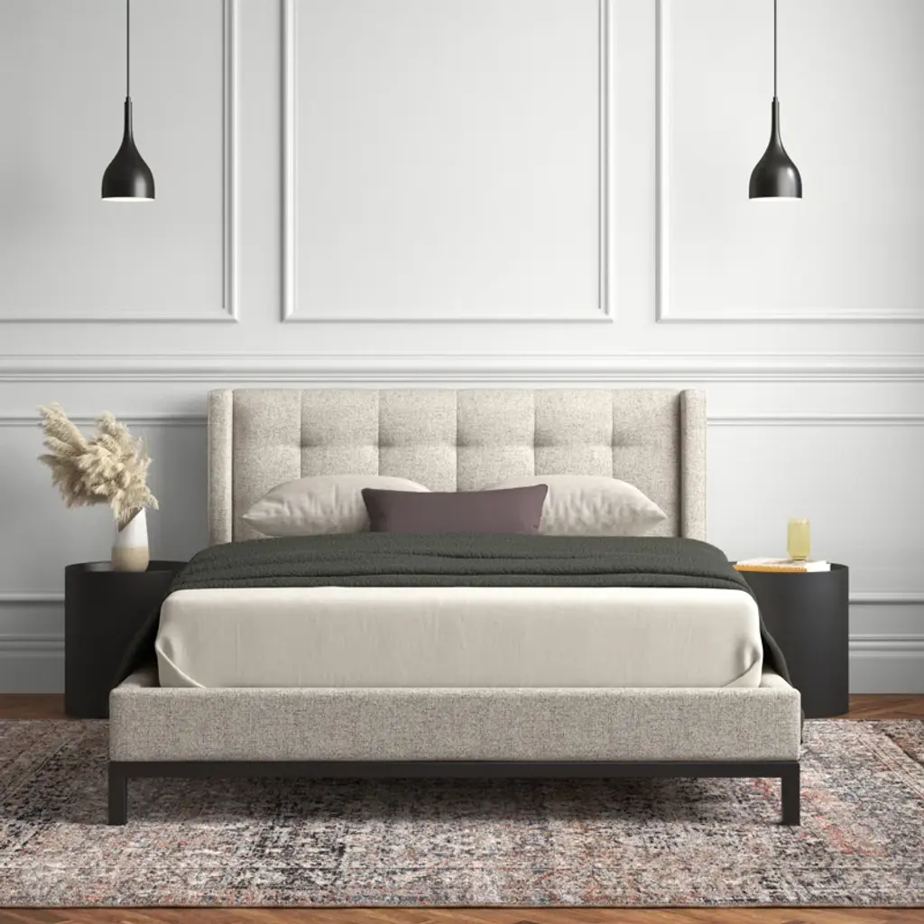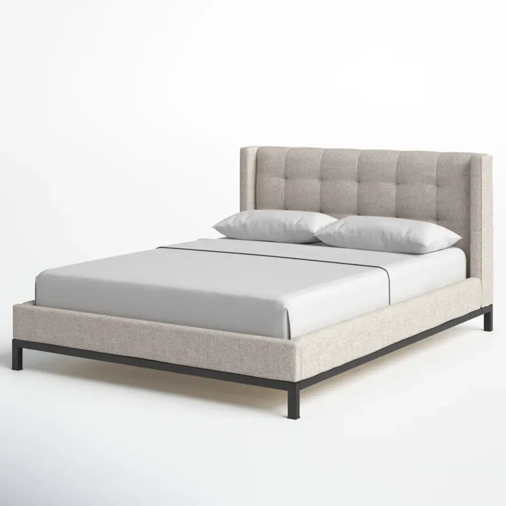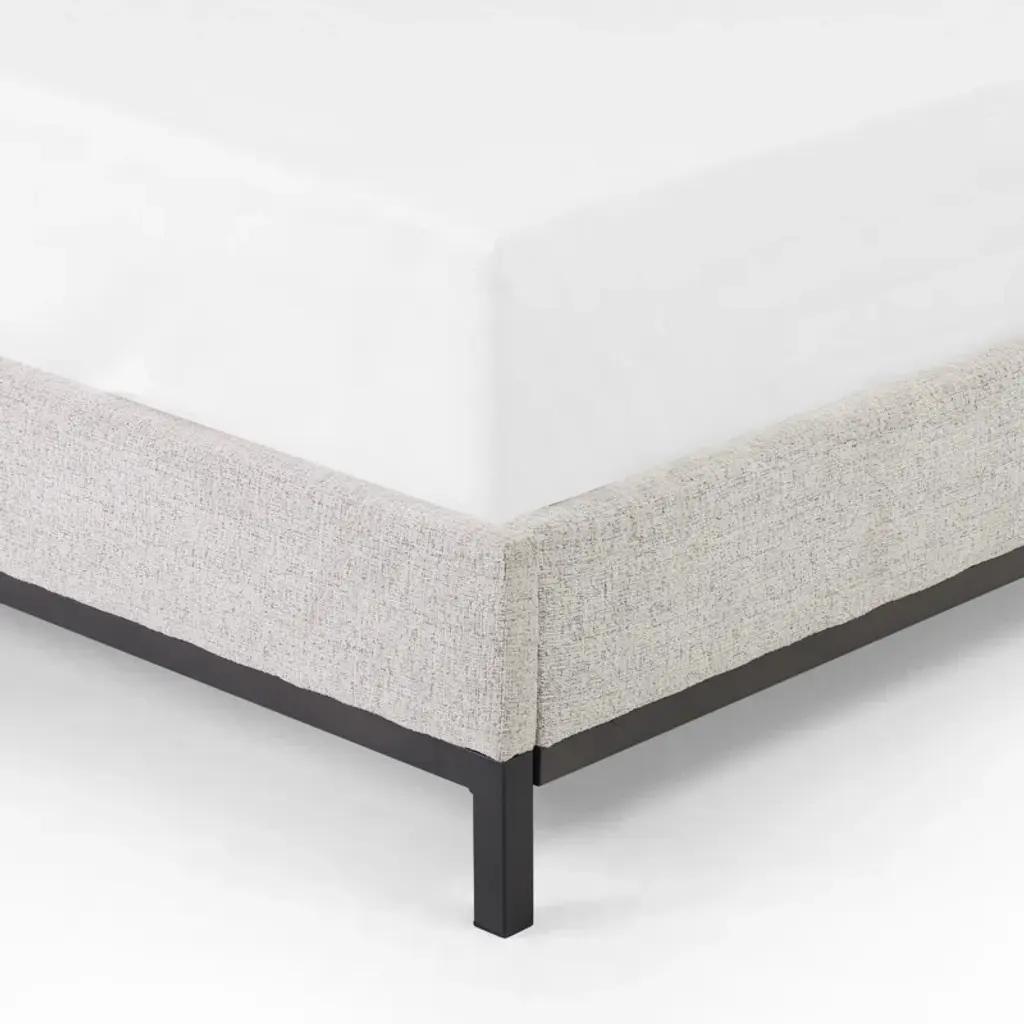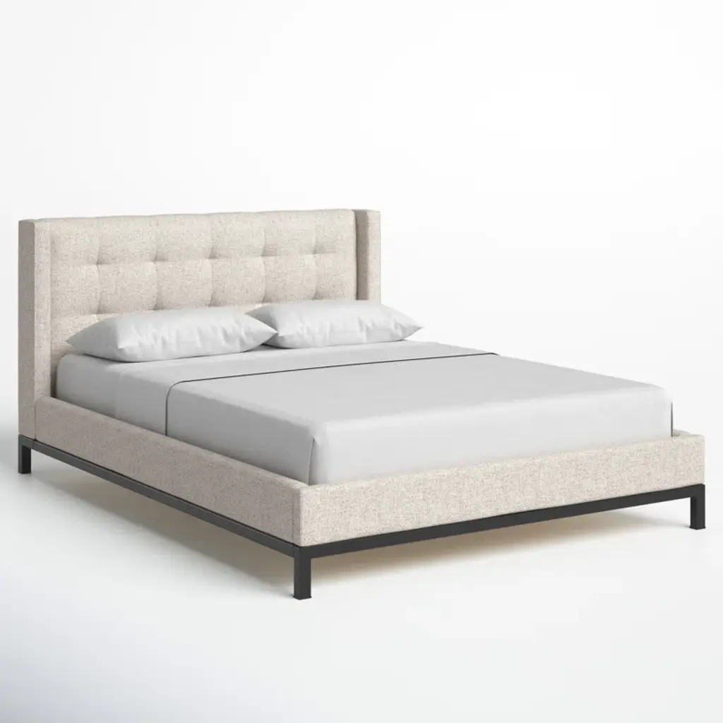 Subtle, modern elegance. A low, tufted headboard in neutral, chenille-like covering pairs with a simple gunmetal iron base.