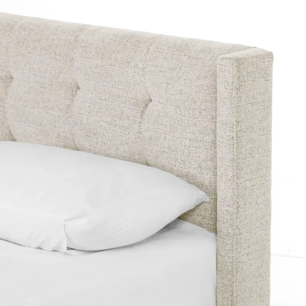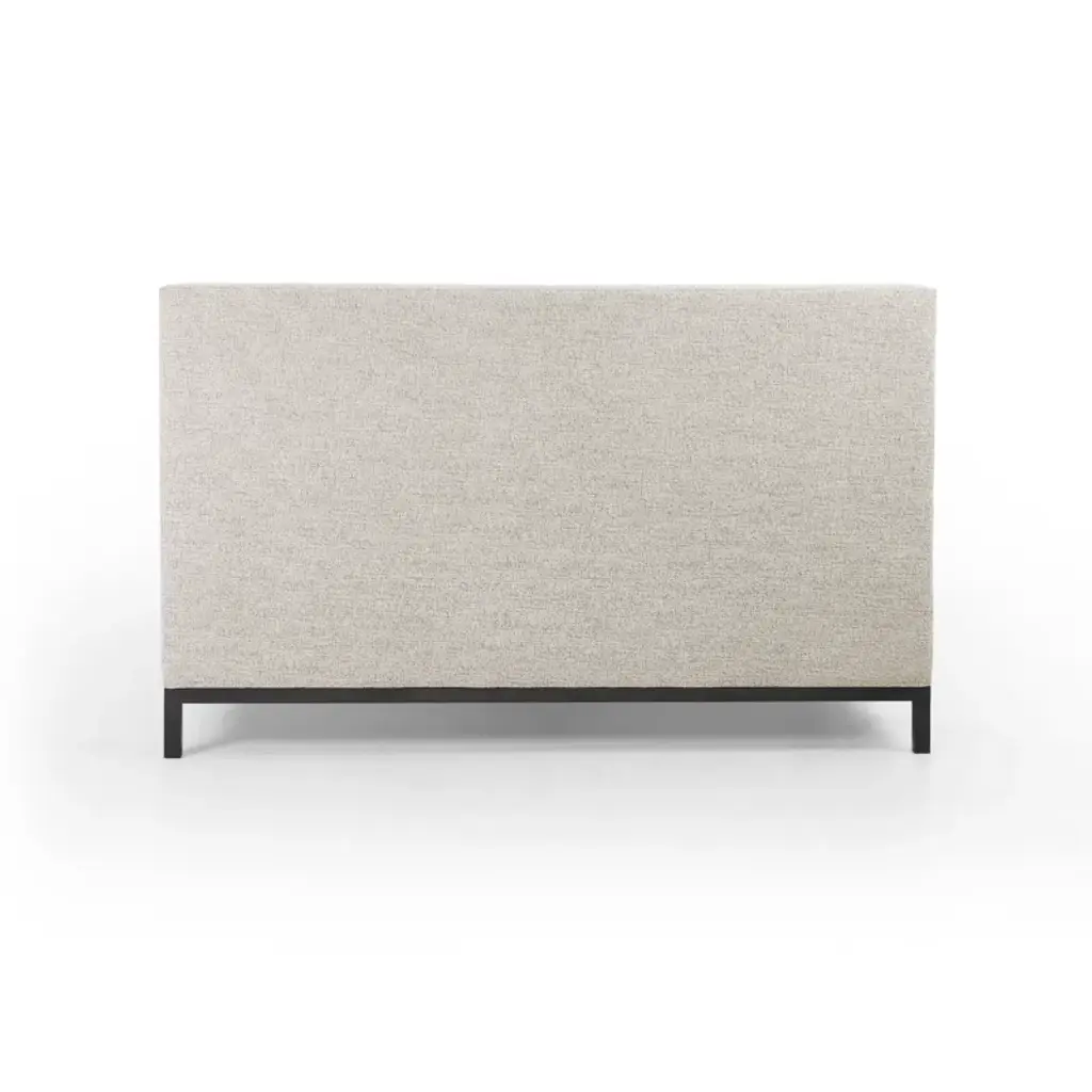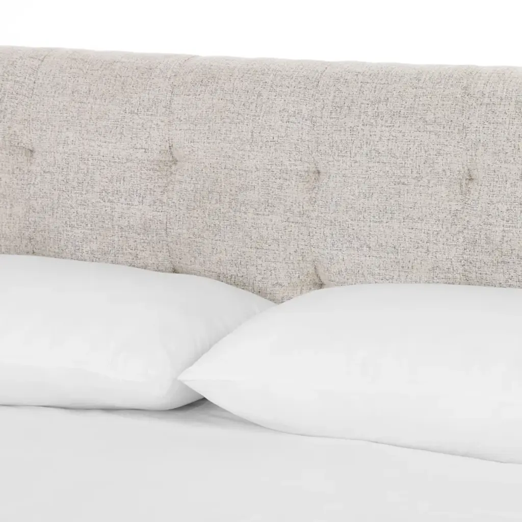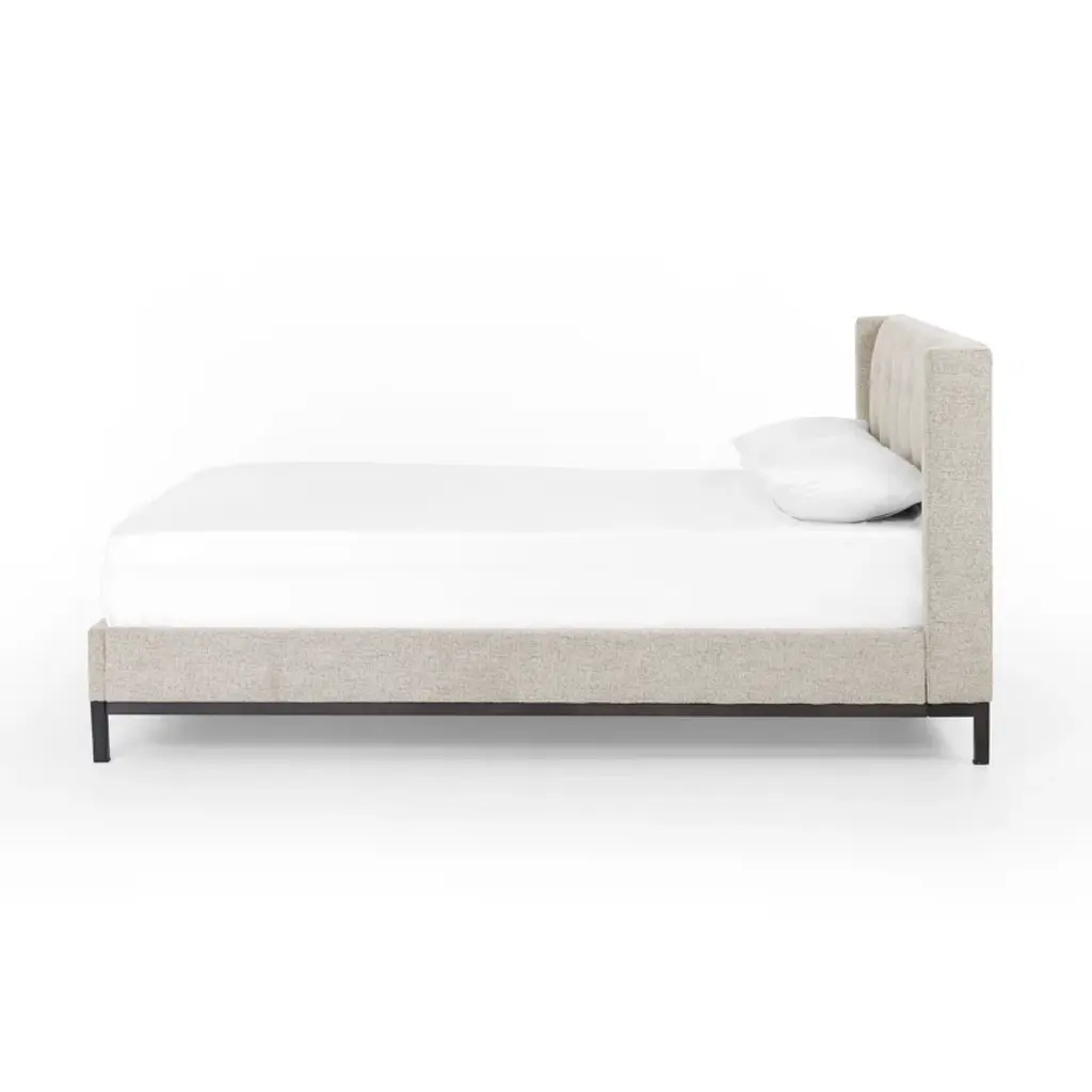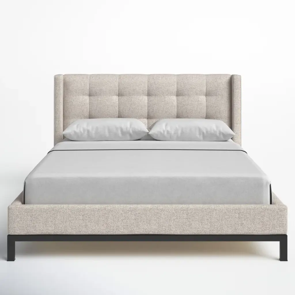 Subtle, modern elegance. A low, tufted headboard in neutral, chenille-like covering pairs with a simple gunmetal iron base.