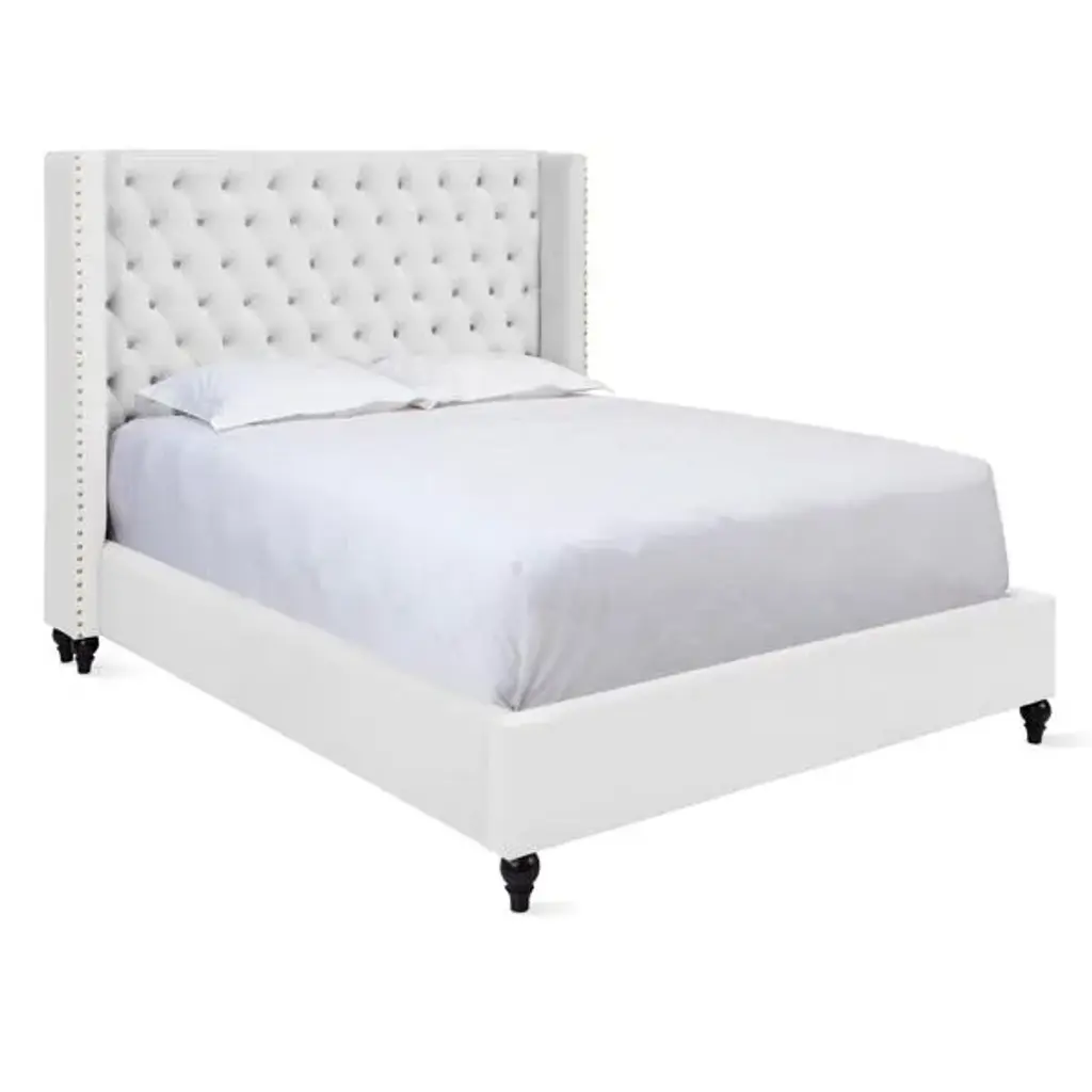 A European classic figured quartered walnut king-size bed, with a sloped headboard and foot board and a with molded edges and square tapered feet.Dimensions: 82" W x 87 1/8" D x 67 3/4" HInside depth 81 1/4"Inside width 77 1//4".