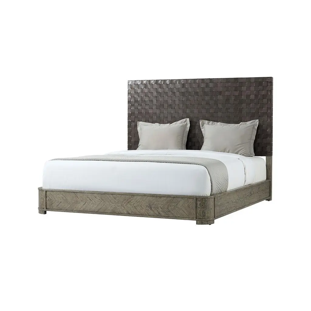 With rustic oak paneled rails in our greyed echo oak finish, and a parquetry footboard with hand-woven leather lattice headboard.Dimensions: 77.75" W x 89.75" D x 60" HFor CAL. King mattress - 72 x 84"