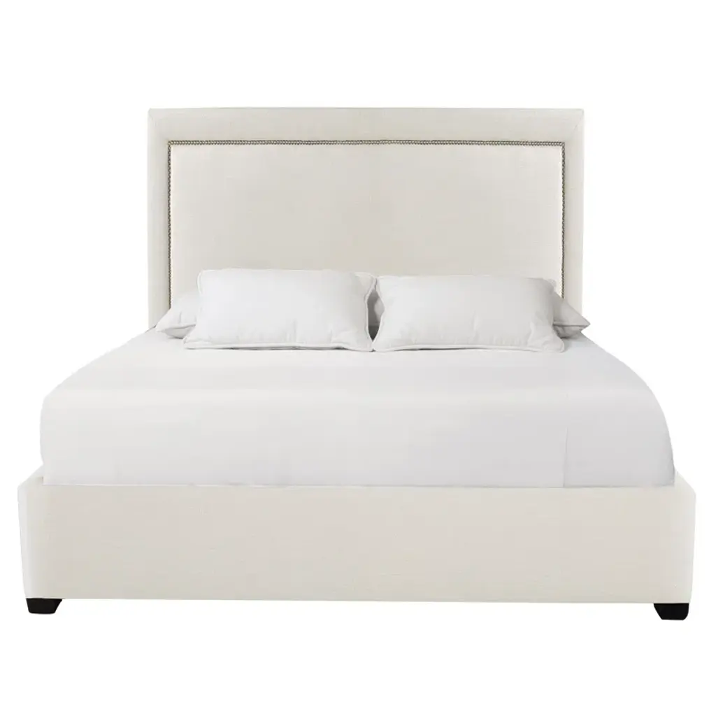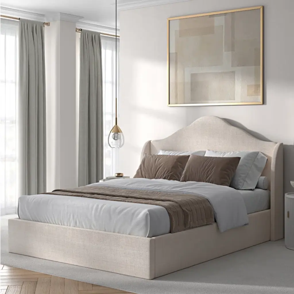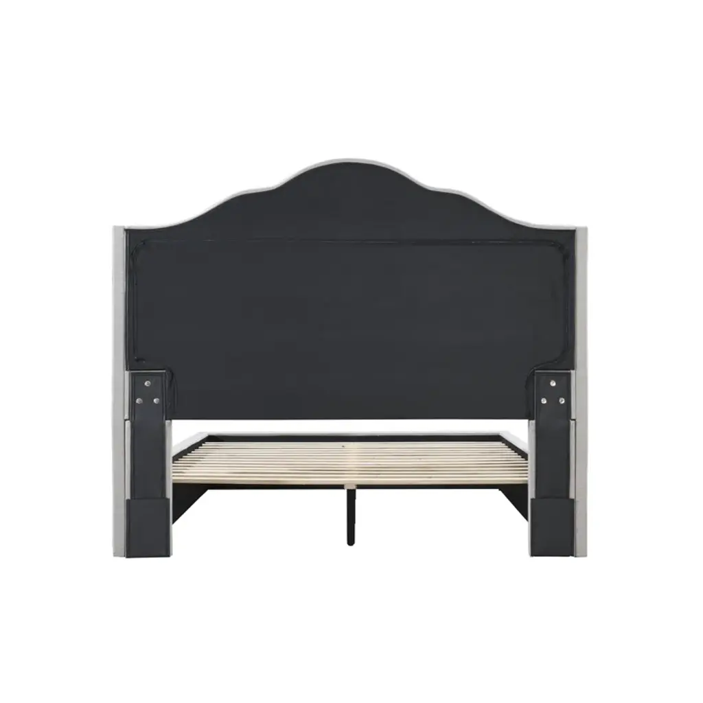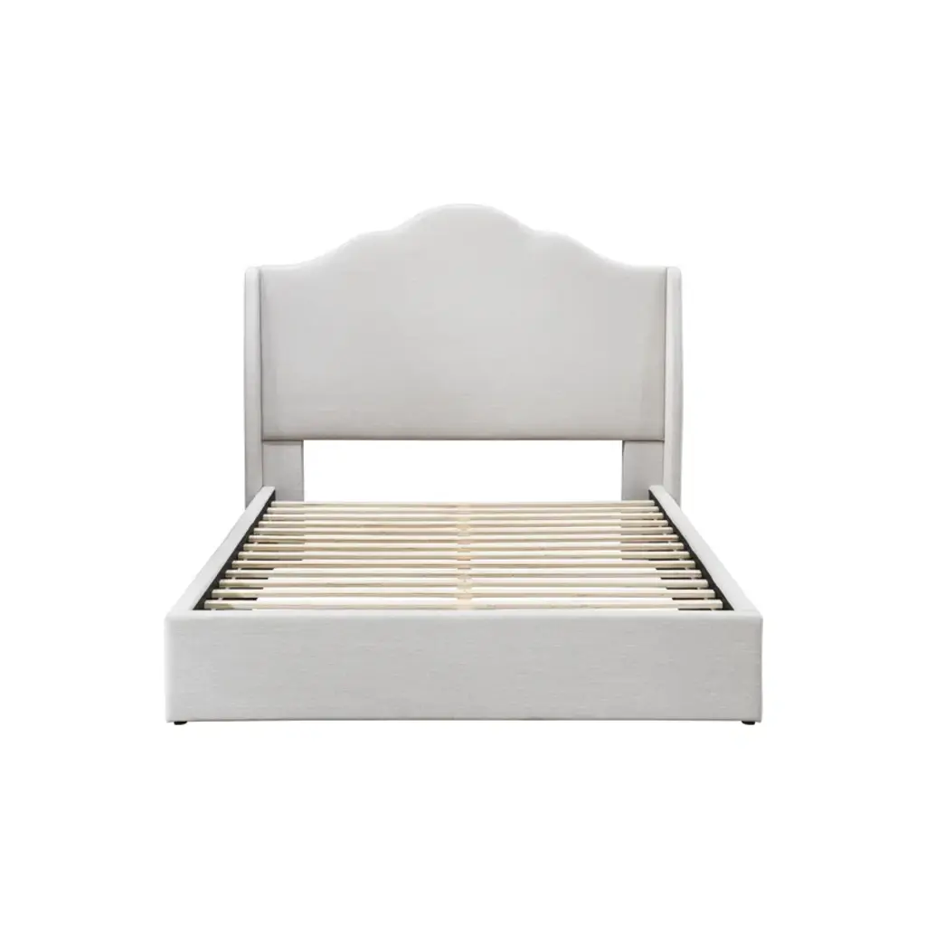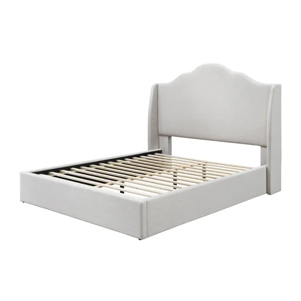 A touch of French refinement: Fluid lines meet modern minimalism. This queen bed frame puts a contemporary spin on the traditional camelback silhouette with its soft curved headboard and angled wings. Subtle and stylish, it brings French chic home to any bedroom. Easy assembly and no box spring required equals fuss-free sophistication.