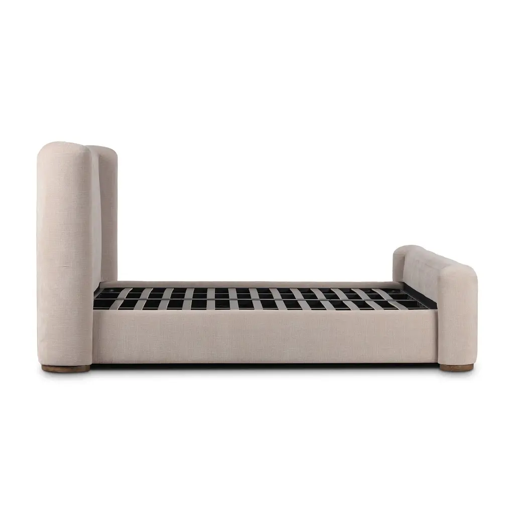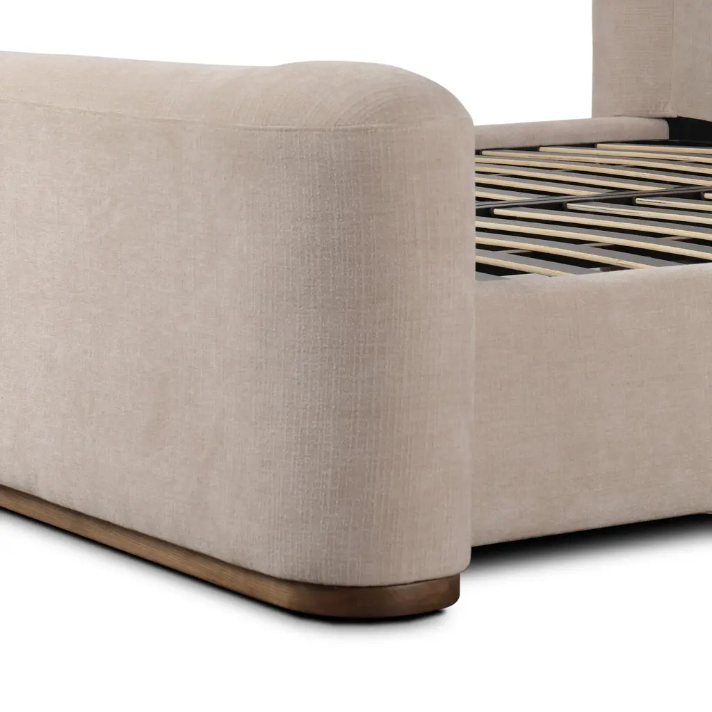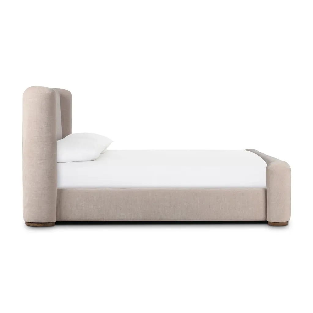 Embrace understated elegance with the Fane Bed from Four Hands. The transitional style frame complements any interior with its sheltered head and footboards, gracefully contouring the silhouette. A plinth ash base adds a touch of luxury, while all-around cushioning creates an inviting atmosphere for rest and relaxation. Highlights