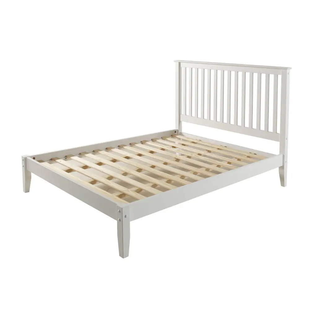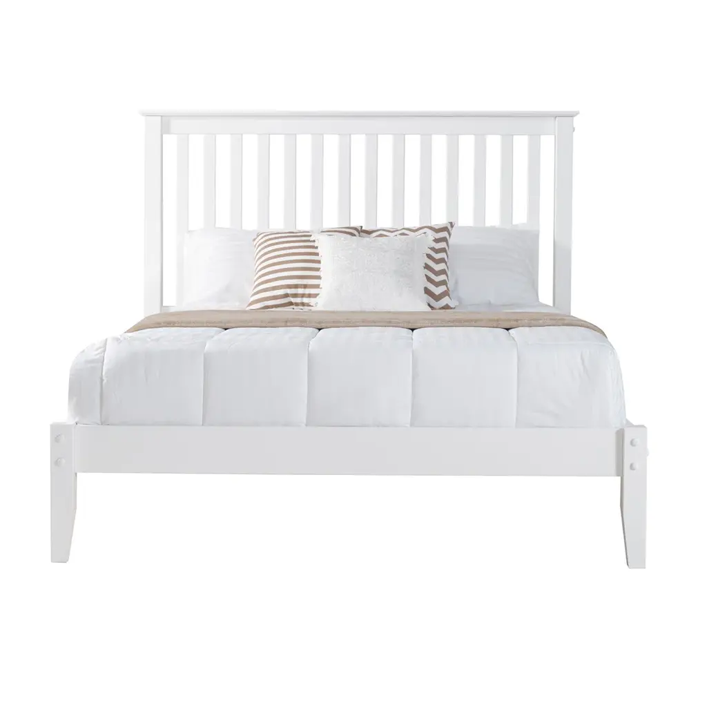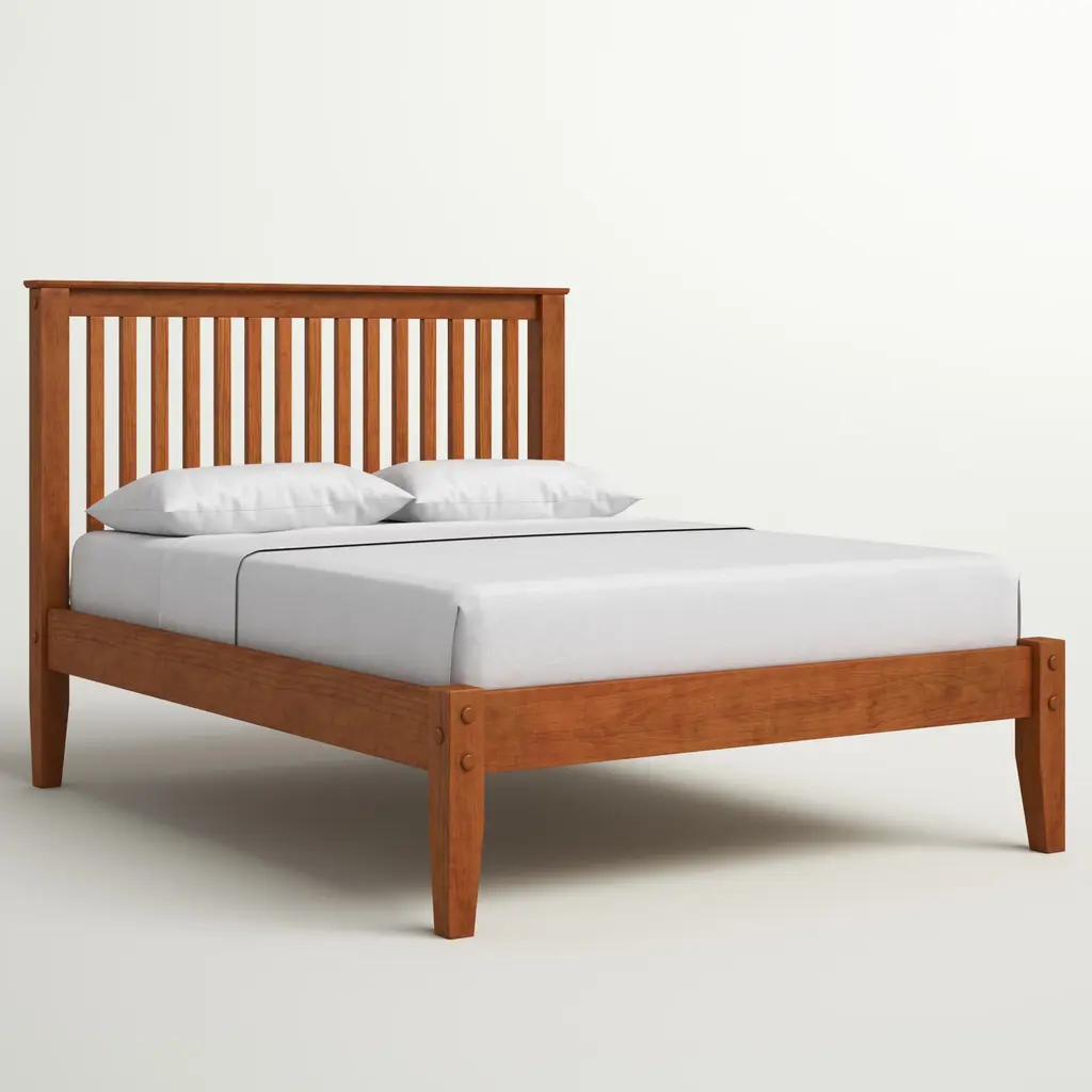About This Product Elevate your bedroom with the Faringdon Solid Wood Bed, a versatile piece that seamlessly blends with contemporary, mid-century, or traditional styles. Crafted from solid pine wood, this bed is available in a range of neutral finishes to suit your décor. Its tapered legs, understated side rails, and footboards contribute to its minimalist charm, while the vertical slatted headboard enhances the clean, straightforward design. The bed frame comes with a slat kit and center support legs, eliminating the need for a box spring. With a convenient 9.63" under-bed clearance, you can easily store boxes of sweaters or linens out of sight, combining practicality with timeless elegance. Features 100% Solid Wood Construction: Made from high-quality solid pine wood for durability and timeless appeal Eco-Friendly: Crafted with the environment in mind with wood harvested from renewable plantations Versatile Design: Complements many bedroom styles with its clean, slatted headboard and tapered legs No Box Spring Needed: Comes with a slat kit and center support legs, so you can use your mattress directly on the frame