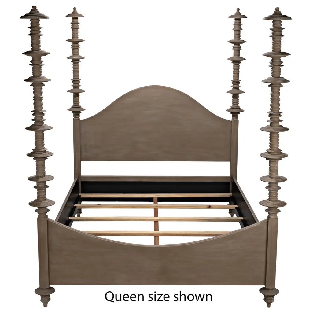 This hand-carved pale, weathered, whitewashed, or hand-rubbed black mahogany bed is embellished with intricate variegated mahogany discs on each of its four posts. The look is not quite antique, not quite contemporary, but something more this is a king bed truly fit for a King