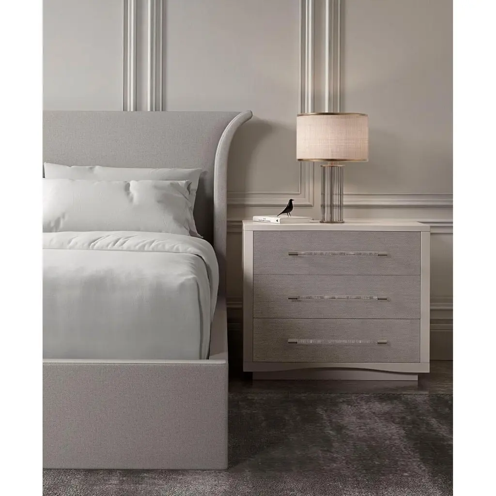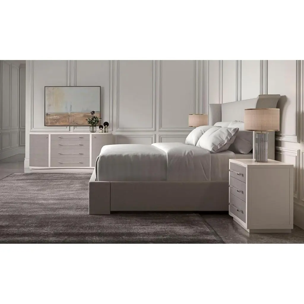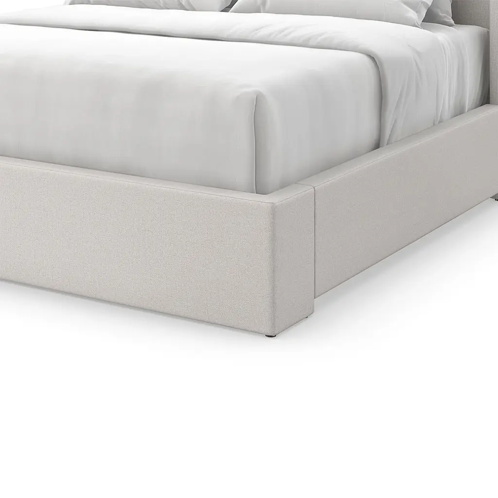 An elegant US king-sized upholstered bed frame featuring a high headboard that is flared out and curves gently at the sides. The frame is wrapped in a light natural color fabric with a subtle textured finish, which suggests a contemporary design that could fit well with various bedroom decor styles.Dimensions: 94" W x 87.5" D x 56" HMattress Opening: 78W x 82DFloor to top of slat: 10.25 upper position.Floor to top of slat: 7.5 lower position.Floor to top of Footboard: 15”Bed will accommodate adjustable bed frame system.2973-88CC-P Performance