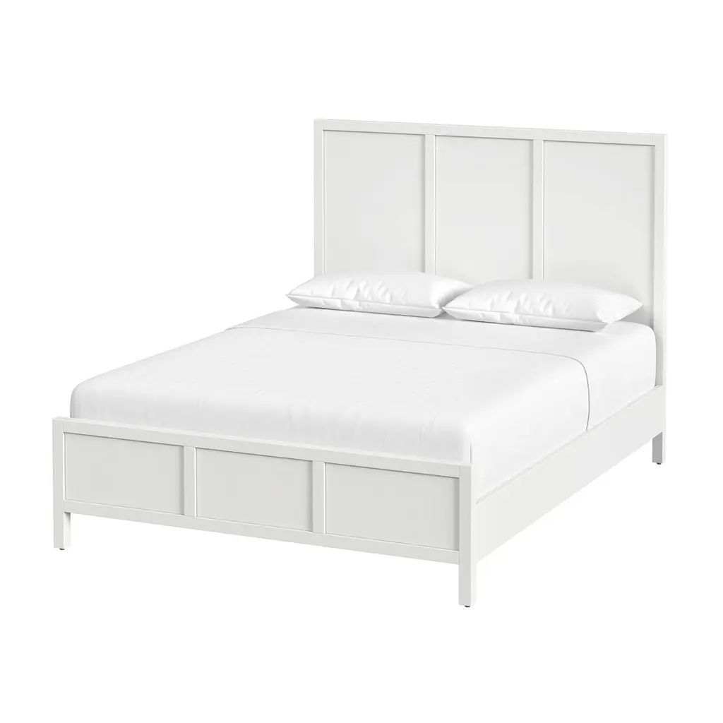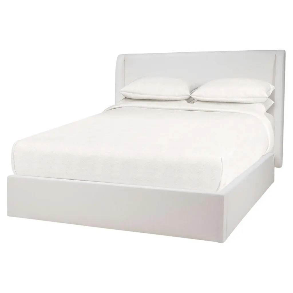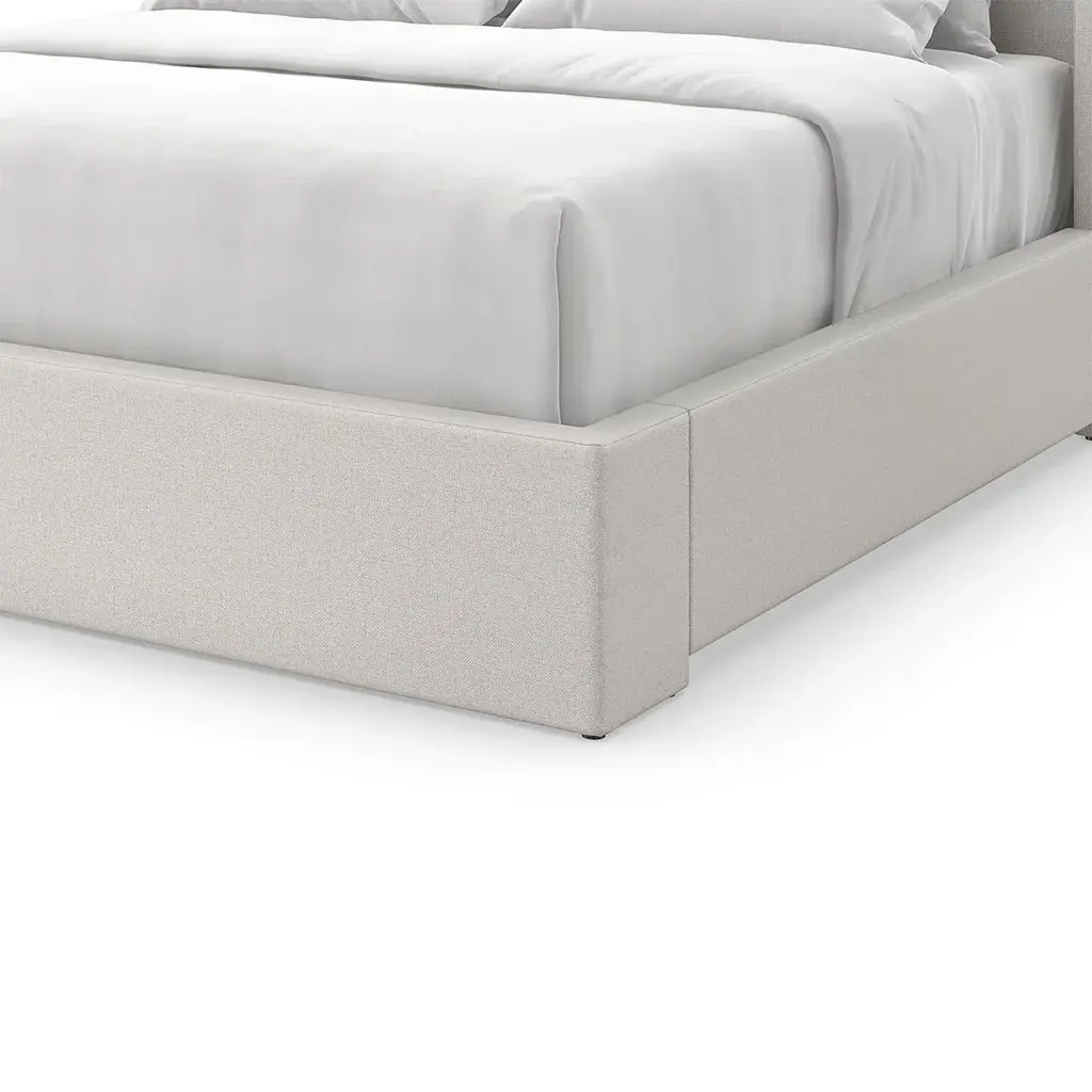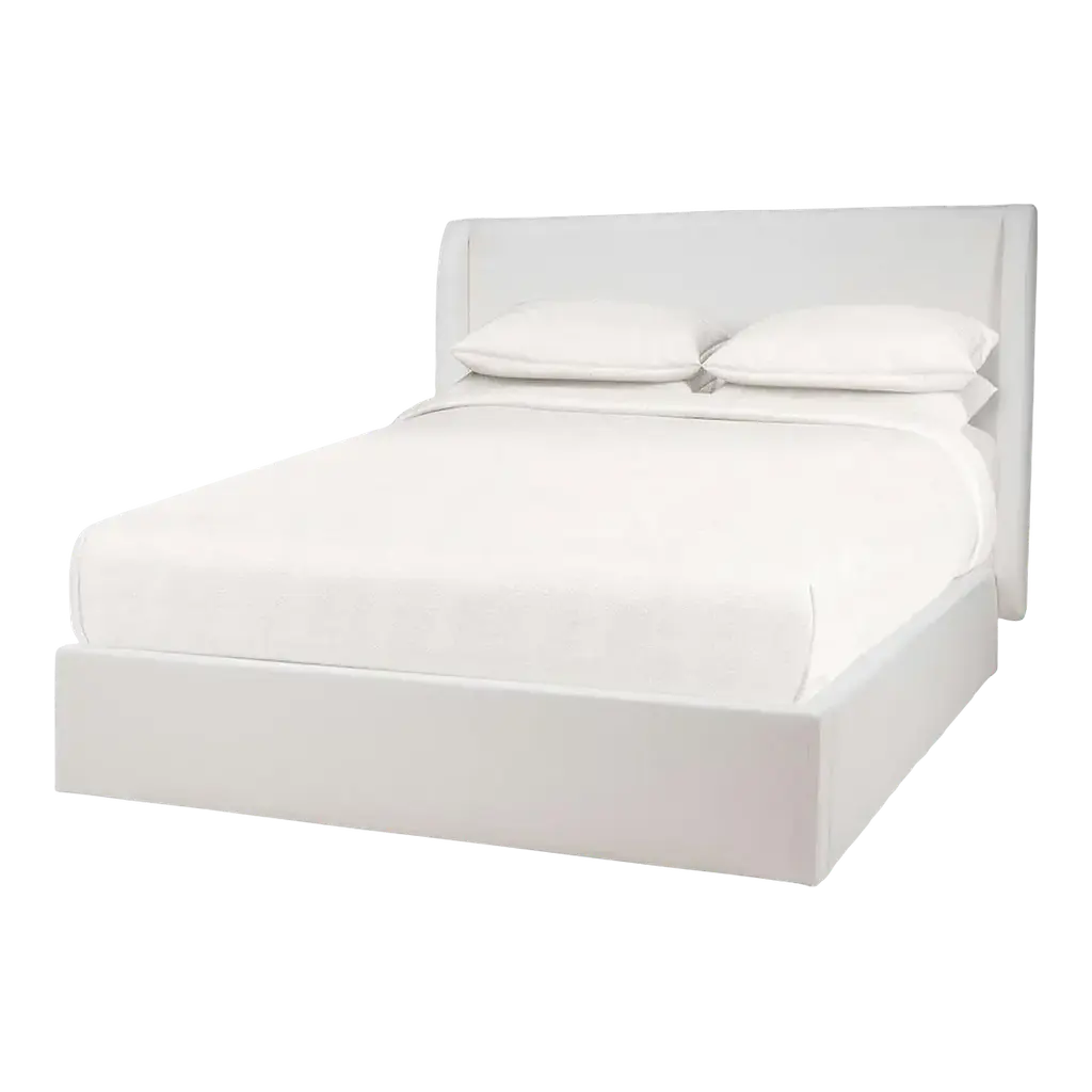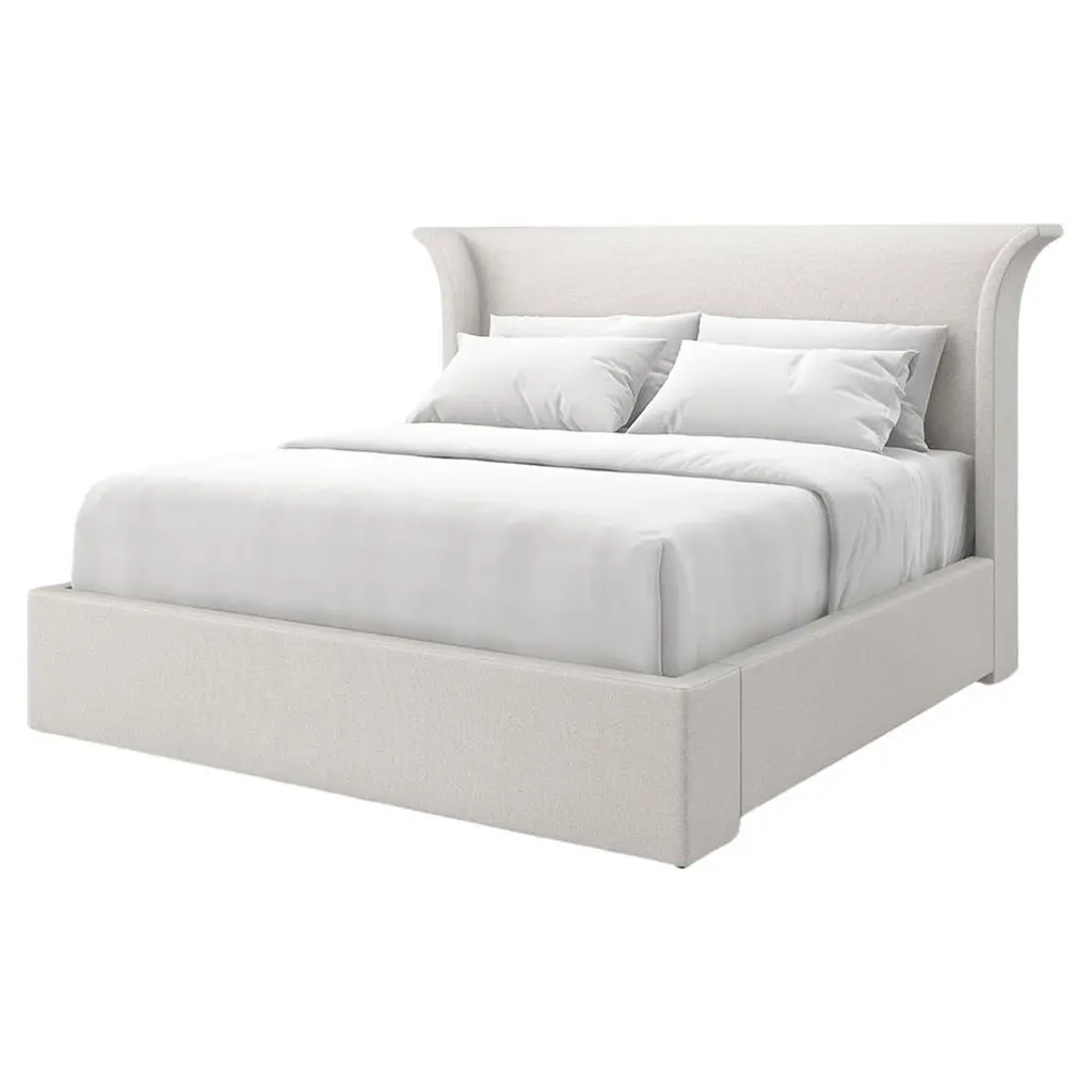 An elegant US king-sized upholstered bed frame featuring a high headboard that is flared out and curves gently at the sides. The frame is wrapped in a light natural color fabric with a subtle textured finish, which suggests a contemporary design that could fit well with various bedroom decor styles. Dimensions: 94" W x 87.5" D x 56" H Mattress Opening: 78W x 82D Floor to top of slat: 10.25 upper position. Floor to top of slat: 7.5 lower position. Floor to top of Footboard: 15” Bed will accommodate adjustable bed frame system. 2973-88CC-P Performance