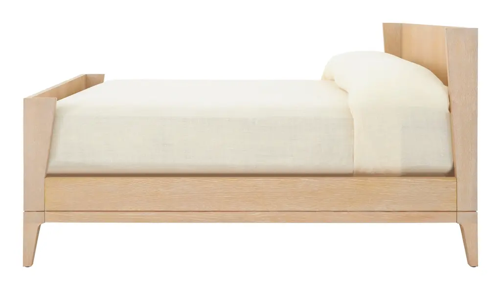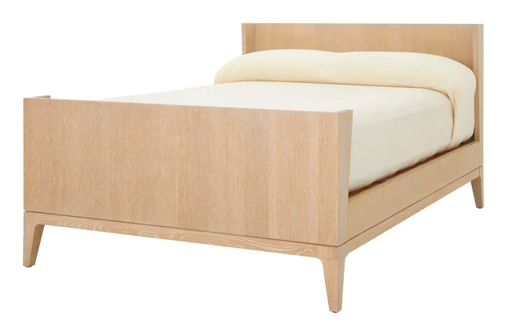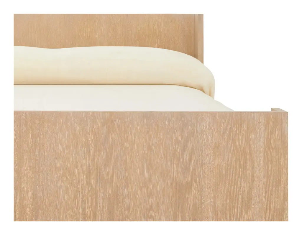 Turn your bedroom into the ultimate end-of-the-day retreat with our dreamy Fletcher Bed. Completely crafted from solid oak into a simple, clean-lined silhouette, Fletcher is covered with a beautifully-grained oak veneer and finished with a bleached cerused finish for a light and airy aesthetic. We love the angled details on its head and foot boards, which create a sheltering feel while also adding an extra touch of modern flair to its minimalist form. Chic yet laid-back, Fletcher would make the perfect addition to any primary bedroom, especially when layered cozy bedding and blankets and a few plush pillows from our collection. •solid oak•oak veneer•cerused finish•box spring not required Dimensions •63"W x 83.5"D x 44"H