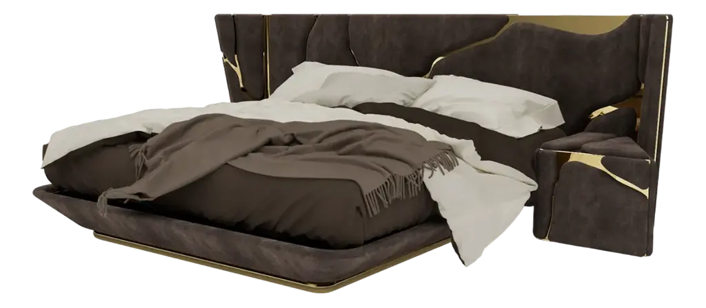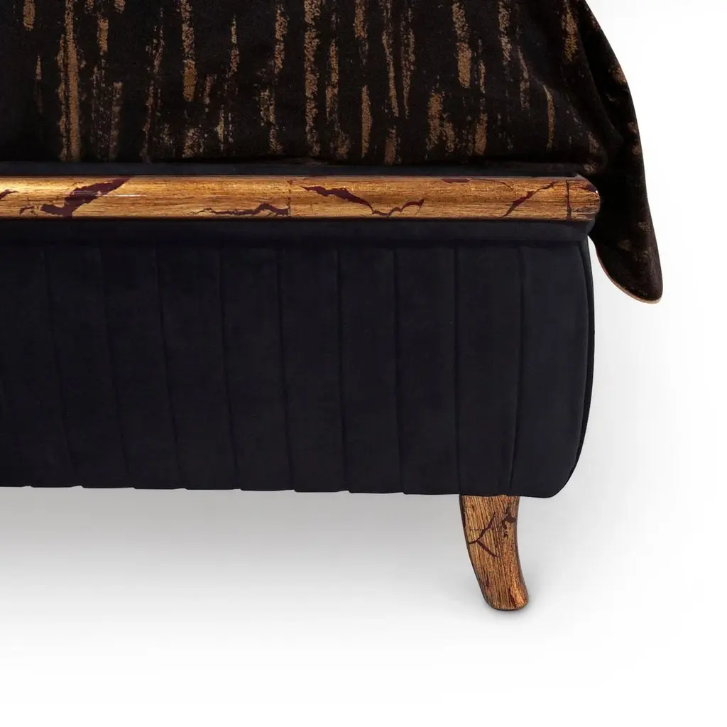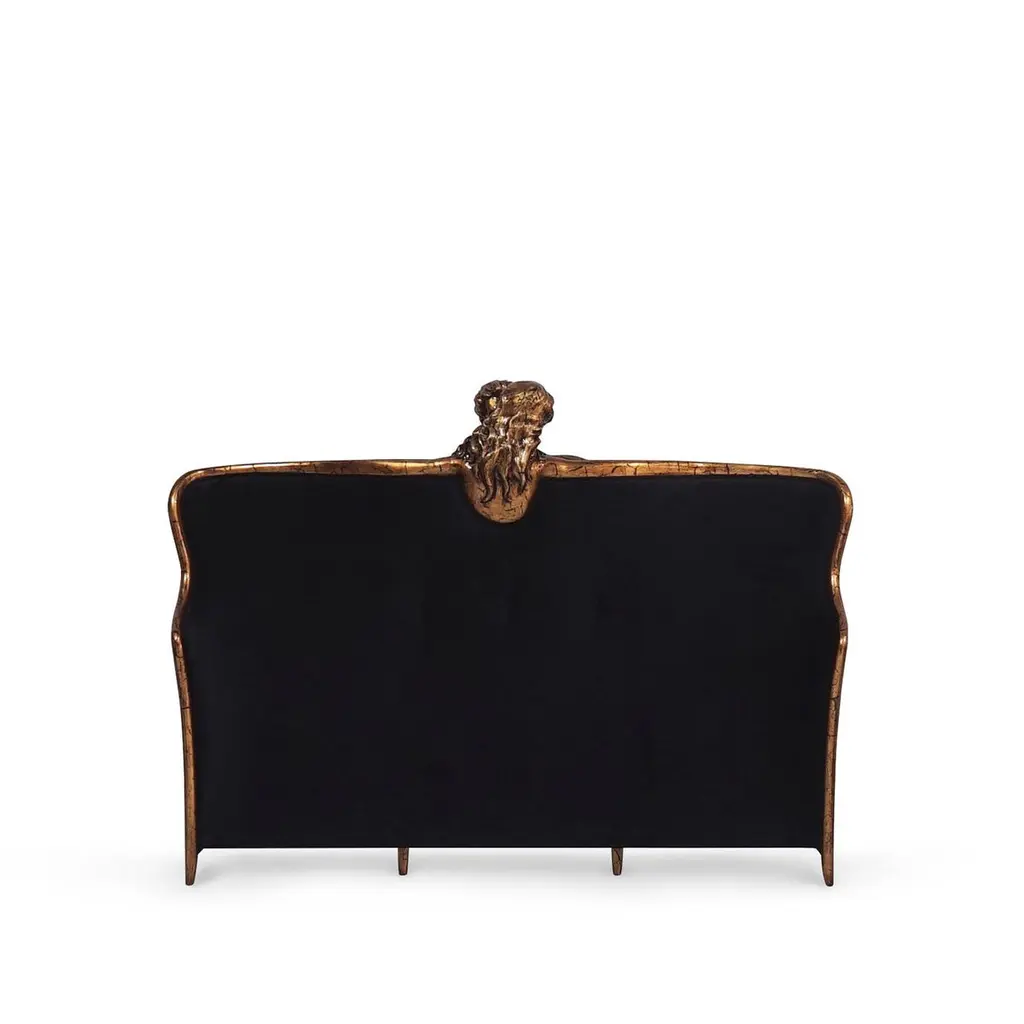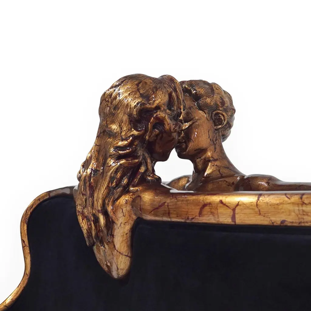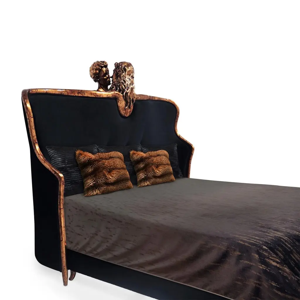 As KOKET's original boudoir temptress, the Forbidden Bed embodies all that is sultry seductive. The sensuous union of the lips and body bring out emotions which lead to enticement and temptation just like a magnificent moment that never ends. Hand carved fully upholstered headboard delicately accented with metalic leaf.
