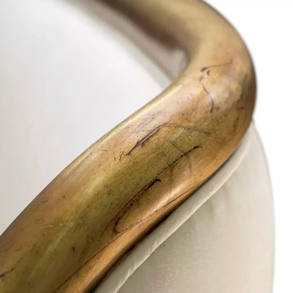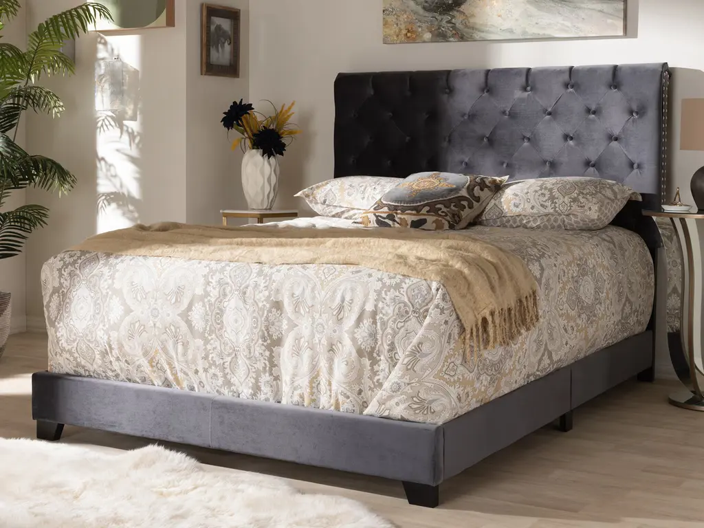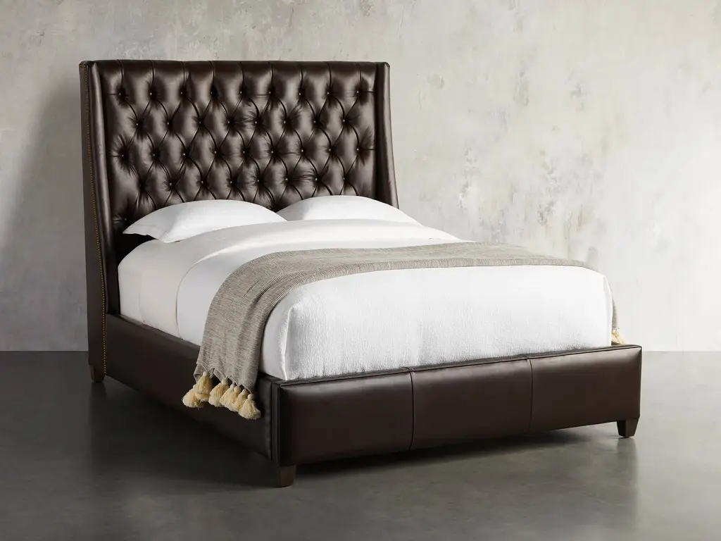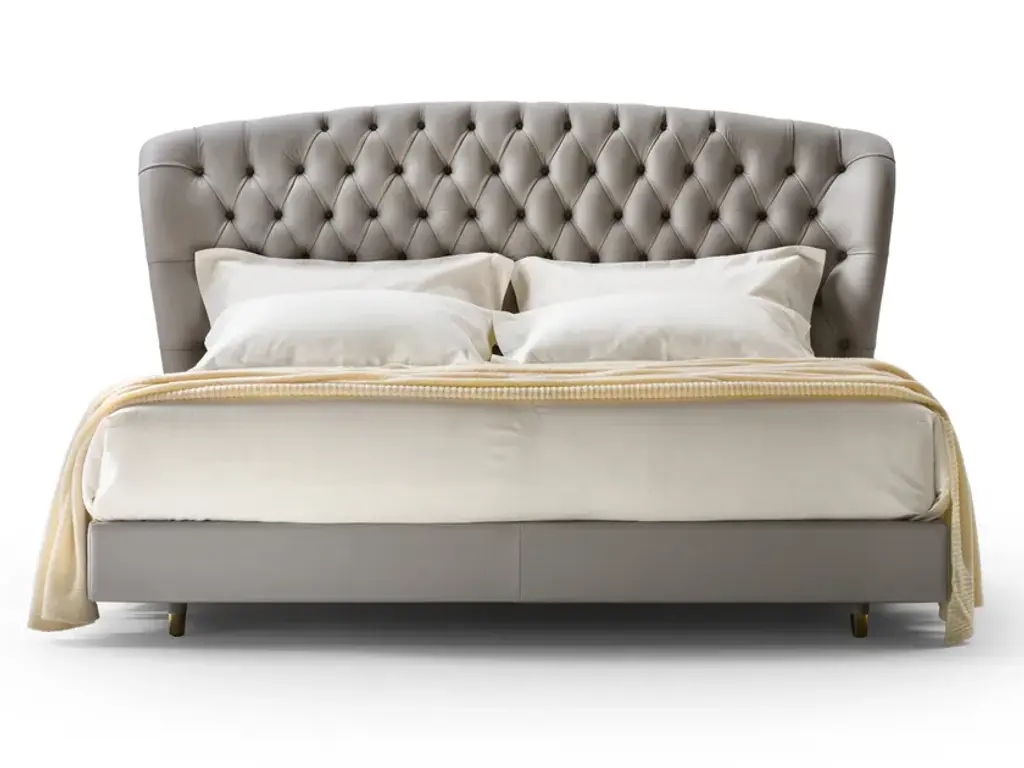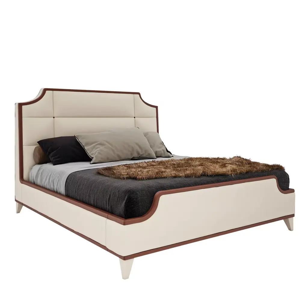 As KOKET's original boudoir temptress, the Forbidden Bed embodies all that is sultry seductive. The sensuous union of the lips and body bring out emotions which lead to enticement and temptation just like a magnificent moment that never ends. Hand carved fully upholstered headboard delicately accented with metalic leaf.Materials & Finishes:Headboard: Lux Velvet Beige 0071 from the KOKET Textiles collectionBase: Lux Velvet Beige 0071 from the KOKET Textiles collectionFeet: Broken Red Gold LeafDetails: Broken Red Gold LeafClean & Care: Care for textiles by vacuuming or lightly brushing. Maintain textiles by keeping them away from direct sunlight. Rotate and flip cushions when vacuuming for even wear. The nap of high pile textiles such as velvets may become crushed or lose its original pile height. We recommend light steaming to lift the pile to its original height. The textile should also be brushed with a de-linting brush to maintain its pile. Water based or solvent cleaner may cause discoloration or staining. We recommend that stained or soiled textiles be professionally cleaned. Never use cleaners with alcohols or solvents on metals. Only use cotton or extra soft cloths. We recommend that tarnished metals be professionally cleaned.