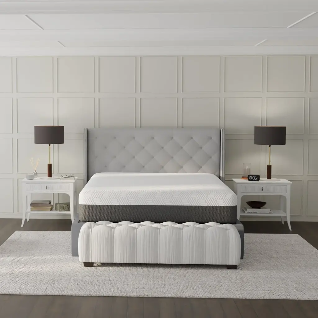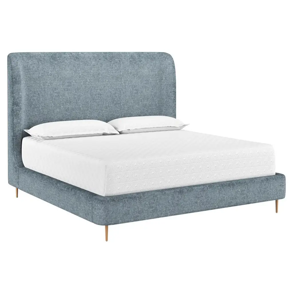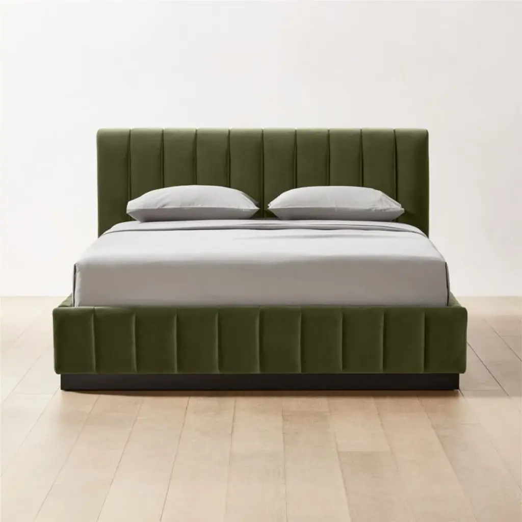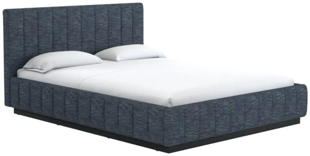 Designed by Mermelada Estudio, cushy channels of plush upholstery line the length of this finely tailored bed. Plinth oak wood base with a black finish keeps a minimal profile. A true statement piece. CB2 exclusive.