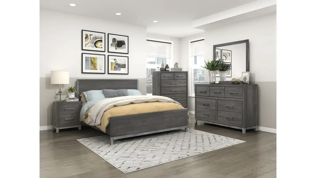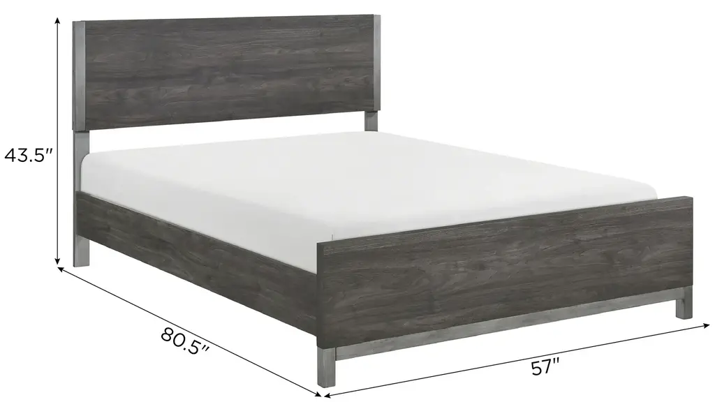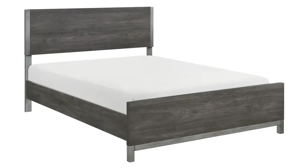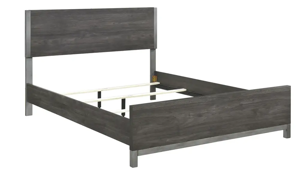 The sleek design of the Frado Bed pairs clean lines with modern convenience to create a style that will be the perfect palette for your design aspirations. The low-profile panel bed features painted metal-finish banding on the headboard's sides and the footboard's base rail, creating the perfect accenting contrast to the faux wood finish of the melamine veneer.
