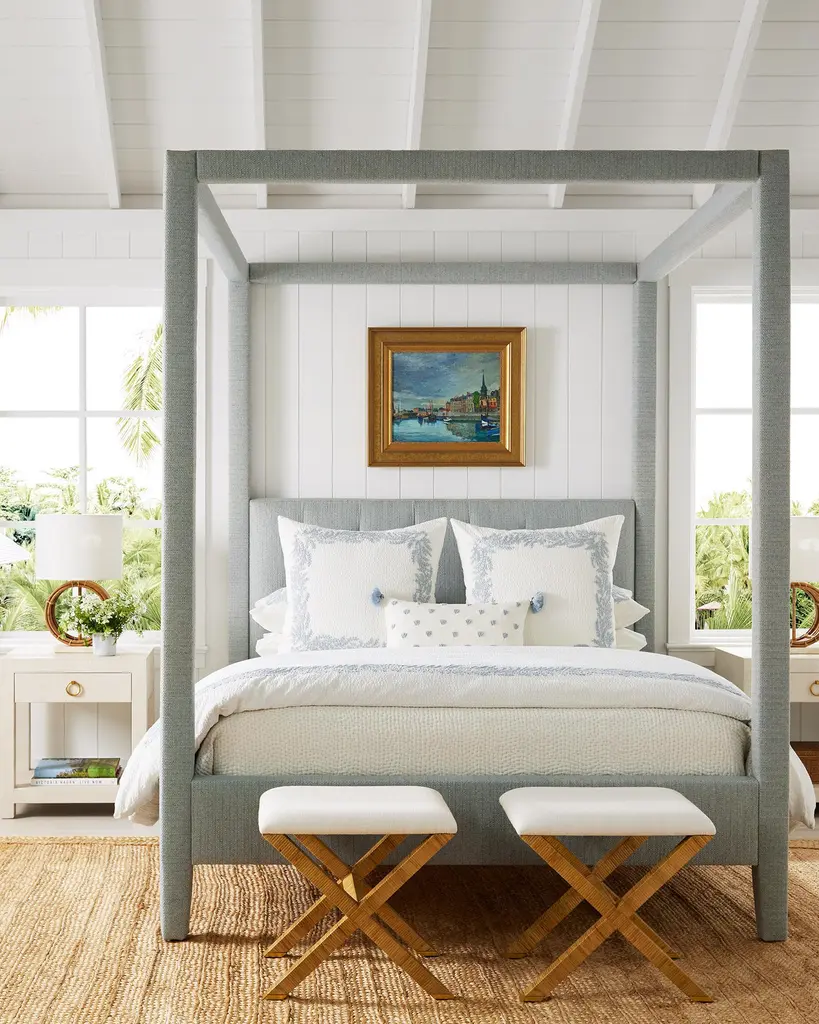 High rise. The luxury of a fully upholstered four poster bed. A channeled headboard brings great depth. Timeless and impeccable.