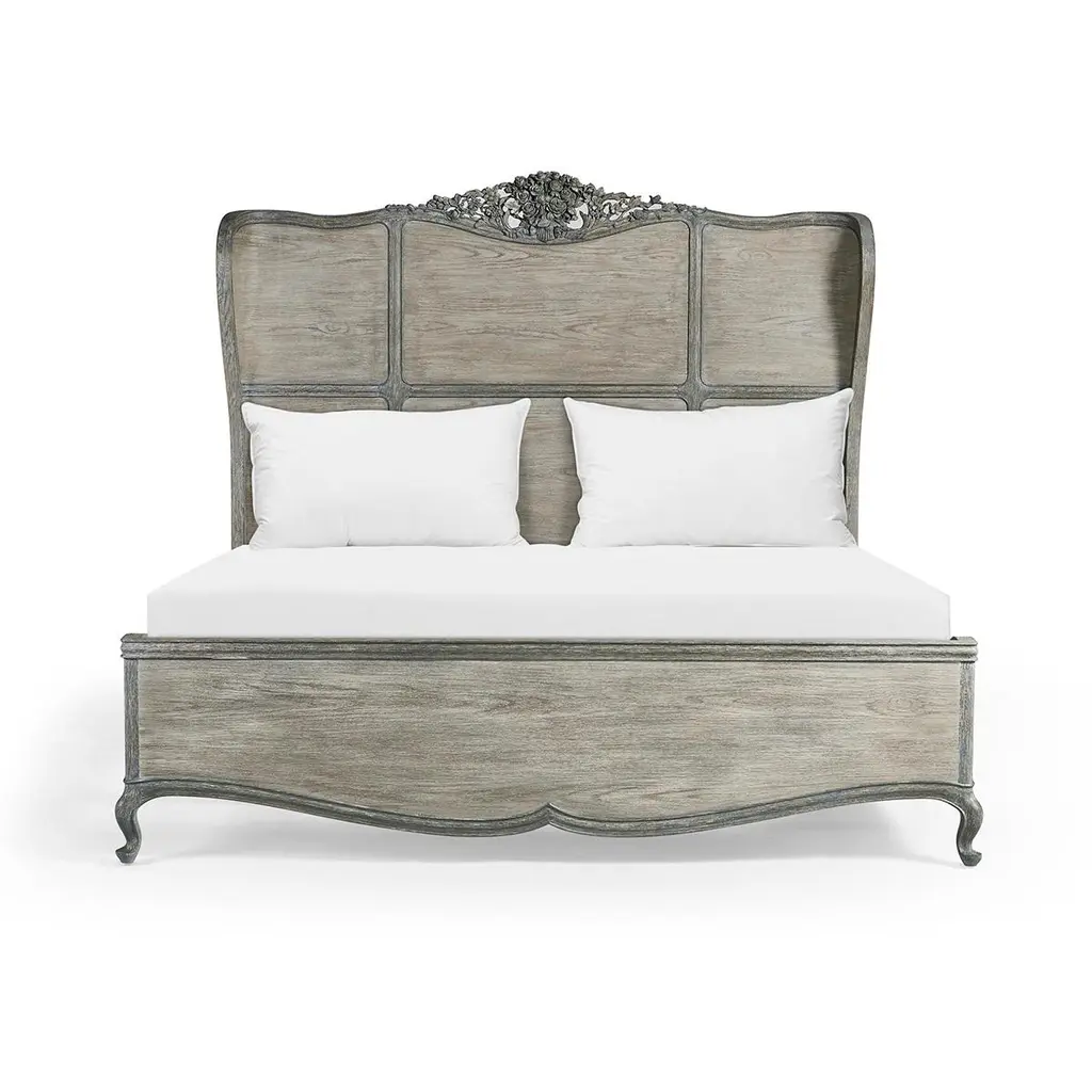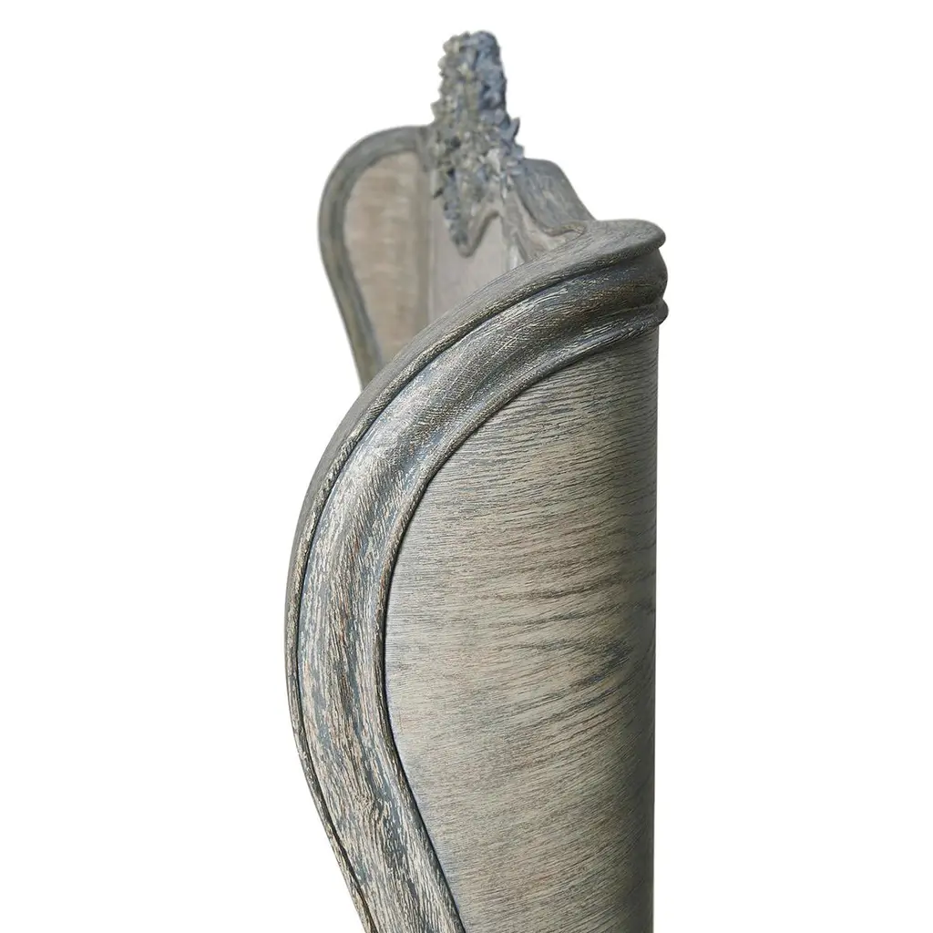 The chipped blue oak finish adds a touch of vintage charm, while the meticulous hand-carved solid oak floral adornment showcases the dedication to artisanal craftsmanship. Cabriole legs add a touch of elegance to its silhouette, elevating its aesthetic appeal, while the subtle wing headboard provides a cozy and comfortable backdrop, making it the perfect spot for relaxation, reading, or simply indulging in a moment of reprieve.Dimensions: 83.38" W x 86.5" D x 69.75" HFeatures:Chipped Blue OakOak Solids & VeneersHand-carved, solid oak floral adornmentHand-applied paint stripped off to create the chipped blue finishCabriole legsSubtle wing headboardBox spring required