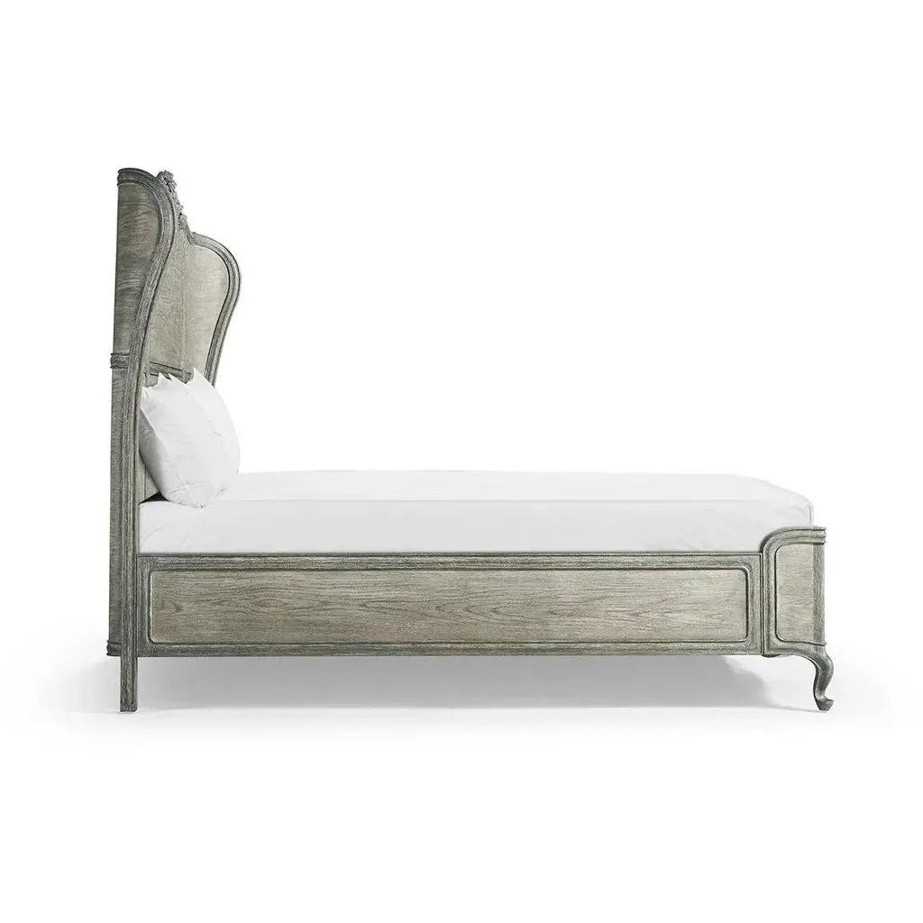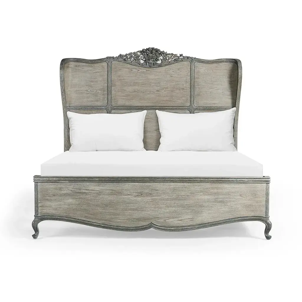 The chipped blue oak finish adds a touch of vintage charm, while the meticulous hand-carved solid oak floral adornment showcases the dedication to artisanal craftsmanship. Cabriole legs add a touch of elegance to its silhouette, elevating its aesthetic appeal, while the subtle wing headboard provides a cozy and comfortable backdrop, making it the perfect spot for relaxation, reading, or simply indulging in a moment of reprieve. Dimensions: 83.38" W x 86.5" D x 69.75" H Features: Chipped Blue Oak Oak Solids & Veneers Hand-carved, solid oak floral adornment Hand-applied paint stripped off to create the chipped blue finish Cabriole legs Subtle wing headboard Box spring required