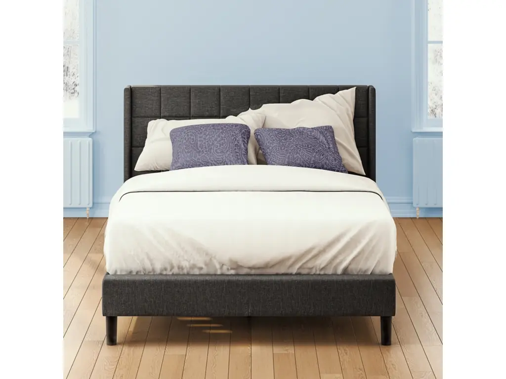 Create a sanctuary with fashionable style in your bedroom starting with the Gemmart black full bed in a black boucle fabric and plastic, black block feet. This transitional style upholstered bed is designed with a classic, button-tufted padded headboard where you can lean back for comfortable support. The sturdy construction of the low profile, solid engineered wood frame and wooden slats to support a standard full size box spring and mattress, not included. Easy to assemble with illustrated instructions included and all required parts and hardware are found inside the back of the headboard for convenience. Please note a box spring is required for additional support, not included. This bed is for the frame only. Customer assembly is required.