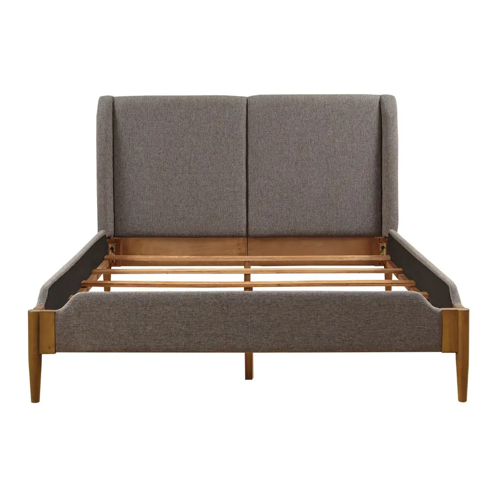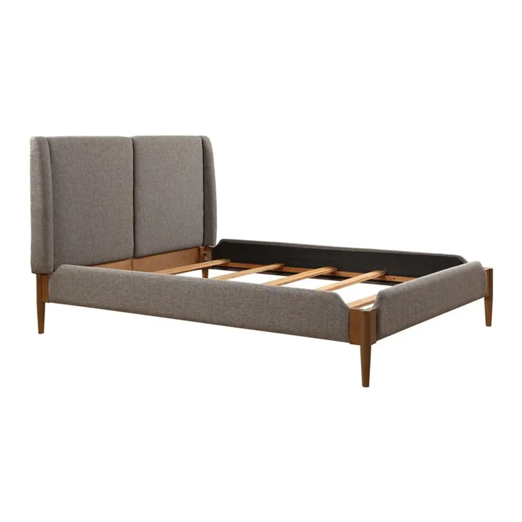 Featuring a wooden frame upholstered in versatile gray fabric, the Gladys mid-century queen bed features a classic wingback headboard, low footboard and side rails. A neutral complement for solid or patterned bedding in your favorite colors, this cozy queen-sized bed features rich walnut-finished tapered feet. Soft, inviting and distinguished, the tall wingback headboard will be the high-end focal point of your bedroom.