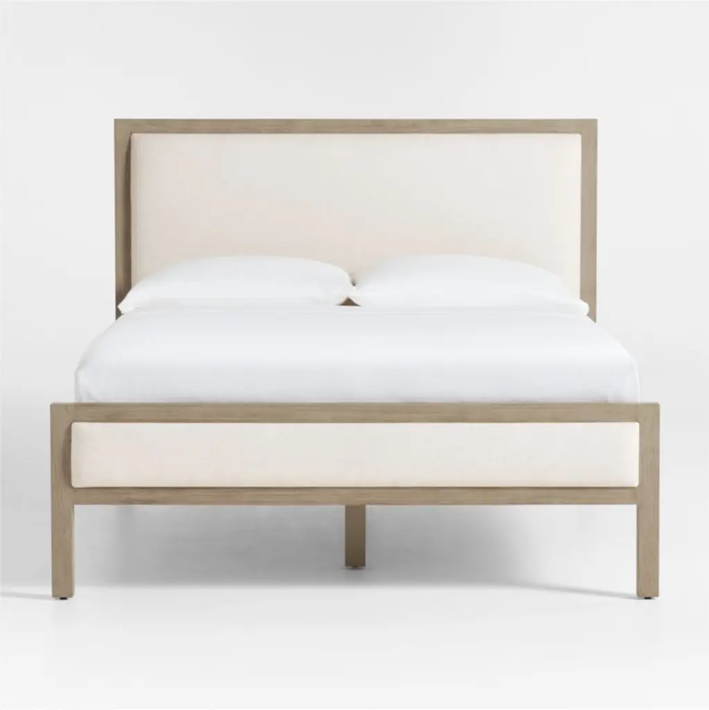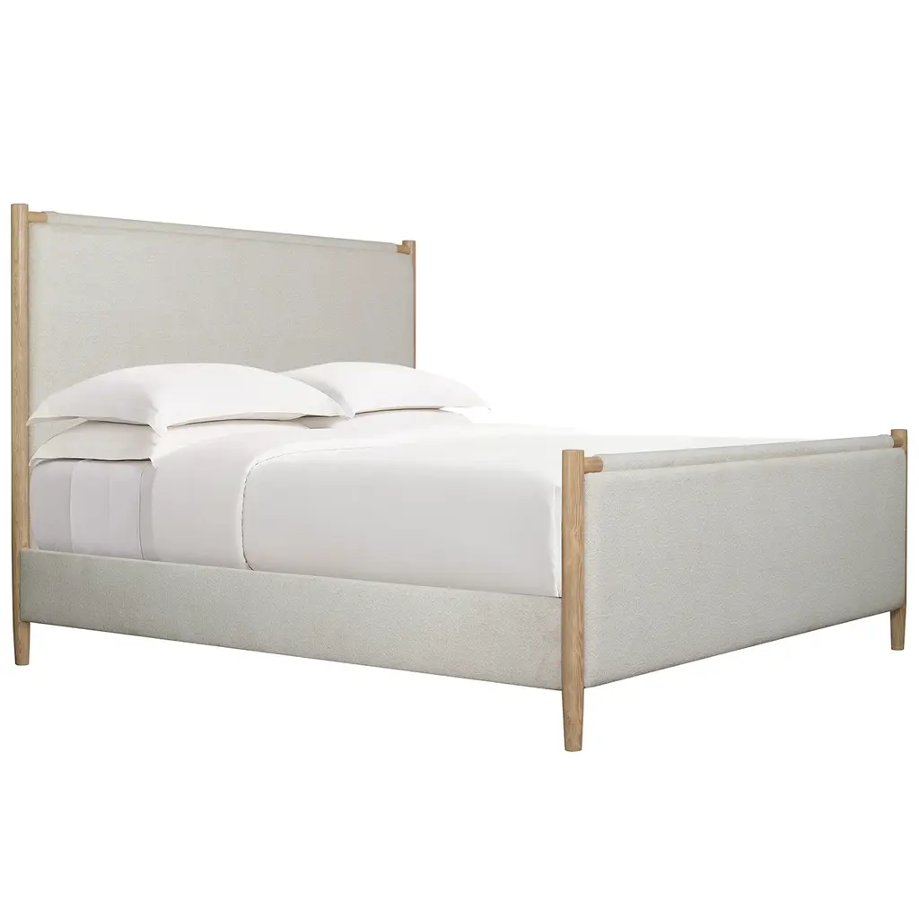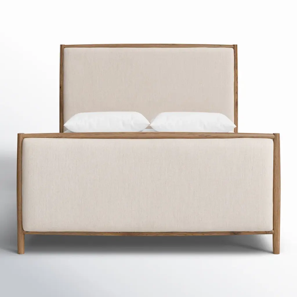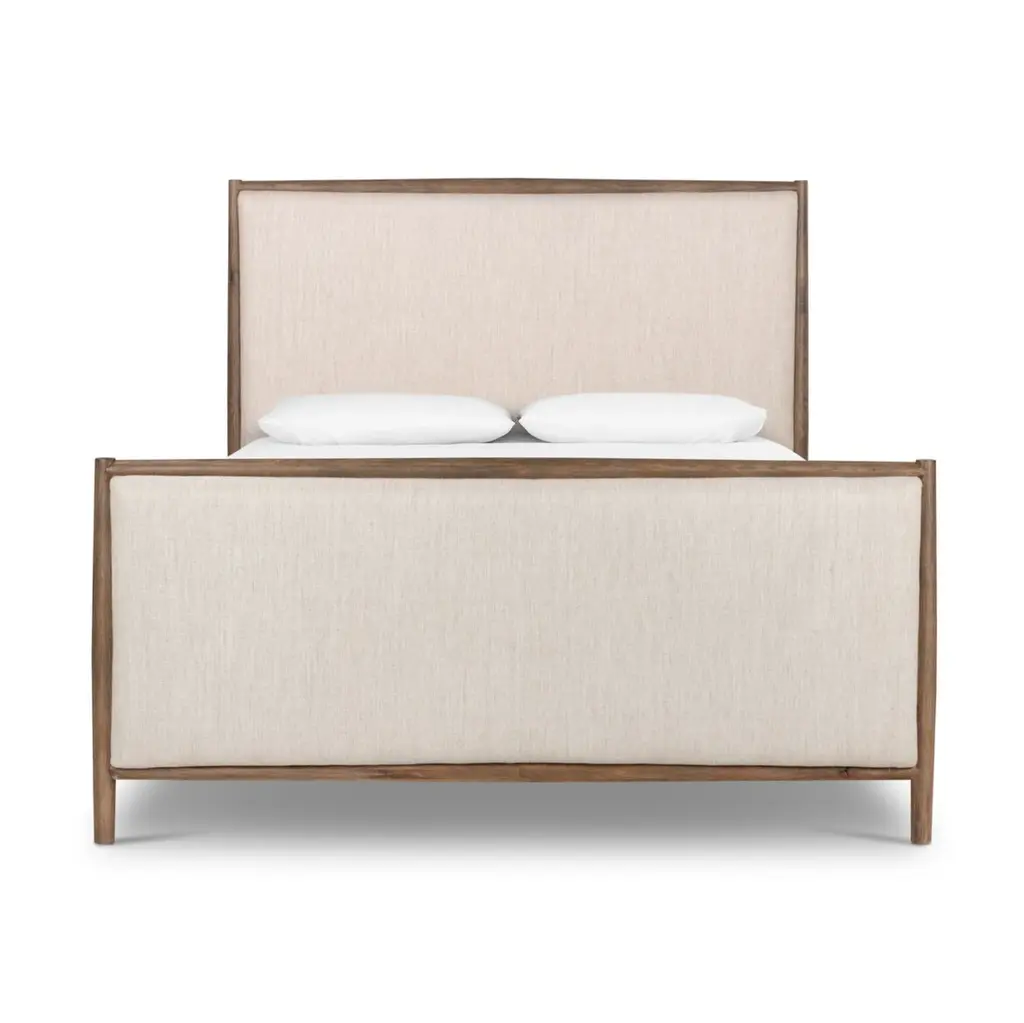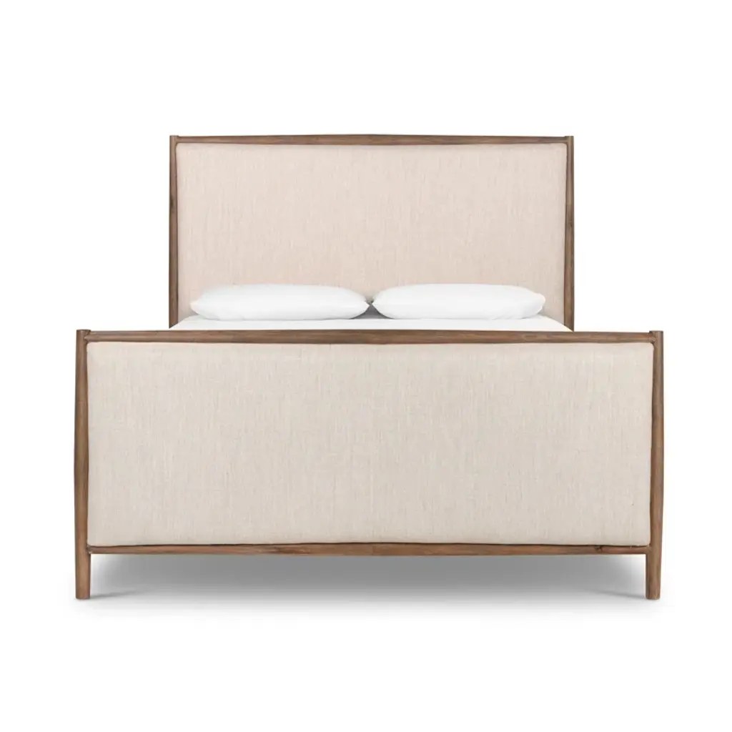 Weathered oak and light, linen-like upholstery fuse for a new take on traditional.