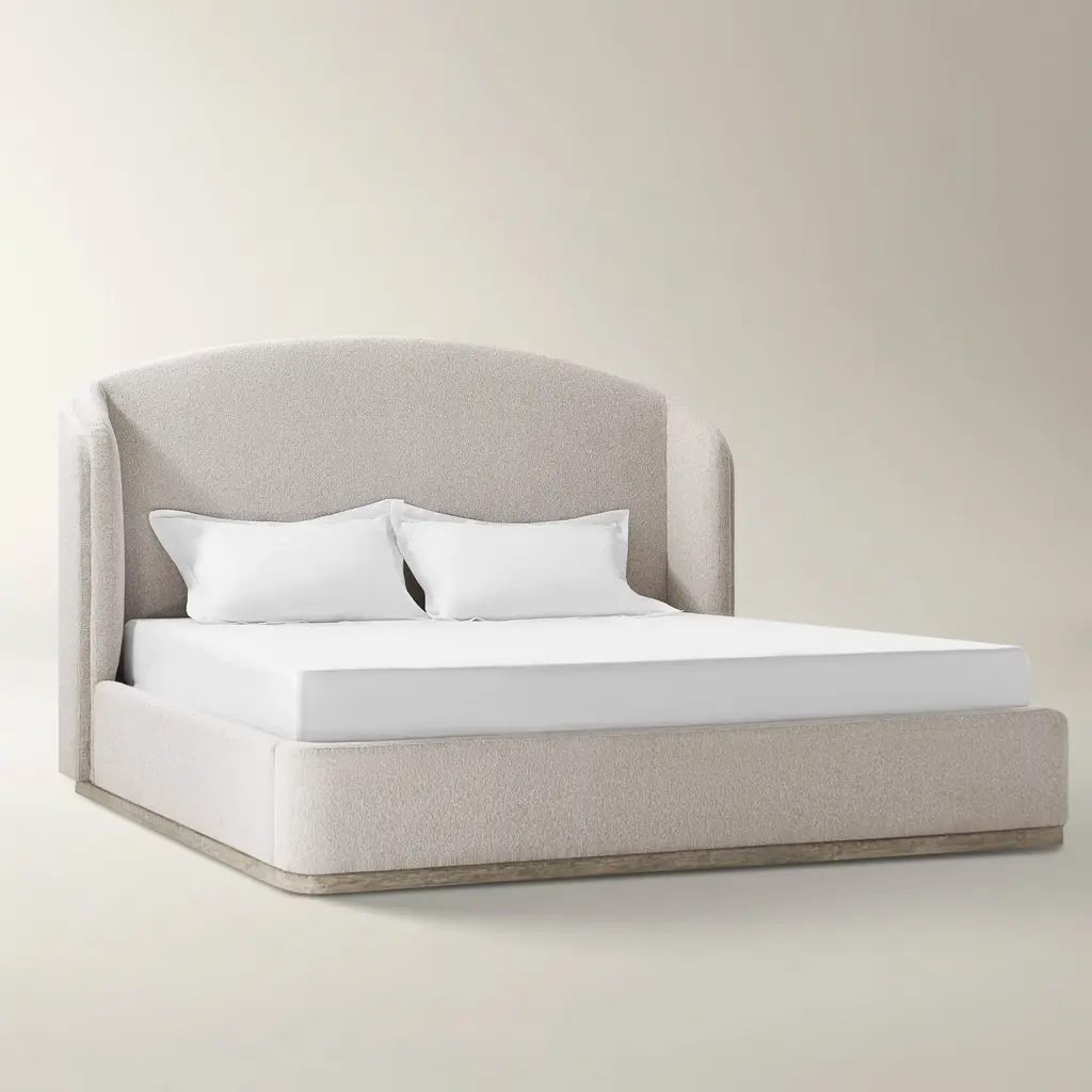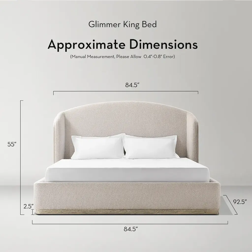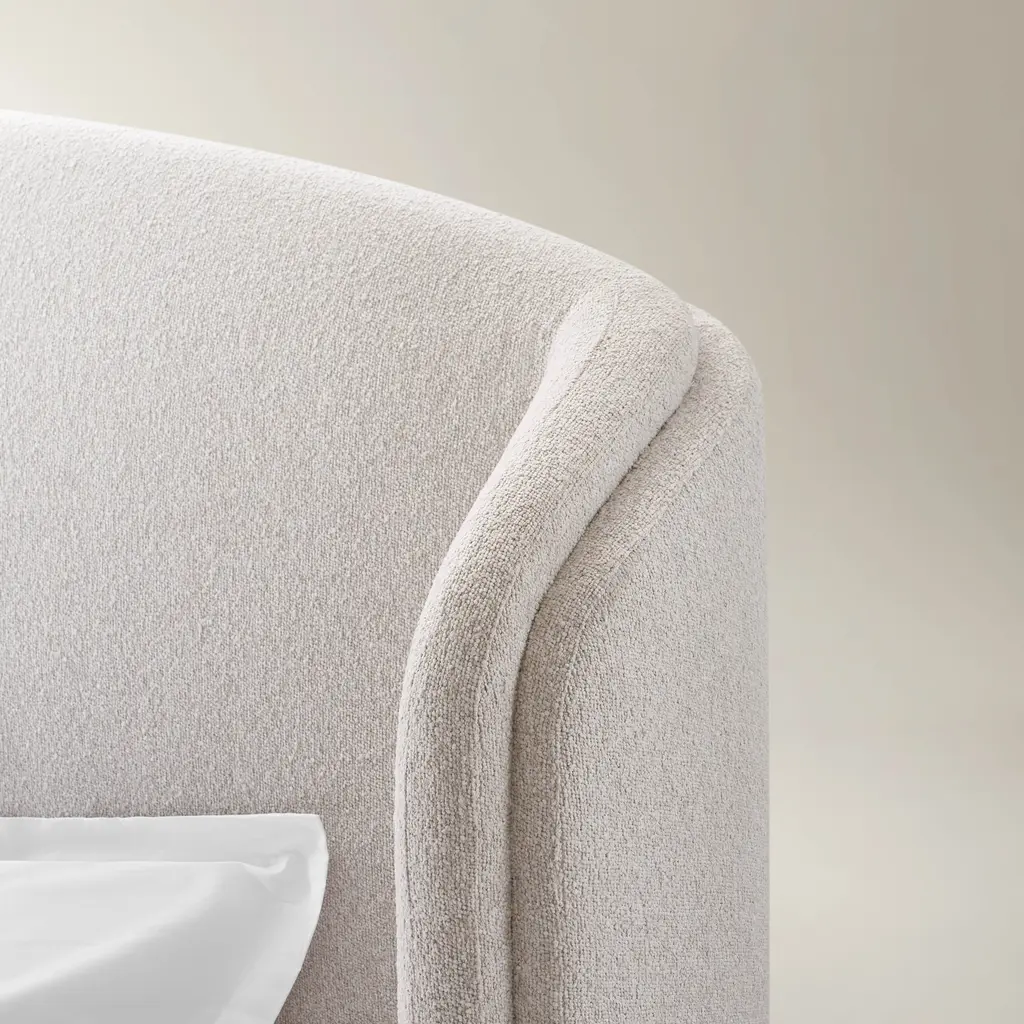 Transform your bedroom into a sanctuary with the Glimmer Bed. Upholstered in plush boucle fabric in soft beige or grey, this bed features a gracefully curved headboard with hand-crafted double-layered detailing. A solid rubberwood base ensures sturdy support, while high-density foam promises unparalleled comfort. The Glimmer Bed is the epitome of relaxation and refined style.ZG Exclusive