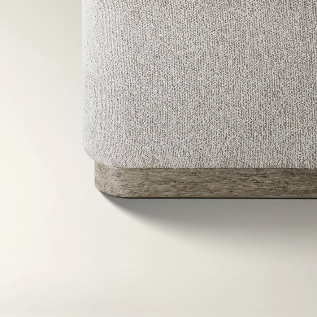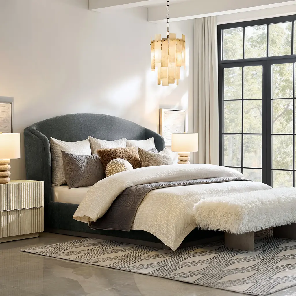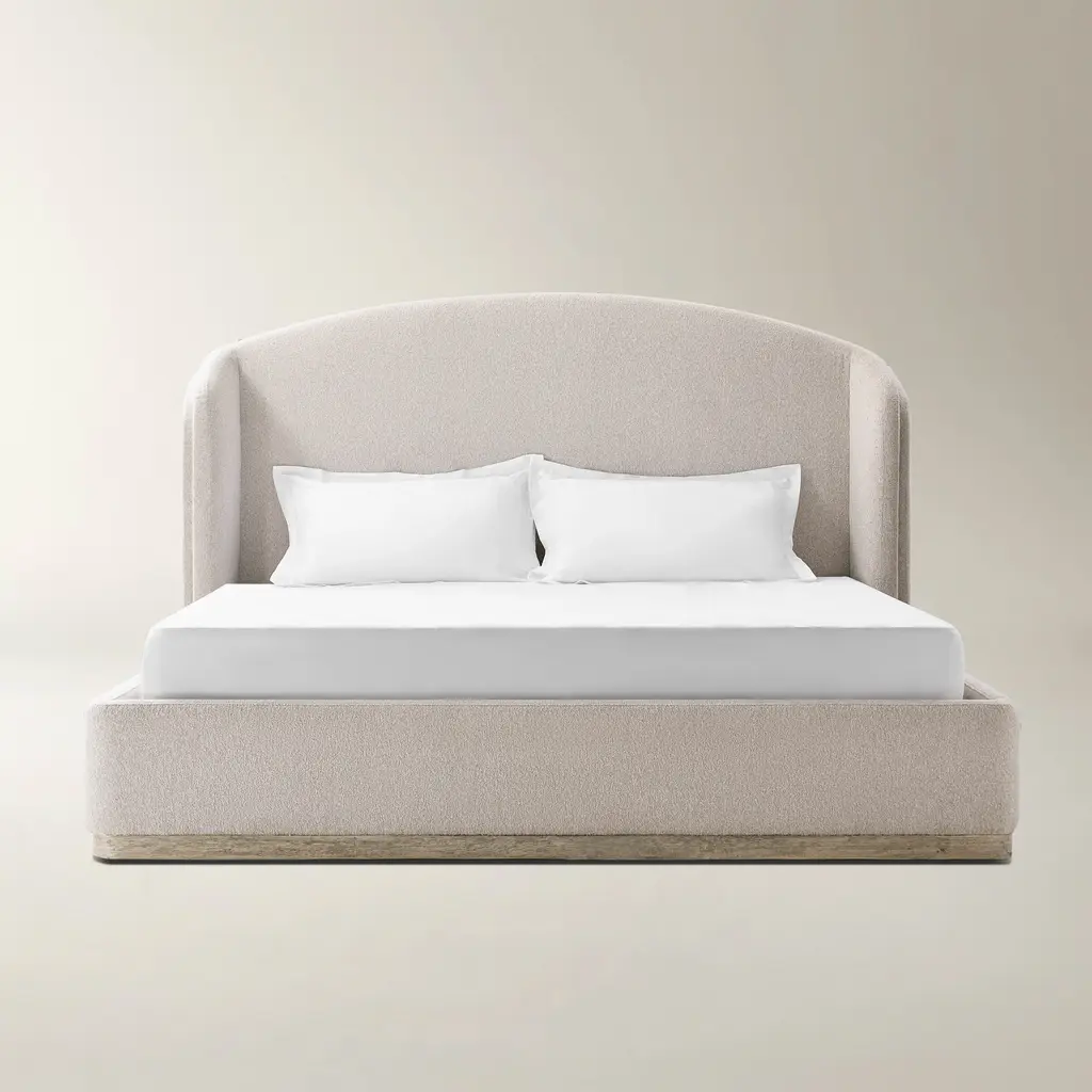 Transform your bedroom into a sanctuary with the Glimmer Bed. Upholstered in plush boucle fabric in soft beige or grey, this bed features a gracefully curved headboard with hand-crafted double-layered detailing. A solid rubberwood base ensures sturdy support, while high-density foam promises unparalleled comfort. The Glimmer Bed is the epitome of relaxation and refined style.ZG Exclusive