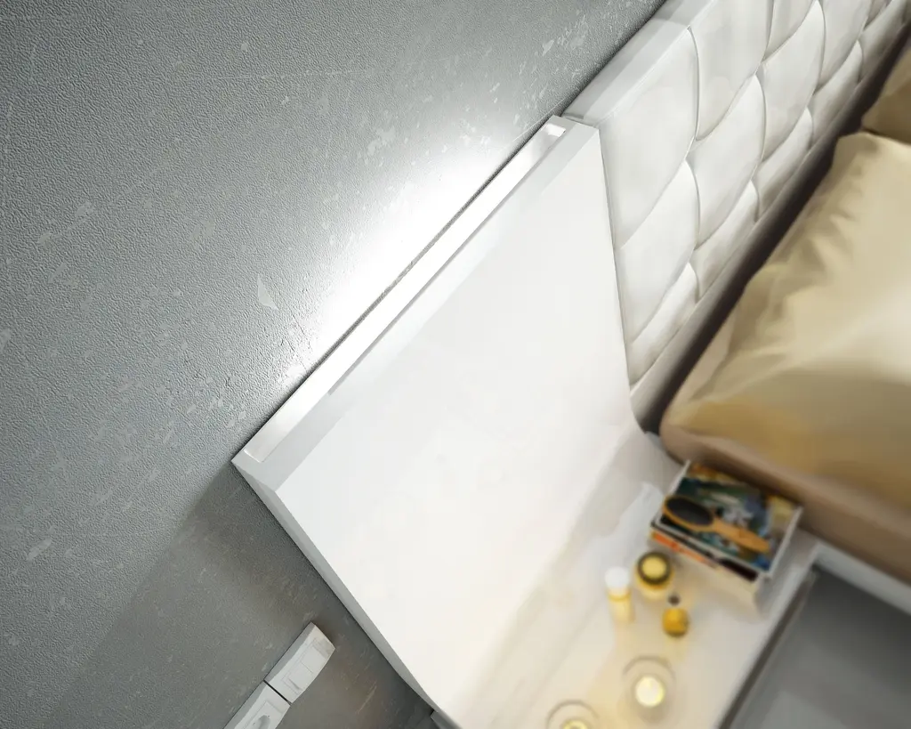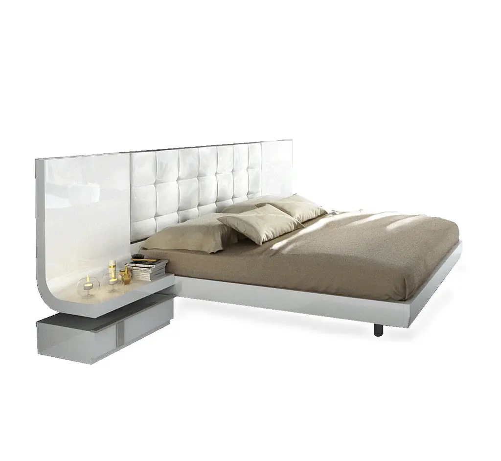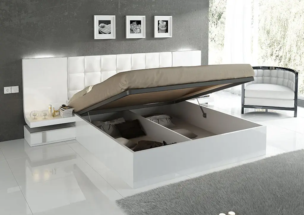 A sleek and modern addition to your bedroom environment is the Granada Bed. With its white high gloss finish and painstaking attention to detail, this upscale furniture piece radiates modern elegance. The Granada Bed can be customized to fit your needs, coming in King and Queen sizes with or without storage options. Because it is made of sturdy wood and wood components, this bed will last for many years. After a hard day, the headboard's cushioned panel provides a touch of sophistication and comfort, making it the ideal place to recline and relax. Convenient built-in lighting is included with the bed, offering soft illumination for late-night reading or setting a warm mood in your bedroom. In addition to improving the space's aesthetic appeal, the high gloss white coating makes upkeep simple and effortless, enabling you to maintain immaculate conditions in your area. The Granada Bed will transform your sleeping space and offer the ideal balance of comfort, style, and utility.