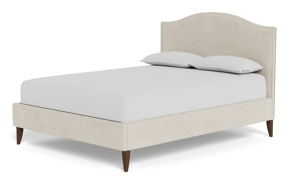 Our king Griffin bed features shaped wood legs, clean lines, and a gently curved headboard, lending a casual, comfortable feel to any bedroom. The fully upholstered frame offers a soft, cozy backdrop for restful evenings and slow mornings in bed.