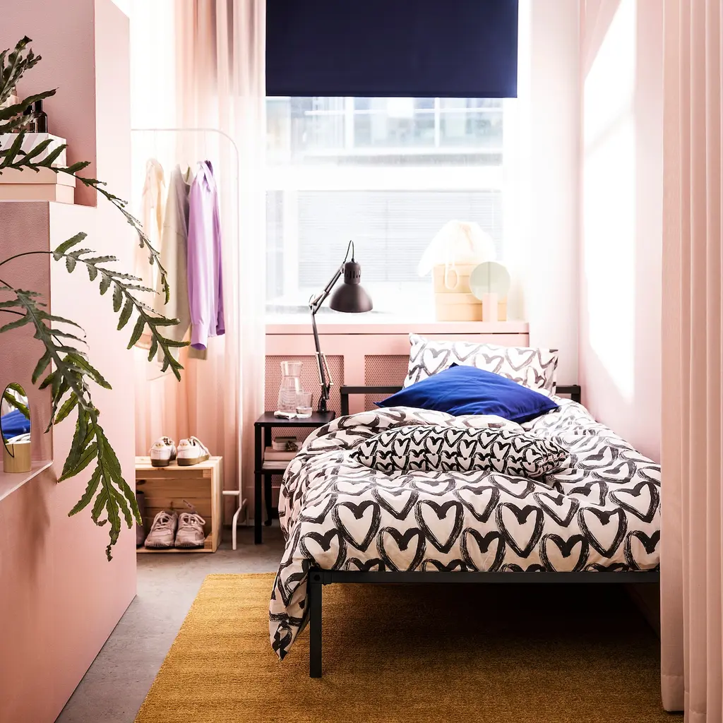 GRIMSBU Bed frame - gray/Luröy Twin. The compact design is perfect for tight spaces or under low ceilings, so you can make the most of your available space. The powder-coated steel frame is strong, sturdy and easy to maintain. Assembles in a few easy steps. May be combined with KNARREVIK nightstand.