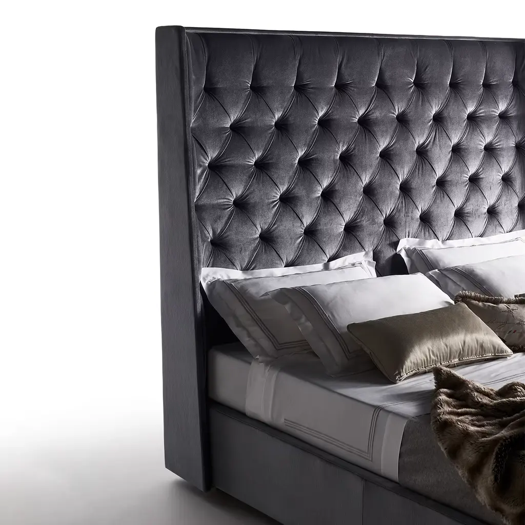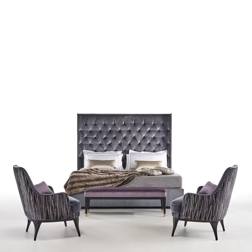 Brimming with sartorial elegance, this double bed cleverly combines rigorous profiles with a luxurious artisan design. Fine purple-toned velvet envelops the entire structure, crafted of solid wood and padded with polyuretahne foam. Distinguishing element is the towering angled headrest, which seduces with its minute tufted texture. Bedframe is included, while mattress and linen are not included. Please explore available customization options with the Concierge.